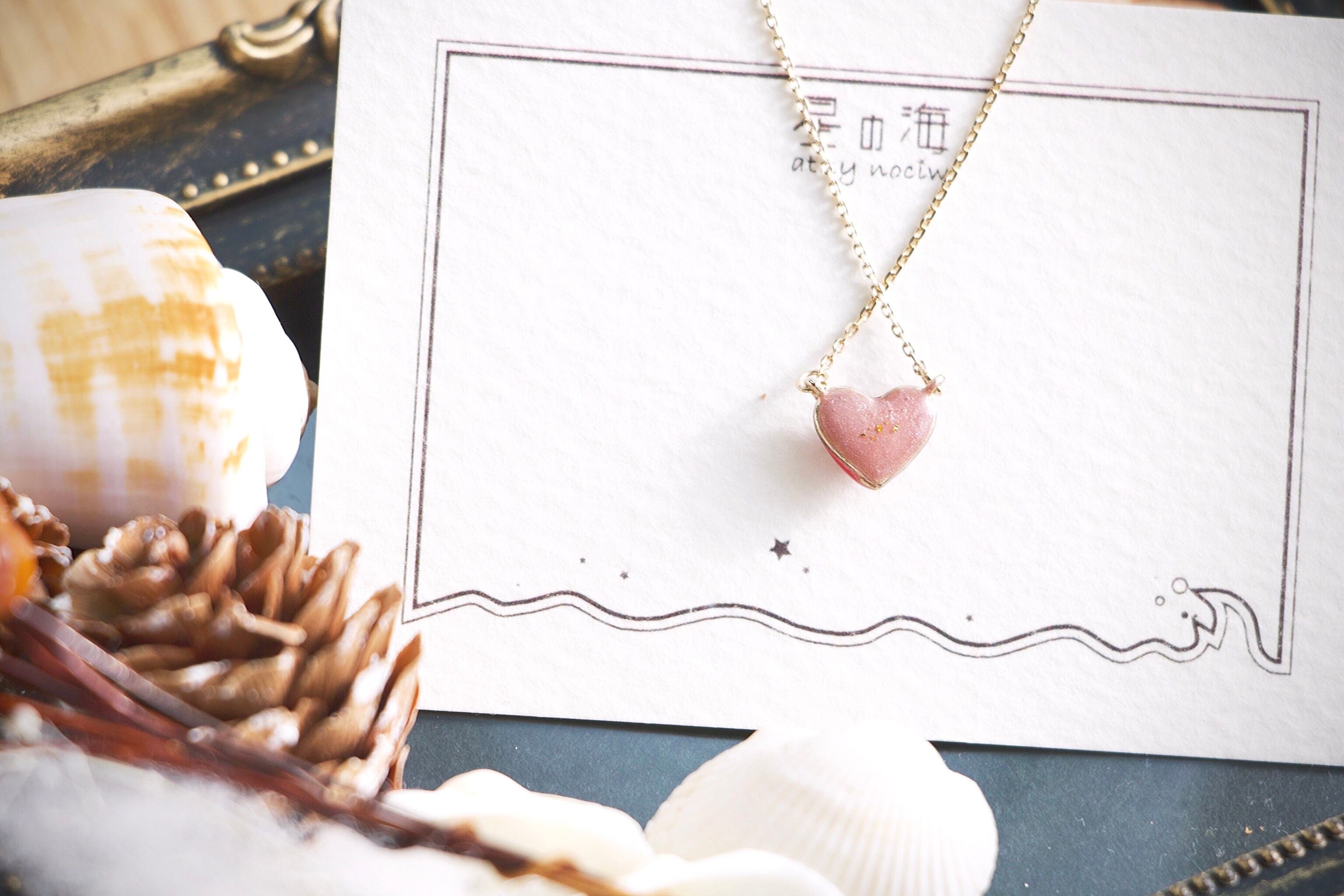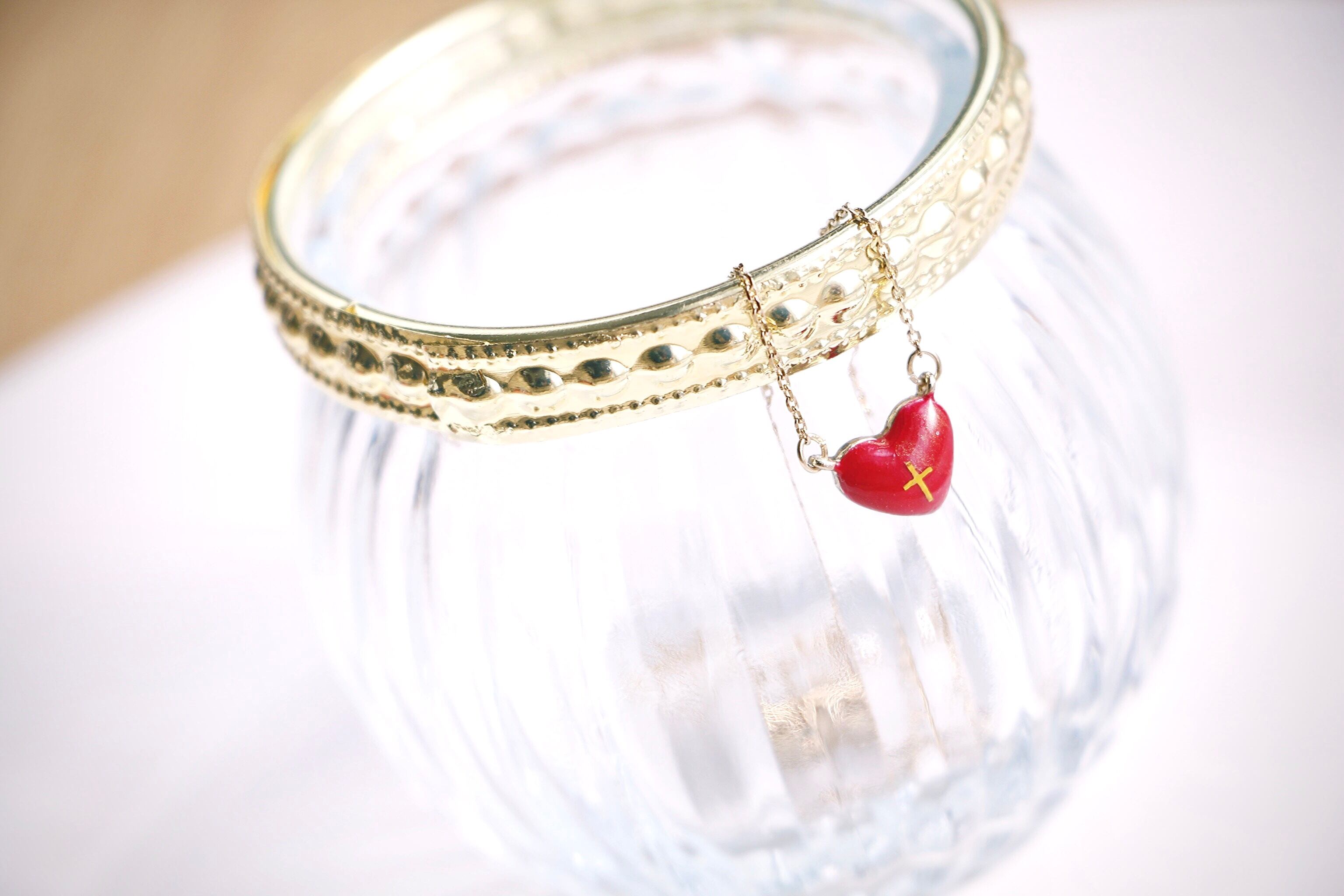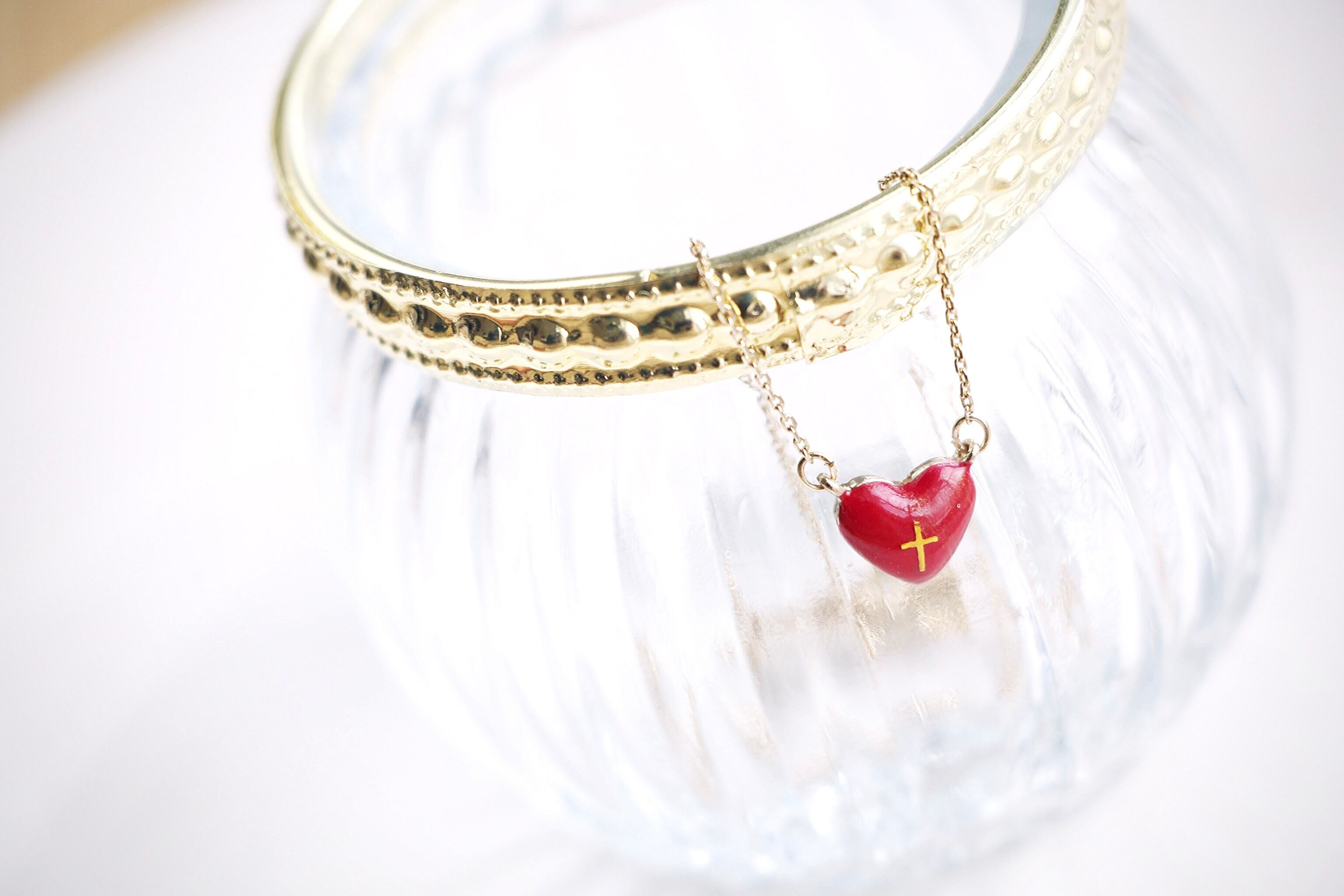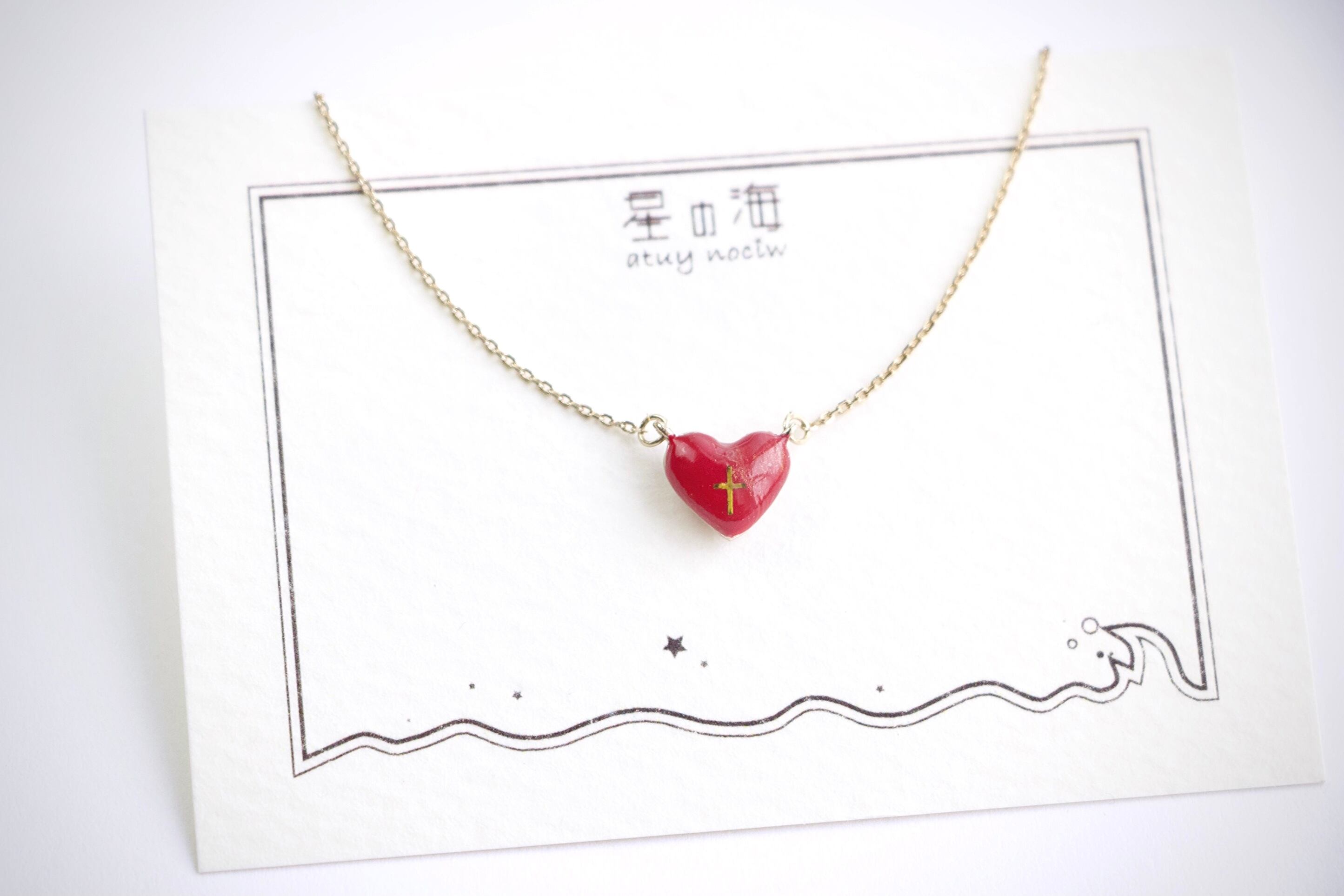トップのハートは表裏どちらでもお使いいただけるリバーシブルデザイン。表面はさまざまな赤色を重ねて着色し、その上に細い十字架を飾って金色のラメをほんの少し散らしています。いろんな角度からじっくり見てみると中にある赤色が見えてくる深みのある作品です…