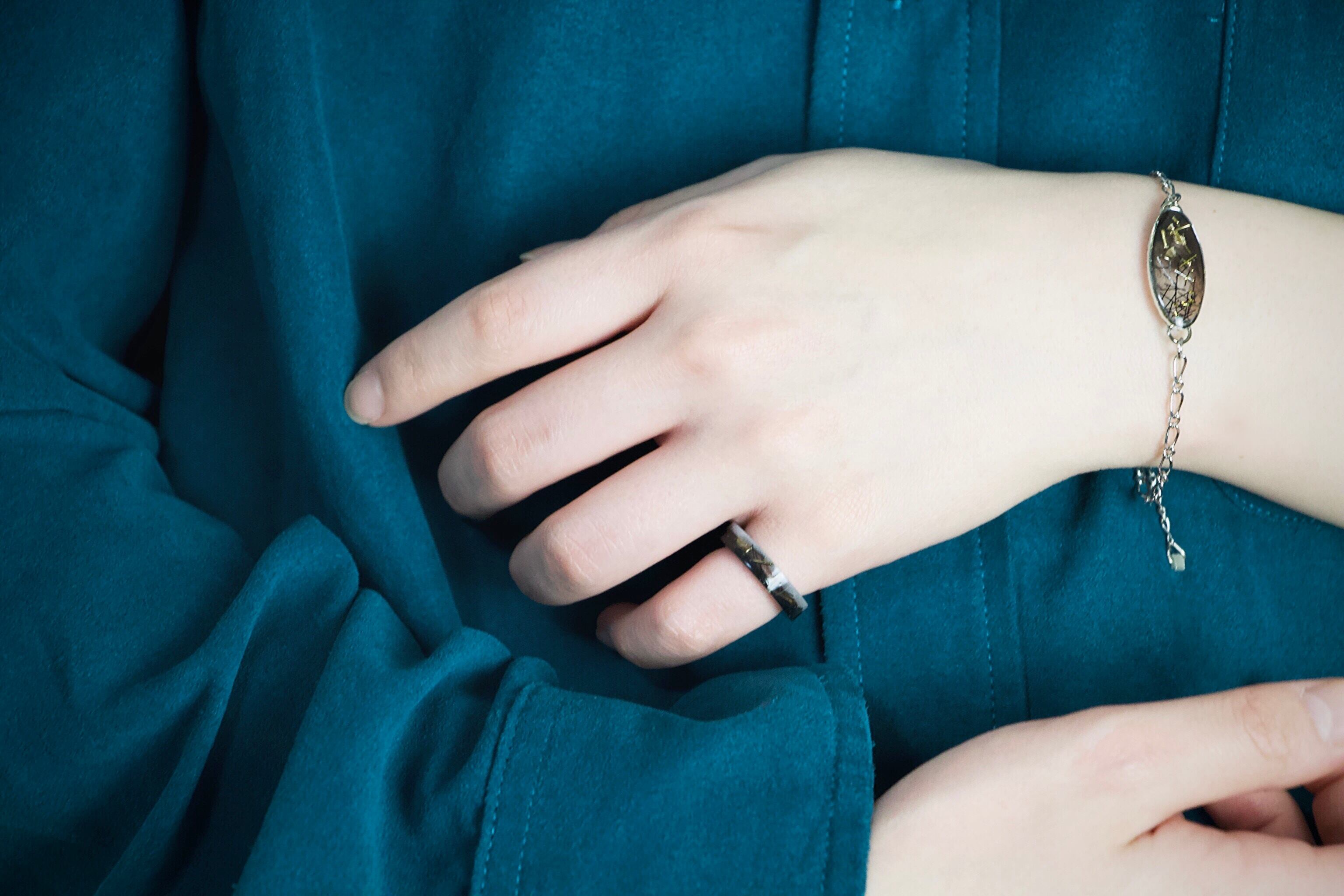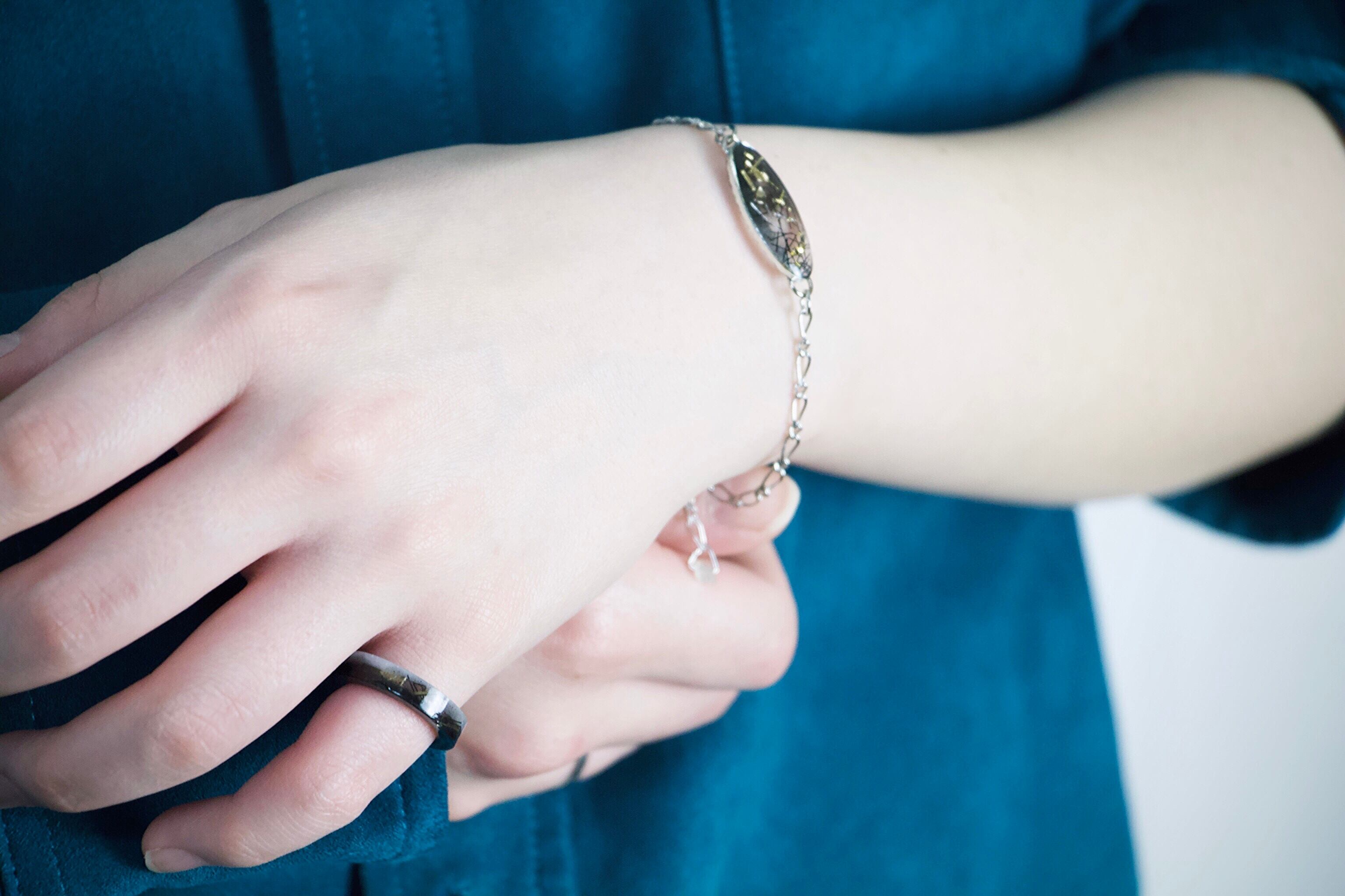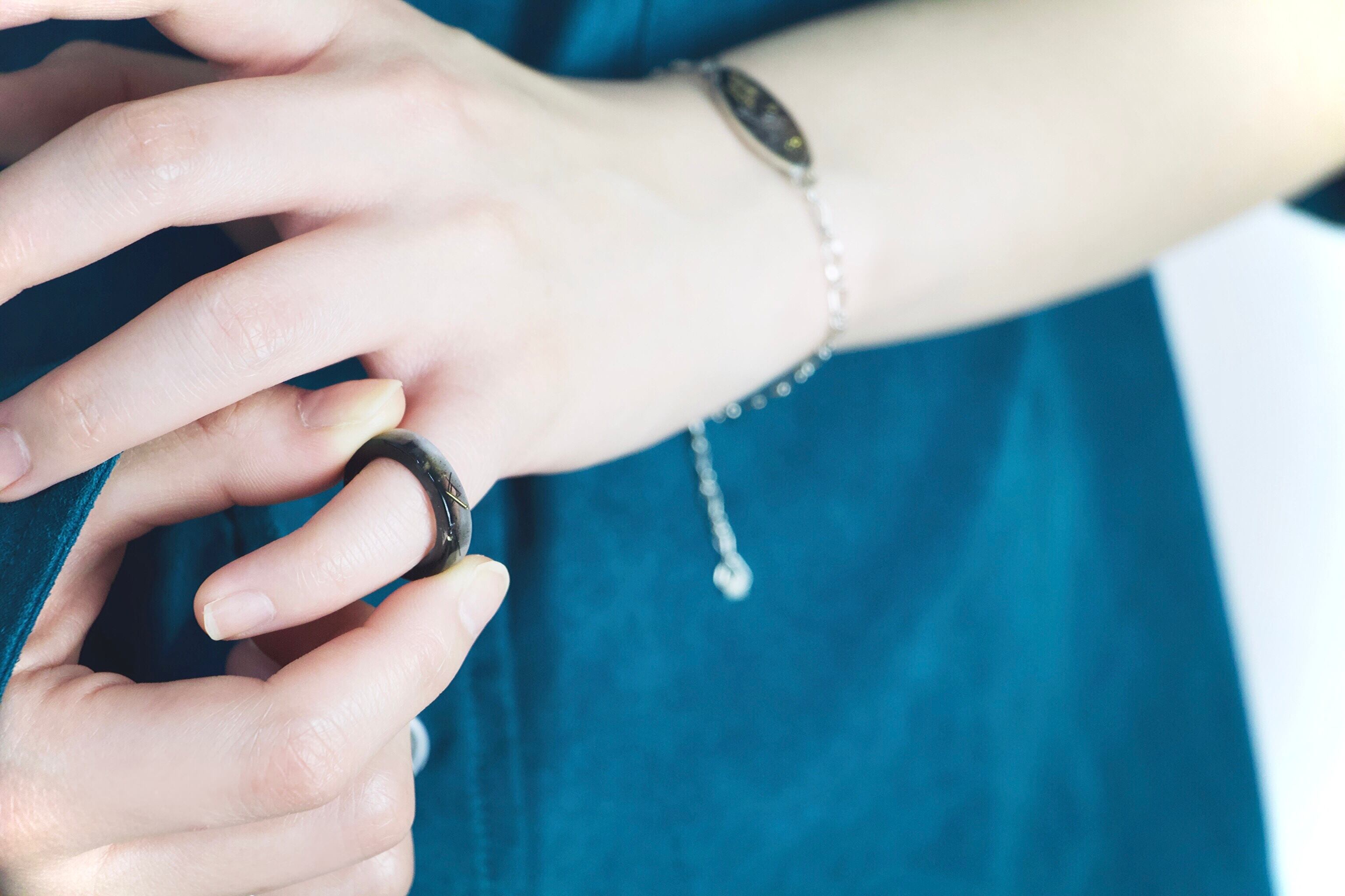 着画のように、同シリーズのブレスレットとの相性はもちろん、イヤーアクセサリーとの着け合わせも良いですよ!また、宇宙系と合わせるとキリッとした雰囲気になります。