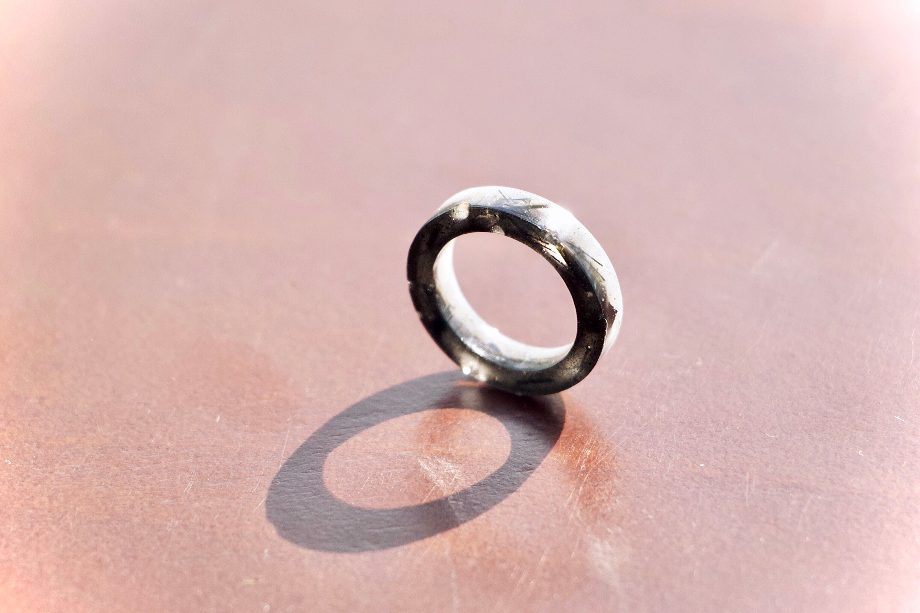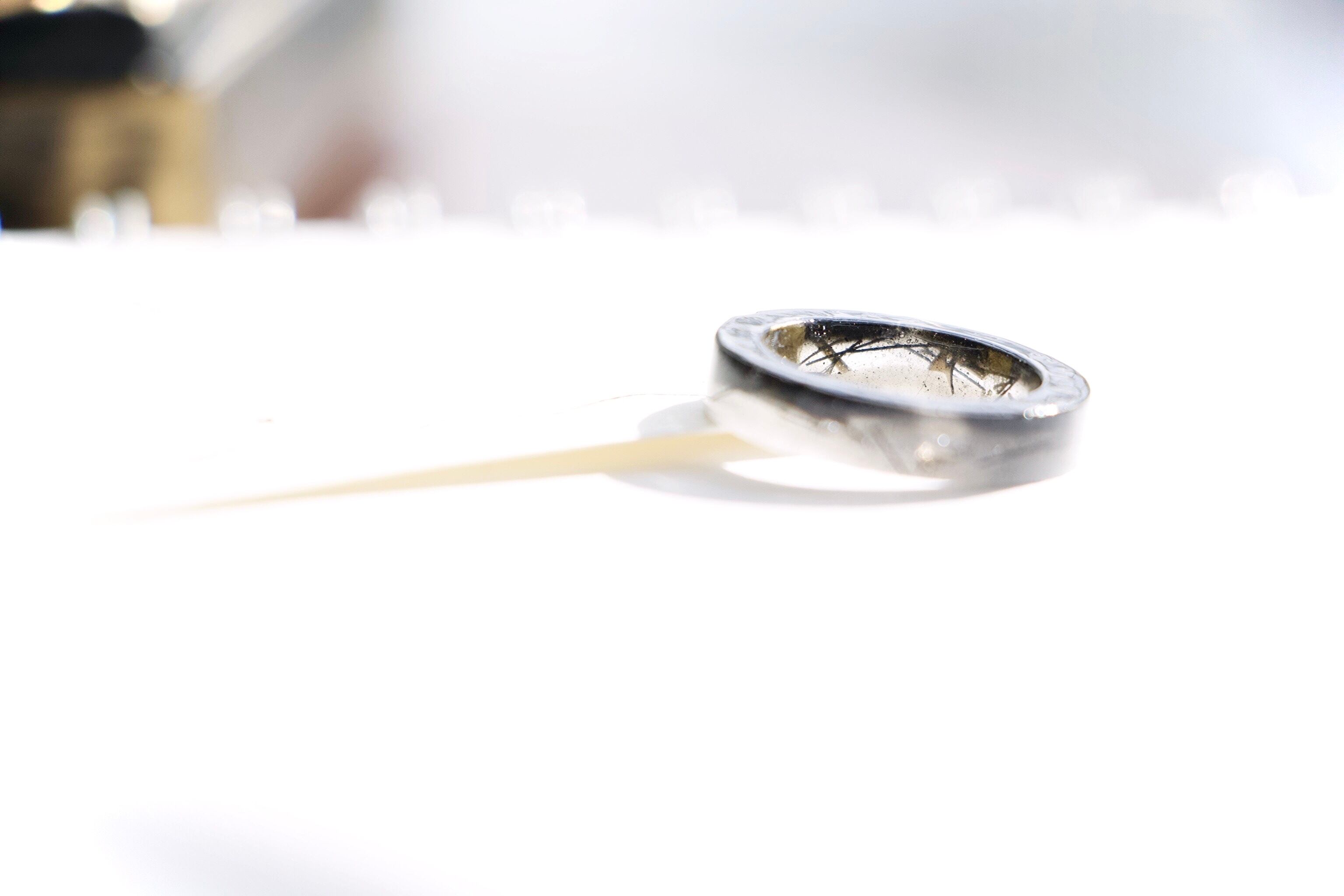 パキッとした角ありのリングの中には黒いヤーン(糸)とゴールド端パーツを詰め込み、下側をホワイト、上側をブラックで閉じ込めました。