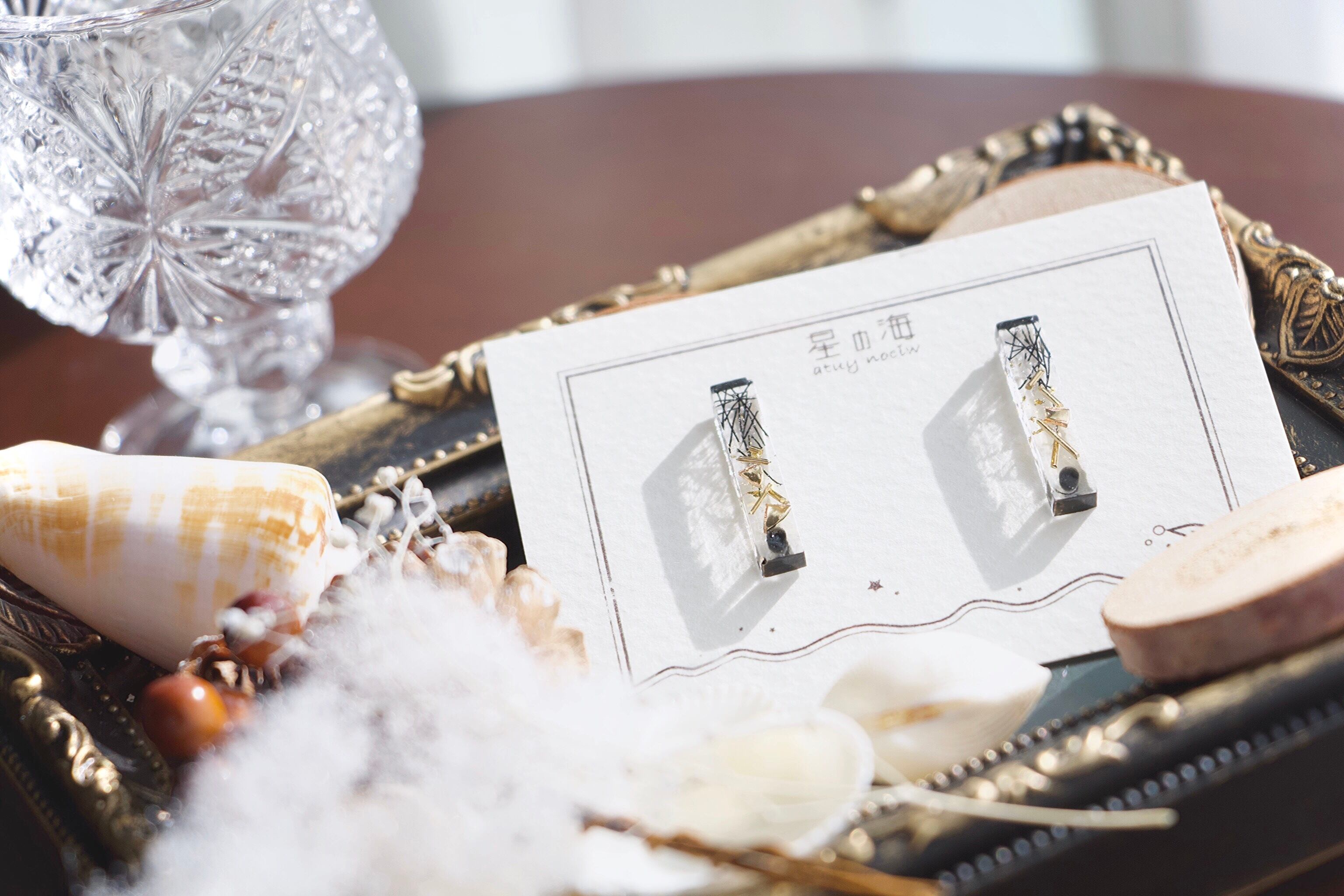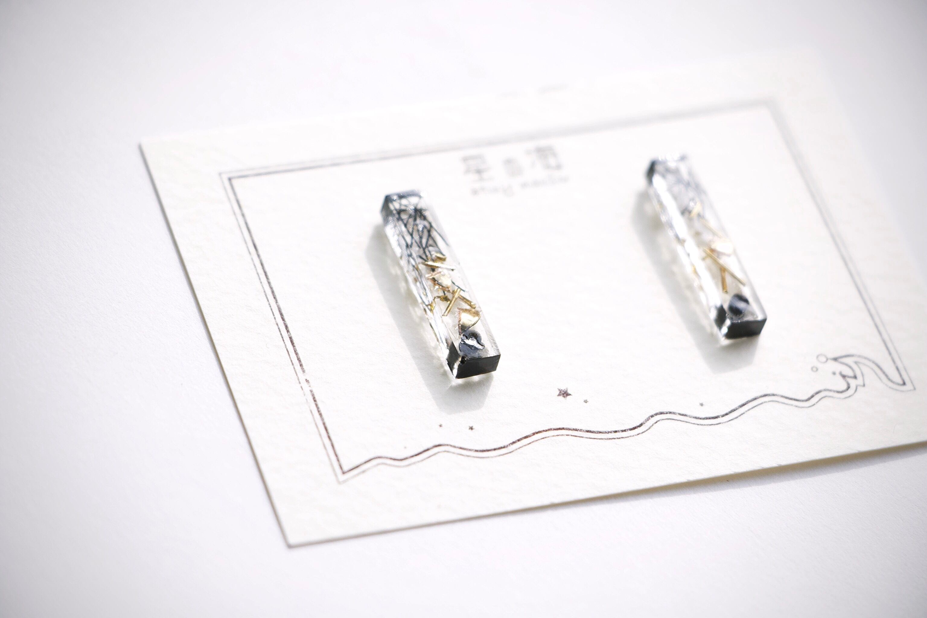四角い棒型のレジンの中に、上から降ってくるような黒いヤーン(糸)とゴールドの端パーツを詰め込みました。パラパラと舞う金箔が良いアクセントになっています。