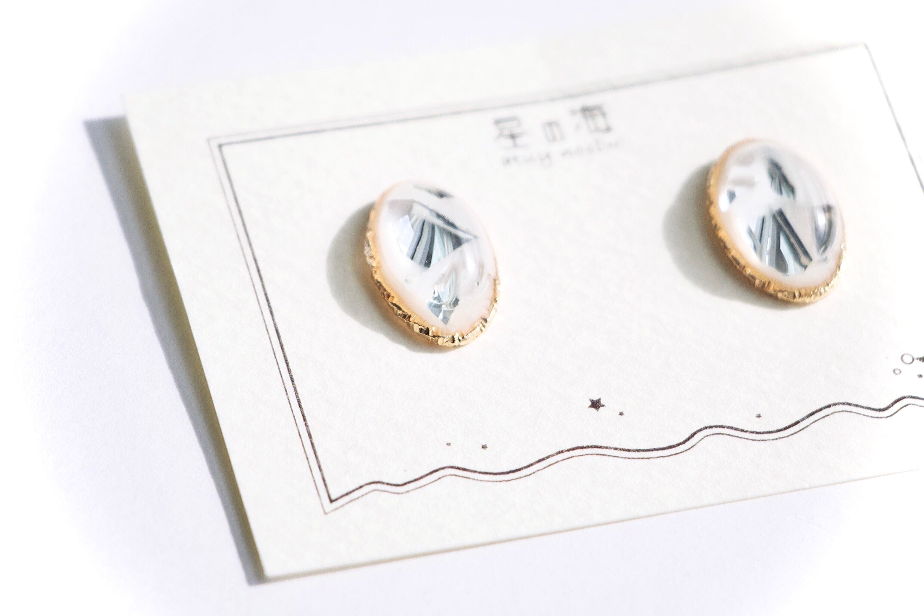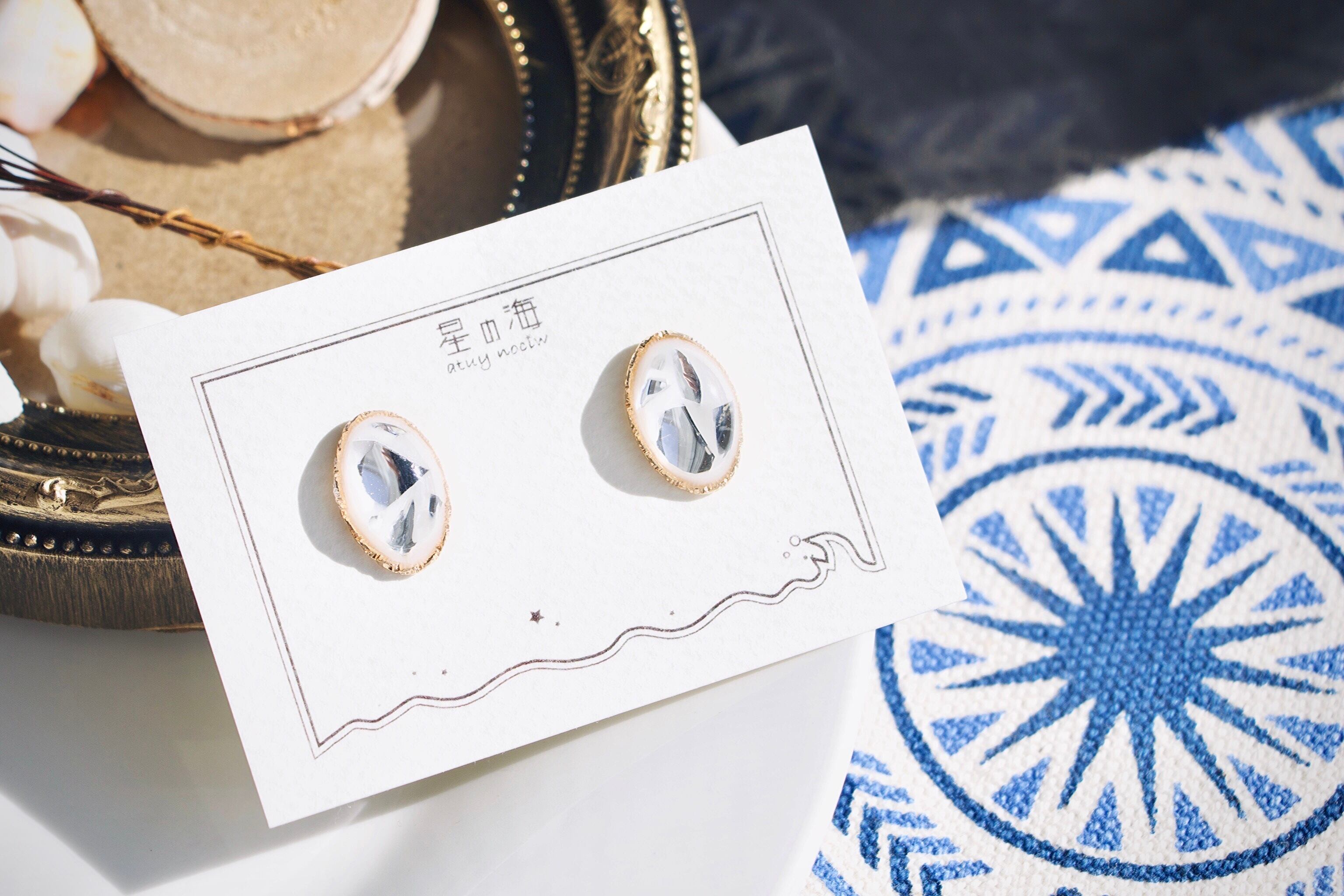 オーバルのピンクゴールド枠には白いレジンを敷き、砕き割った鏡をぎゅうぎゅうに詰め込んでいます。