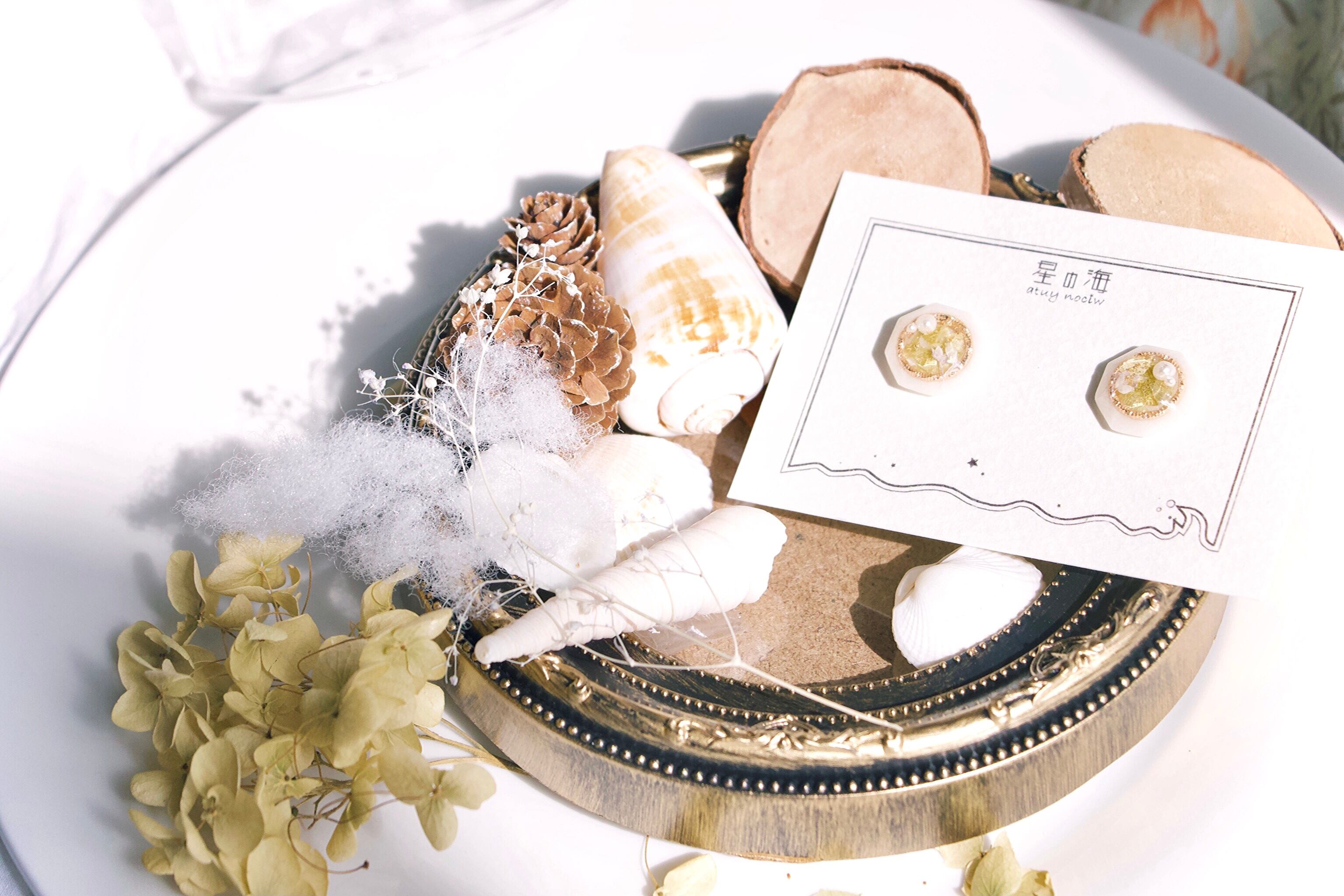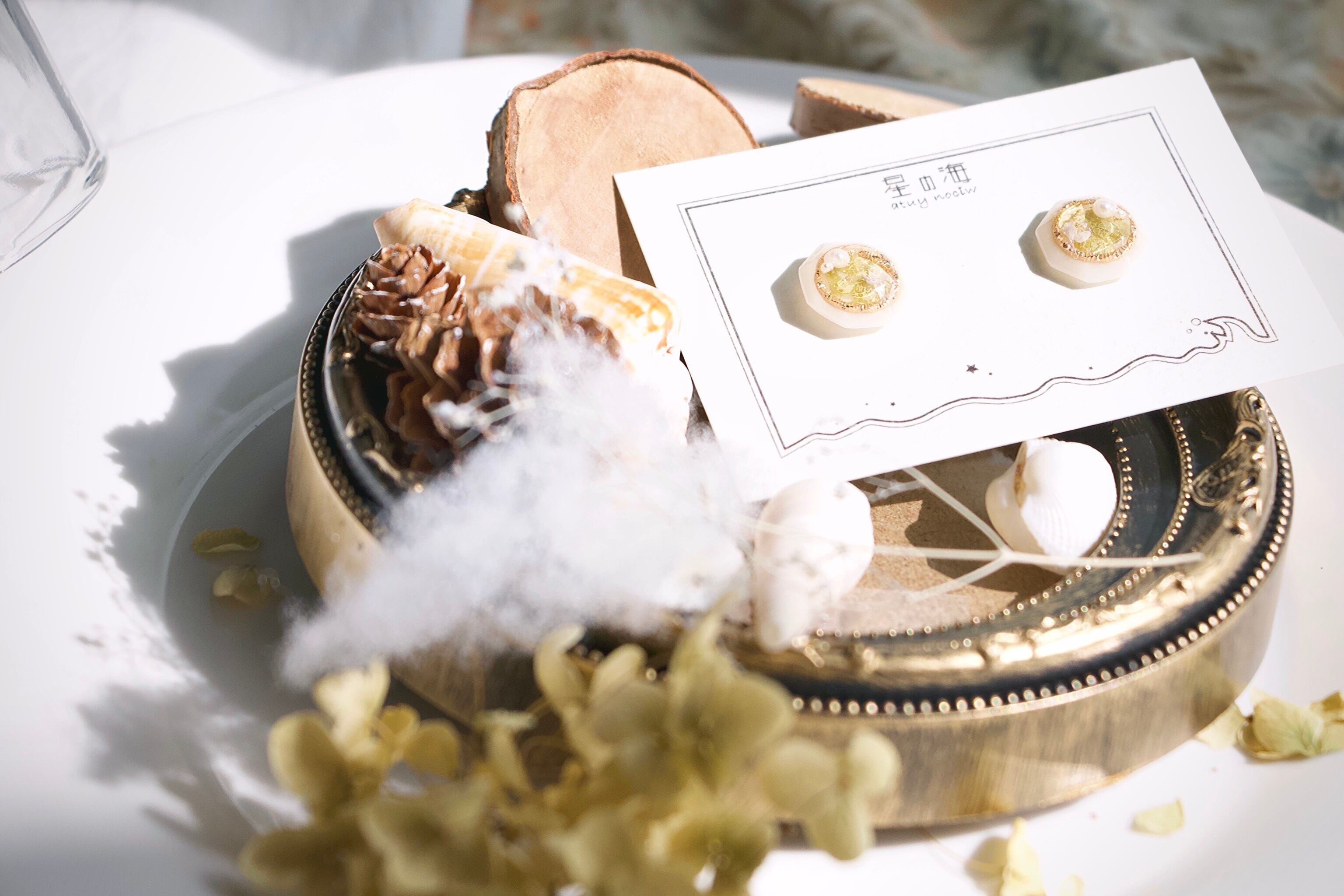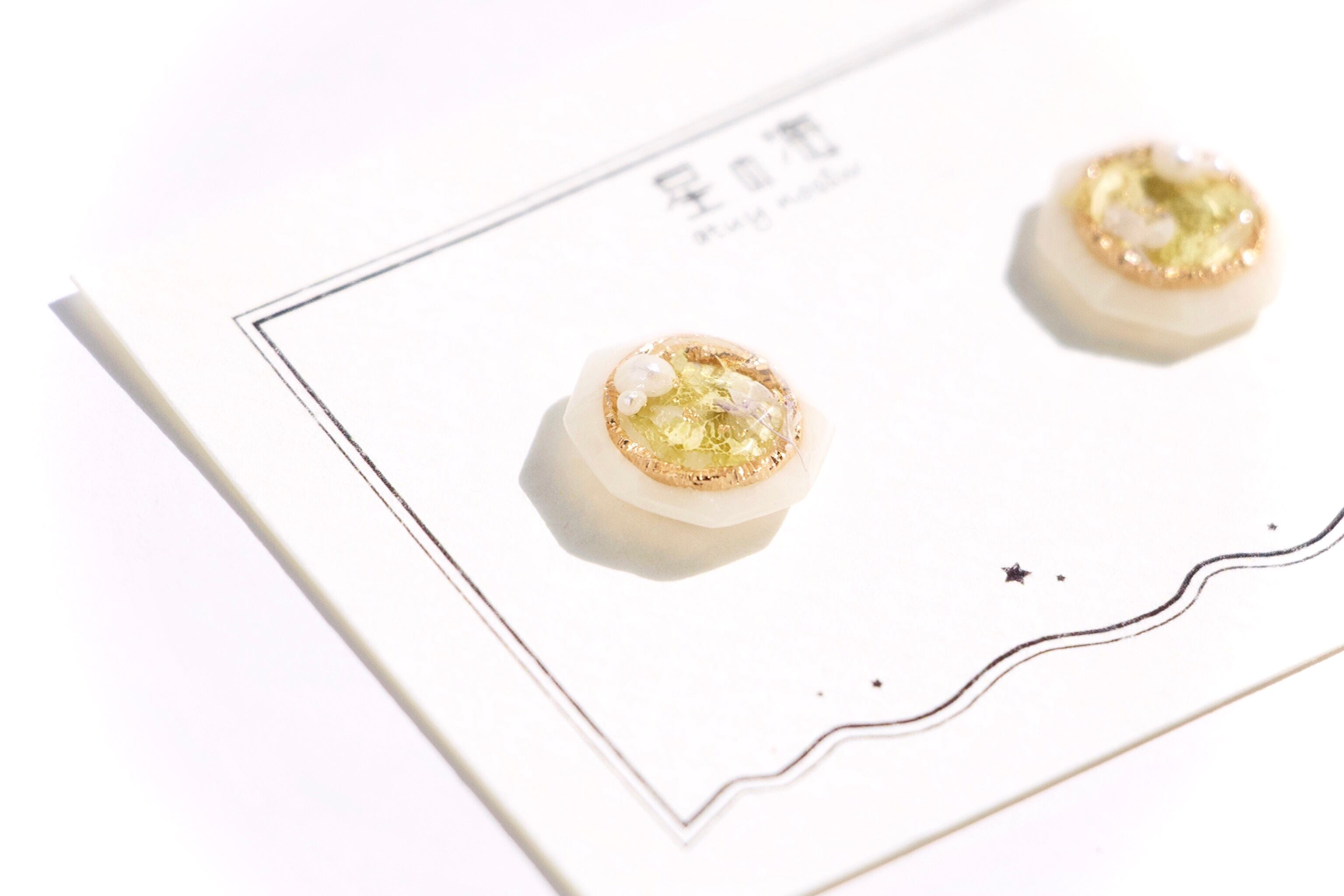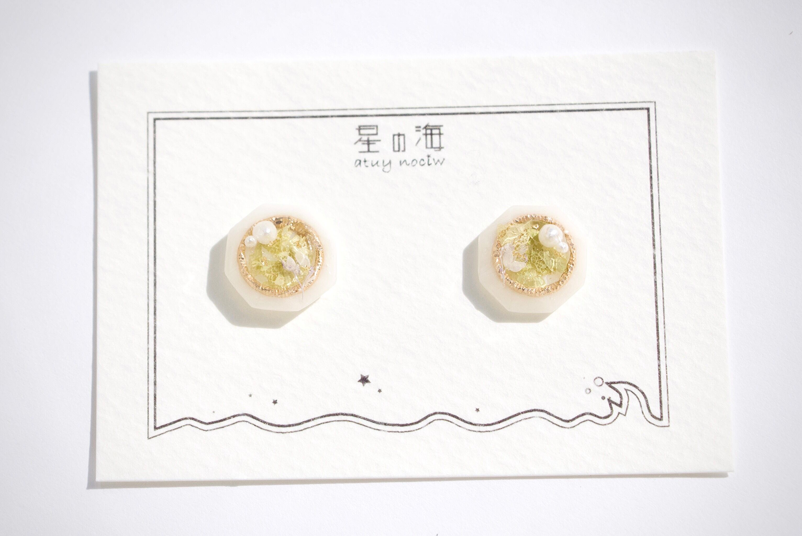 八角形の型にあたたかみのあるクリーム色を底に流し、ピンクゴールドのデザイン丸枠を沈めています。その中にくすみ黄緑の紫陽花ドライフラワーを敷き詰め、薄青紫のかすみ草の蕾を一輪ずつあしらっています。