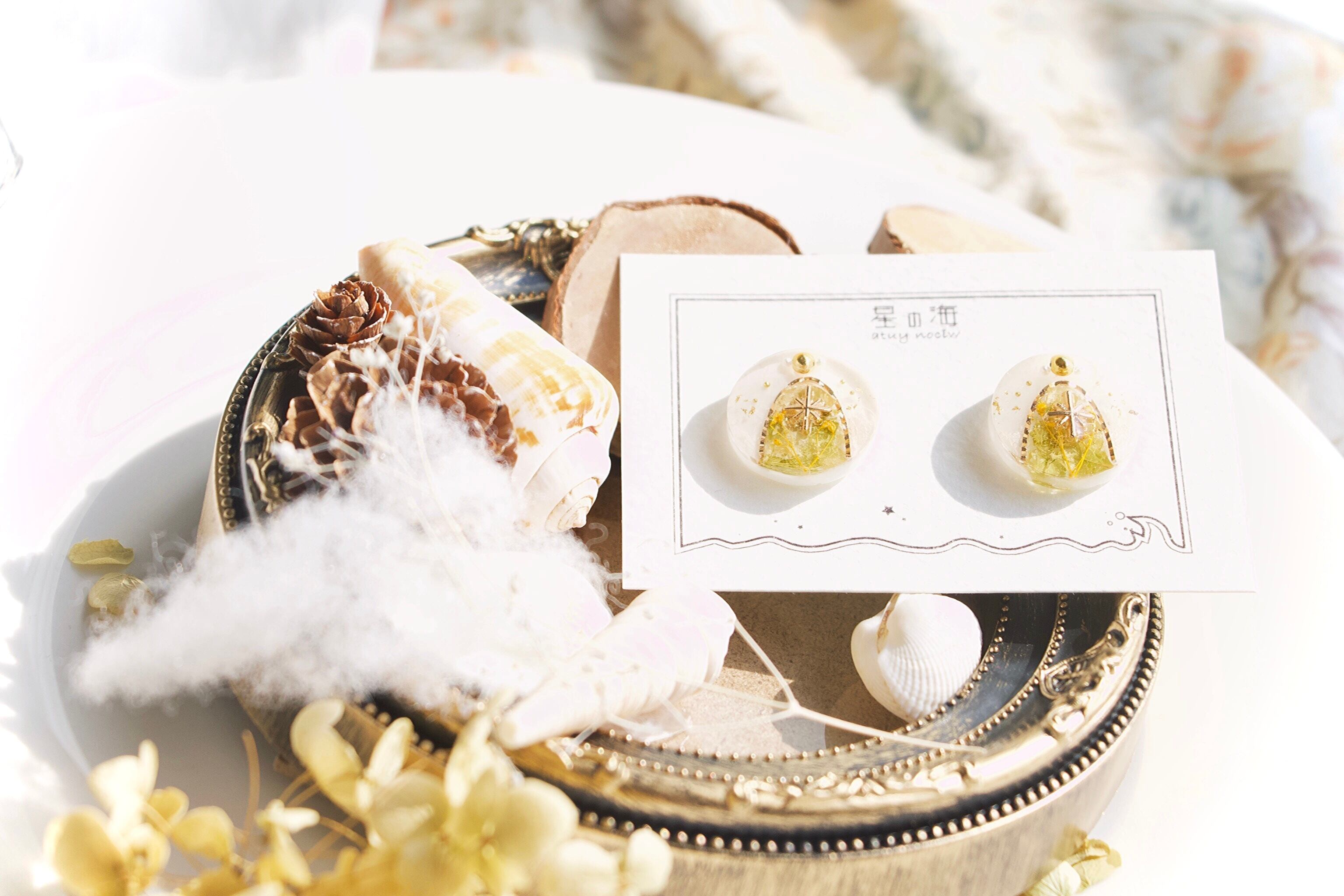 丸型の底には白とクリアをマーブル状に流し、ピンクゴールドの扉のようなパーツを沈めています。その中にはくすみ緑の紫陽花ドライフラワーを敷き詰め、オレンジのかすみ草の蕾と光のようなゴールドパーツを中心にあしらっています。外側は下からレースのような白い紫陽花の花びらを敷き詰めています♡