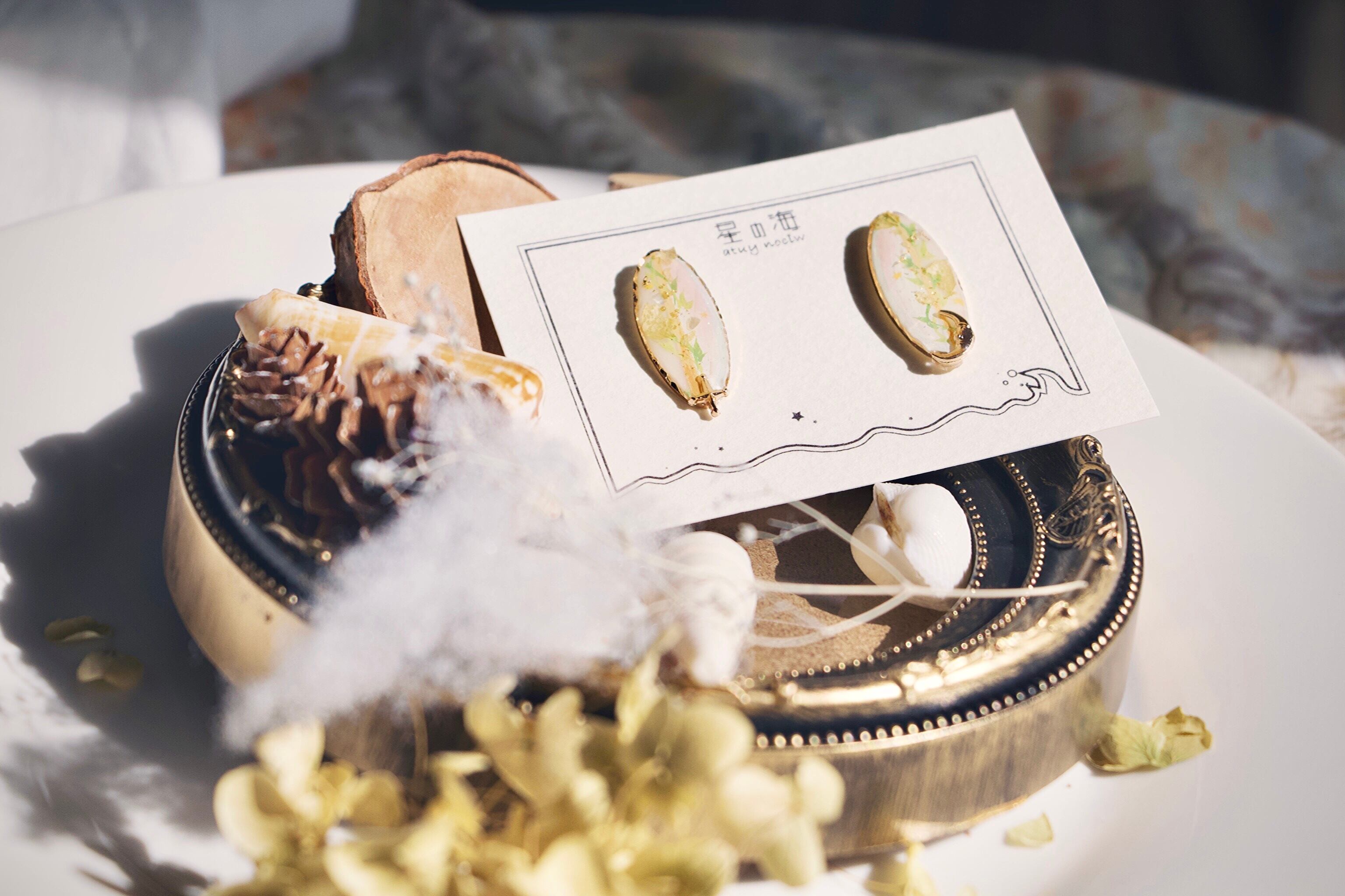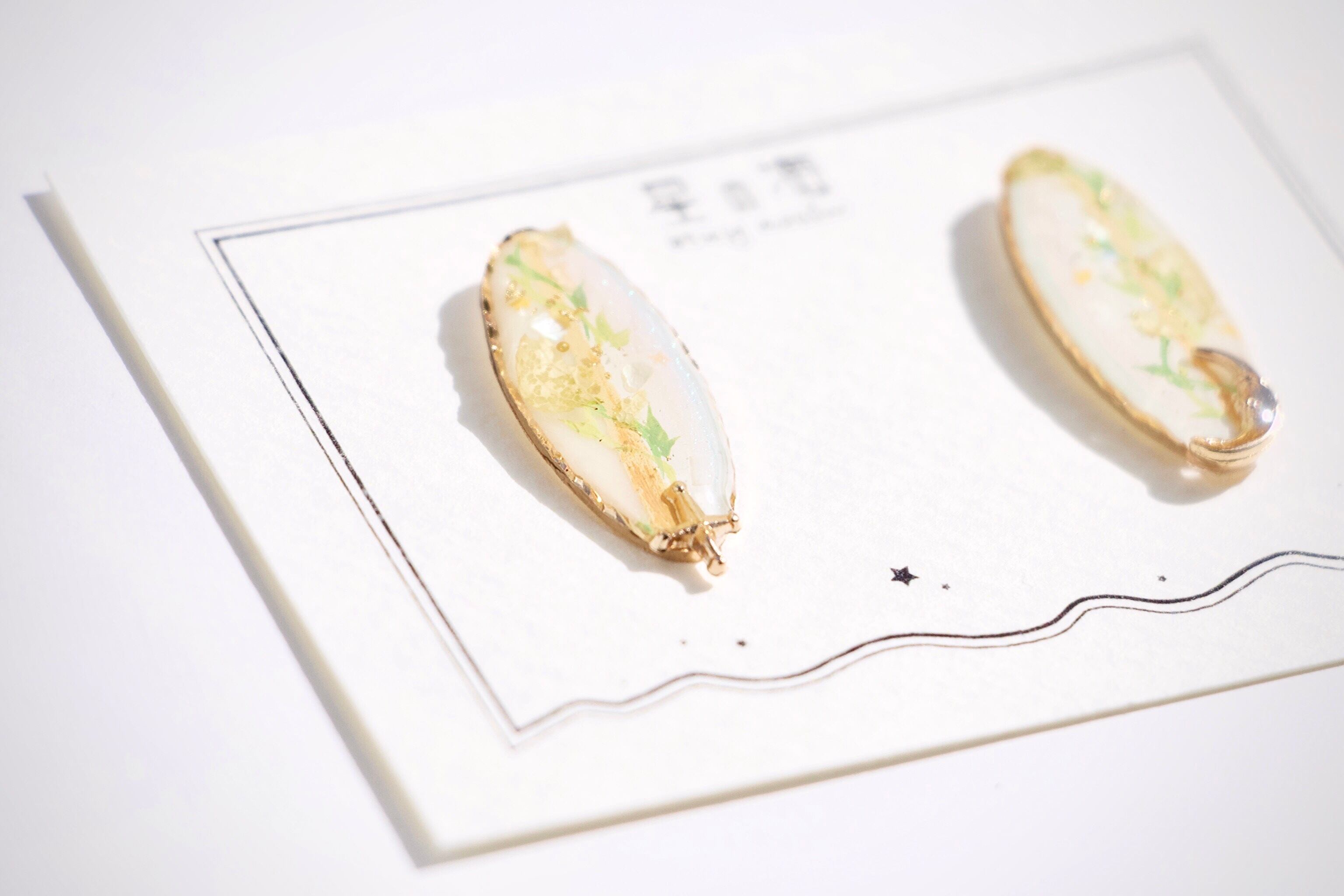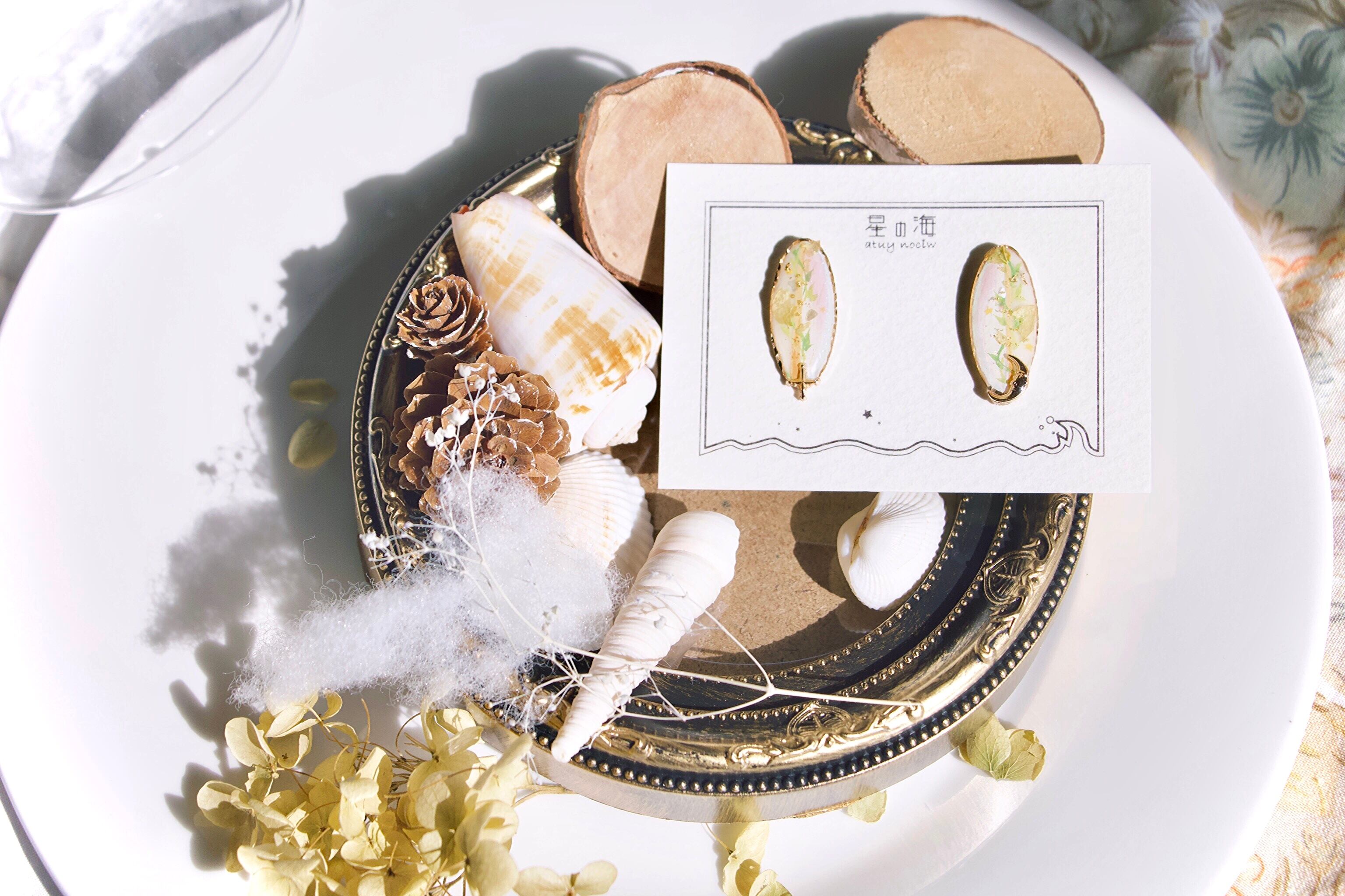 ミュシャの絵画やパネルからインスピレーションを得た、柔らかく統一性のある綺麗さを表現したアクセサリーです。白とゴールドを中心としたナチュラルカラーでまとめ上げ、少し尖りのある洗練されたデザインをその手に…