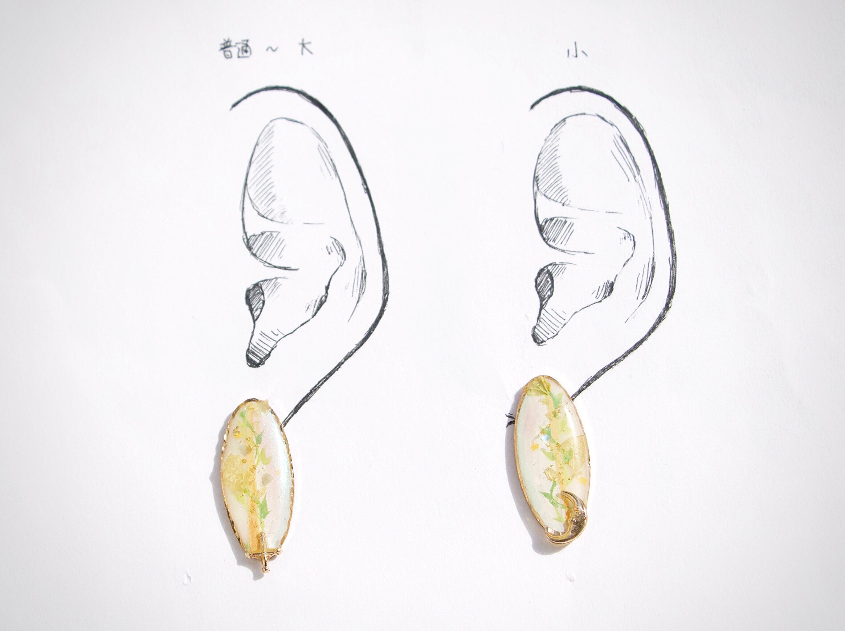 耳につけるパーツをつけていないため、台紙にはマスキングテープで留めている状態です。耳シートの左は平均的な女性の普通〜大きめの耳、右は小さめの耳のモデルとなっております。ご参照ください。