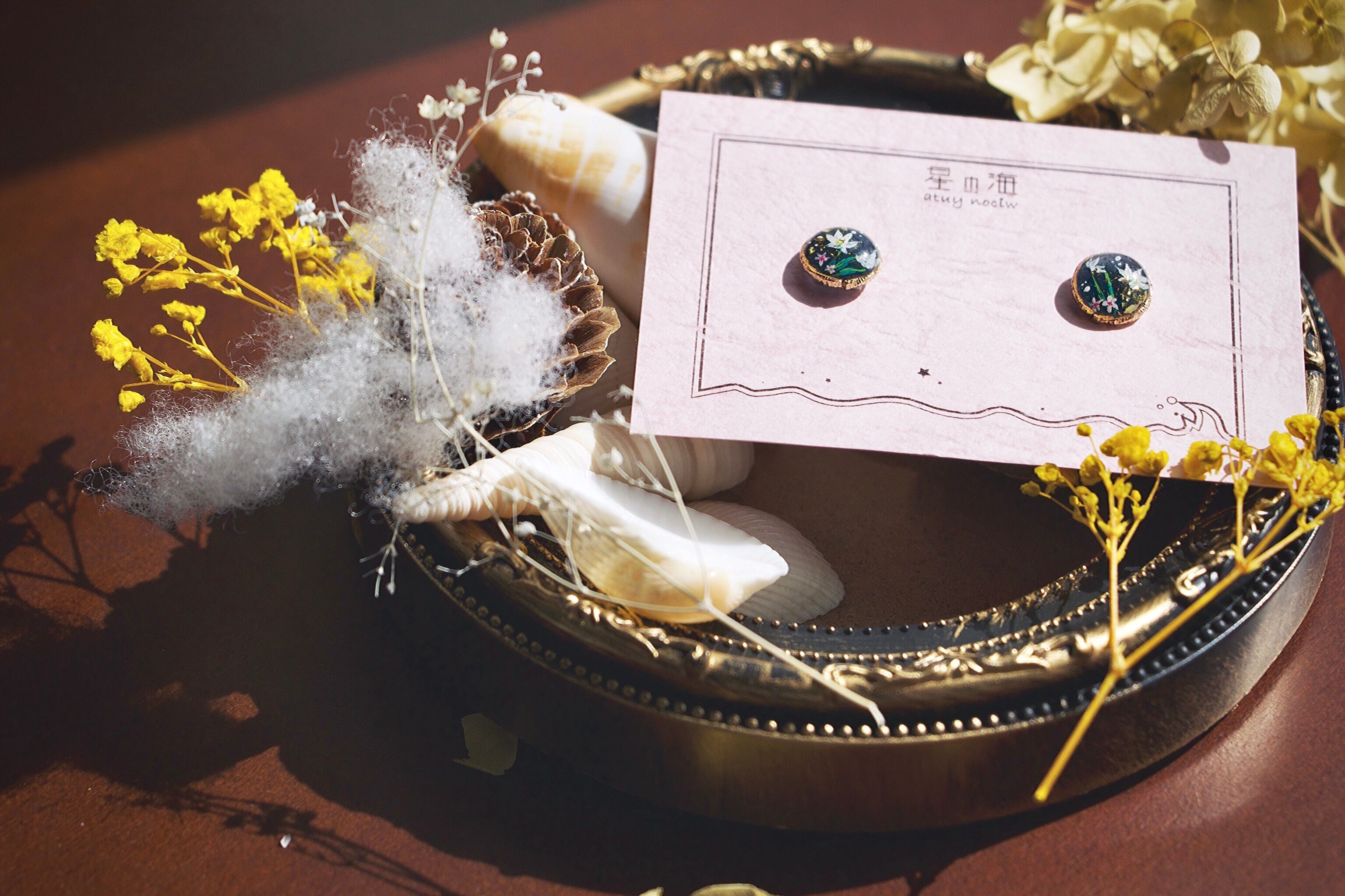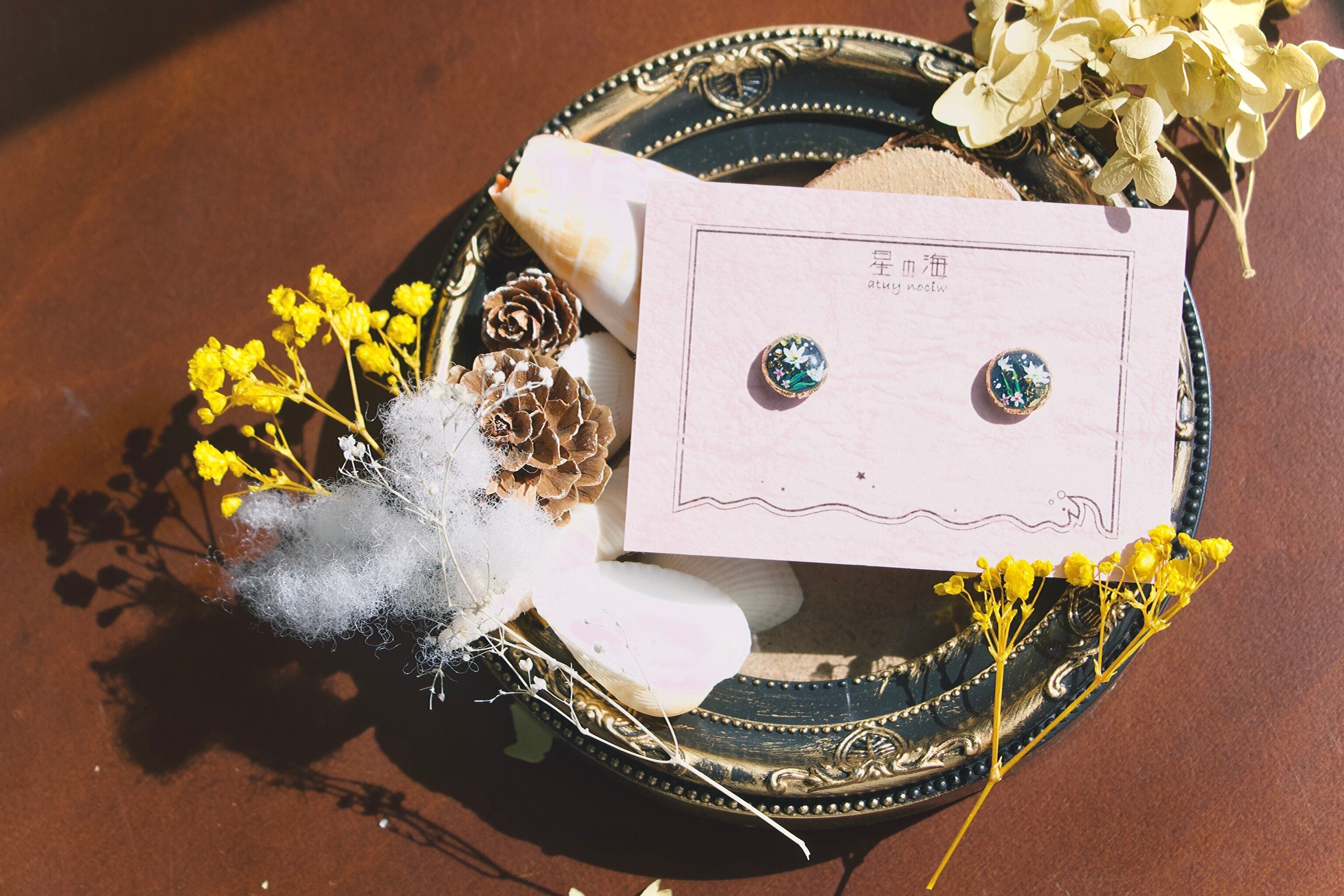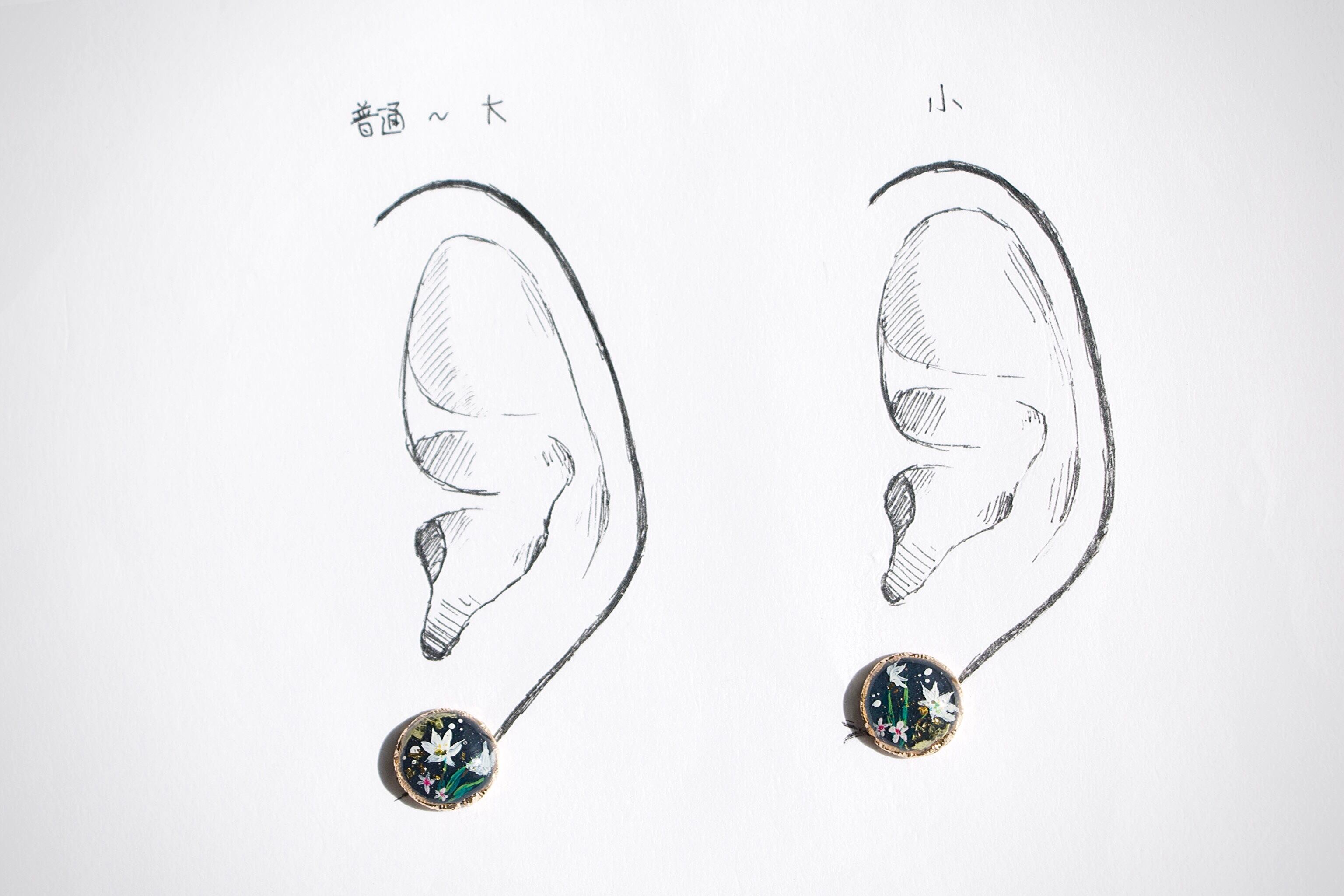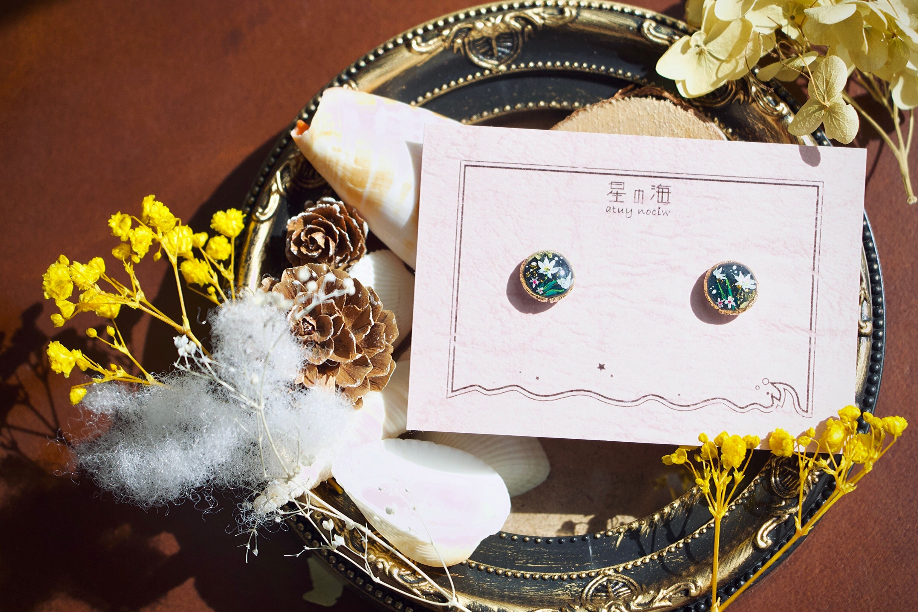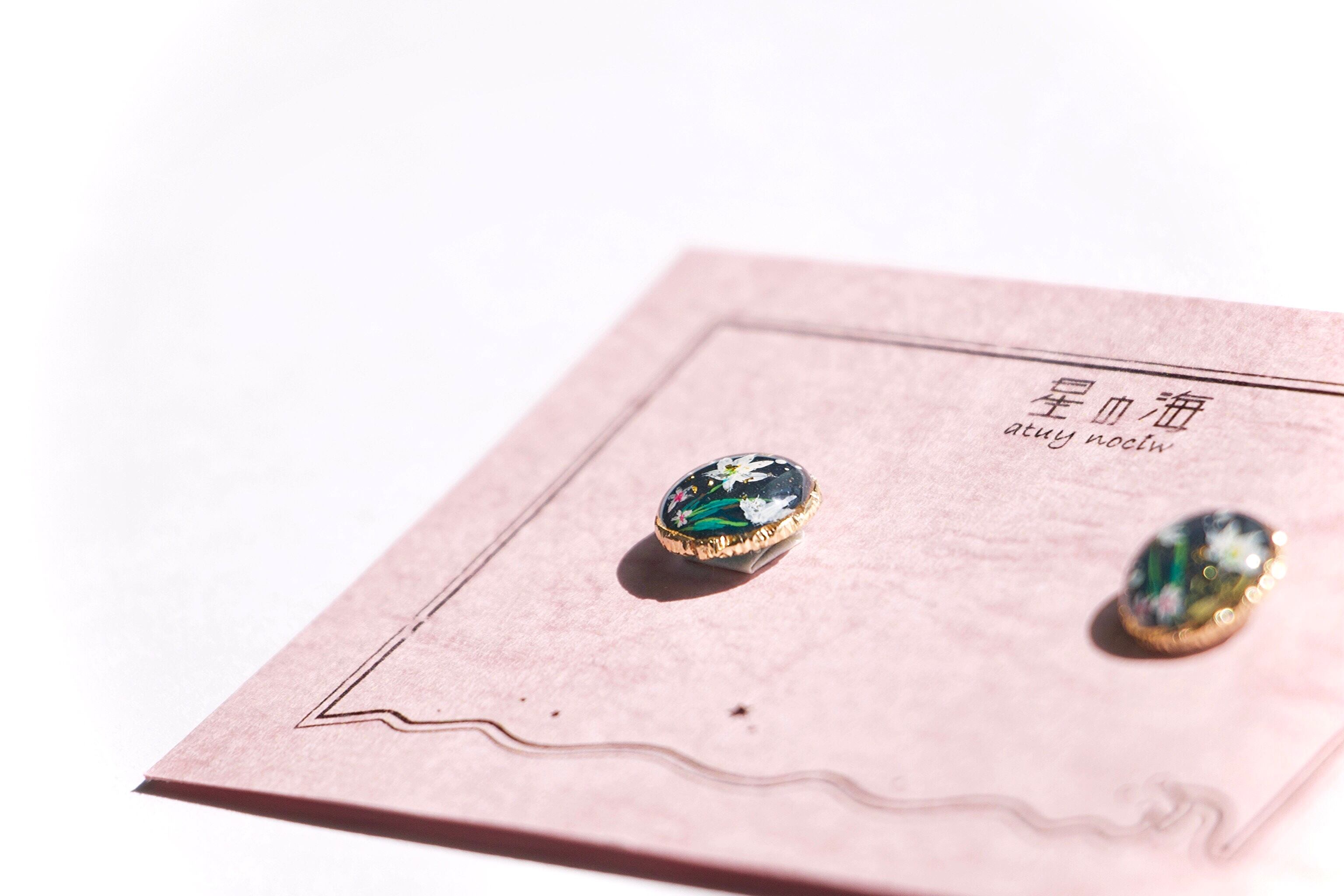 お月様といえば秋かもしれませんが、年中季節を問わず着けやすいデザインかと思います!花言葉を加味し、ちょっぴり勇気を出したい時に着けて欲しいそんな作品です。