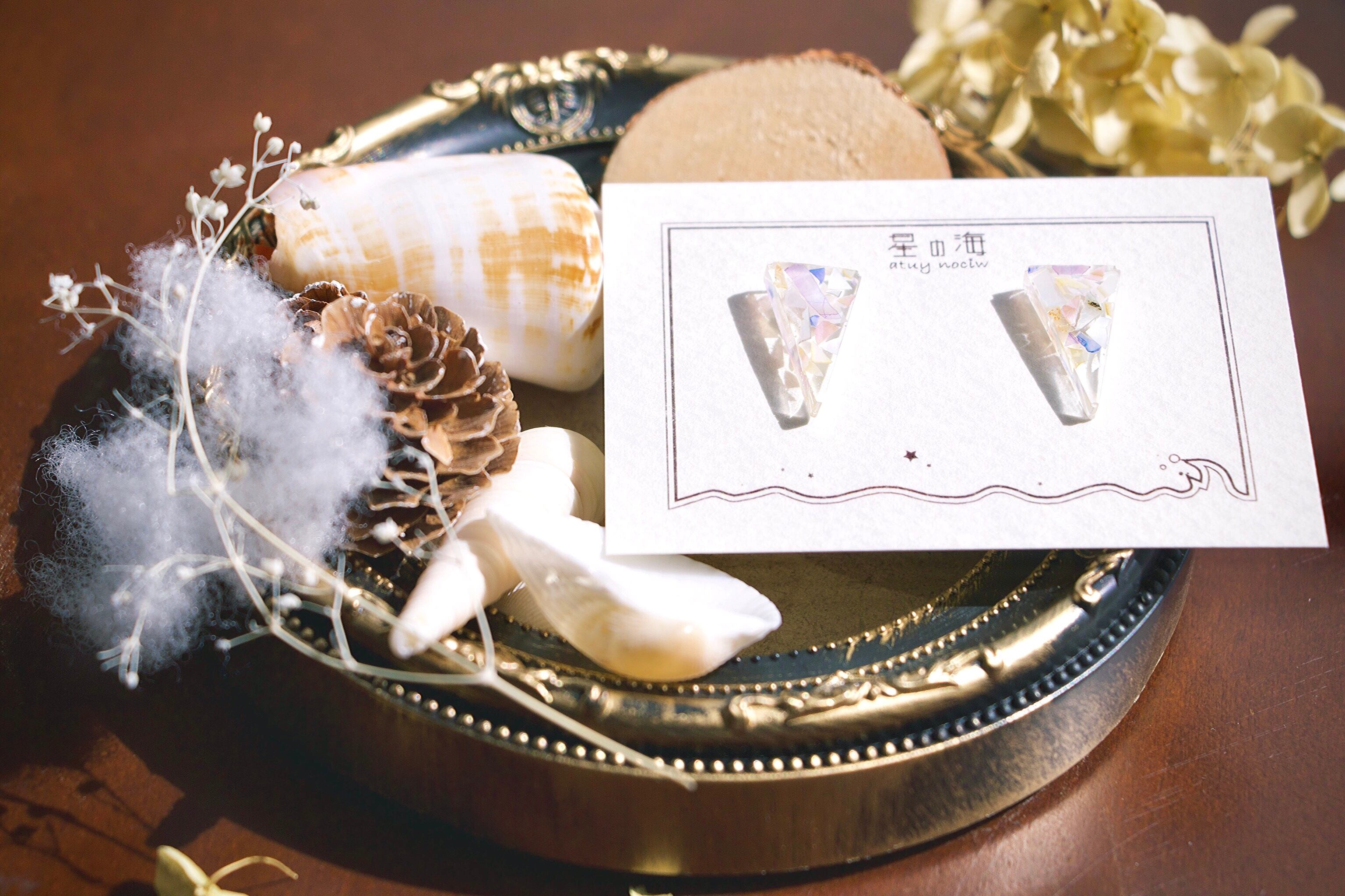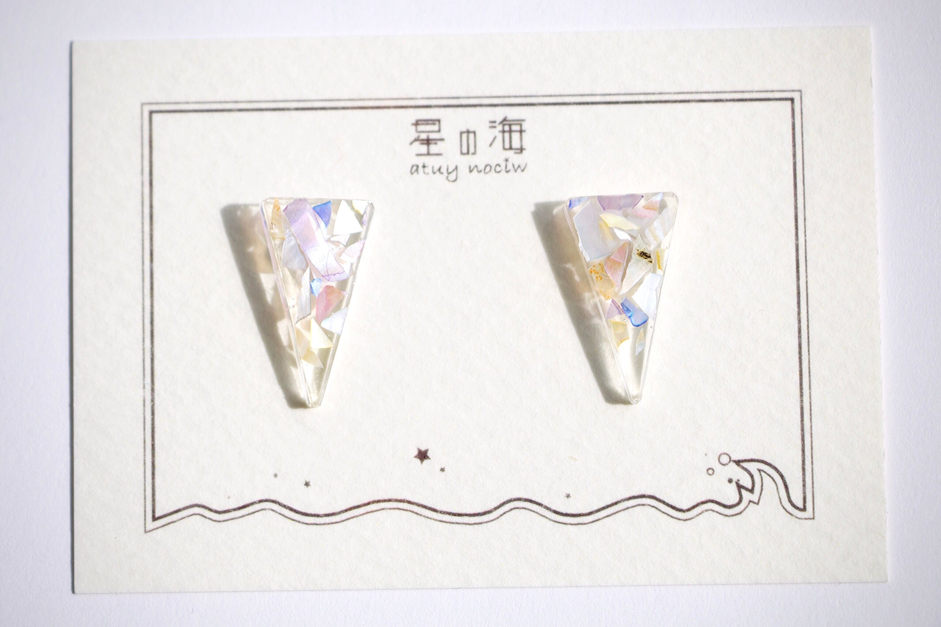 逆三角形の型の中にはステンドグラスのように薄紫、青、ピンク、オレンジ、黄色、水色にグレーや白のフレークシェルを砕き割って敷き詰め、金具が付く底には更に白いシェルを大きめに割って敷いています。全体的に下に行くにつれ細かく、消え入るように…