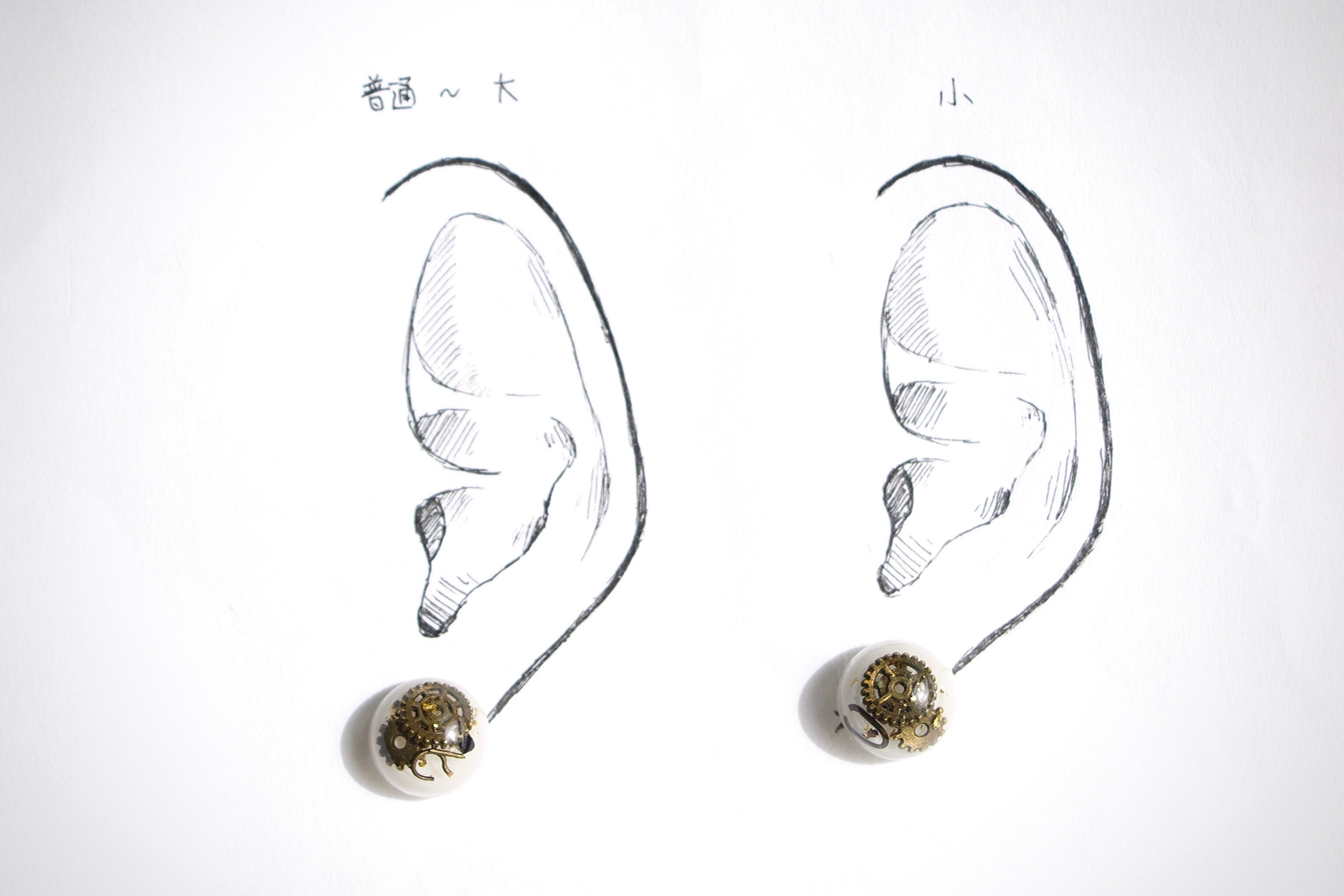耳につけるパーツをつけていないため、台紙にはマスキングテープで留めている状態です。耳シートではピアスパーツを当てています。左が平均的な女性の普通〜大きめの耳、右は小さめの耳のモデルとなっております。ご参照ください。