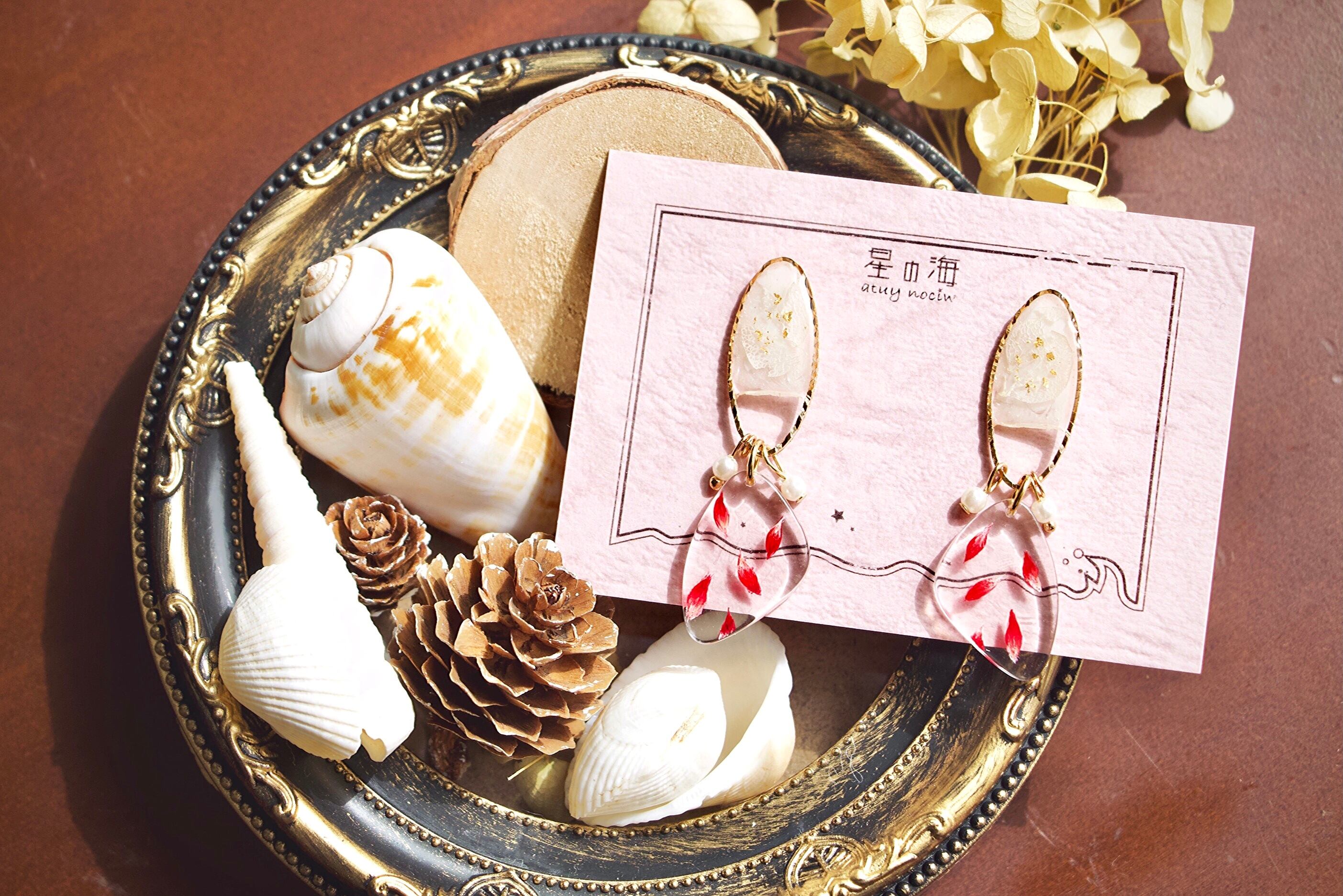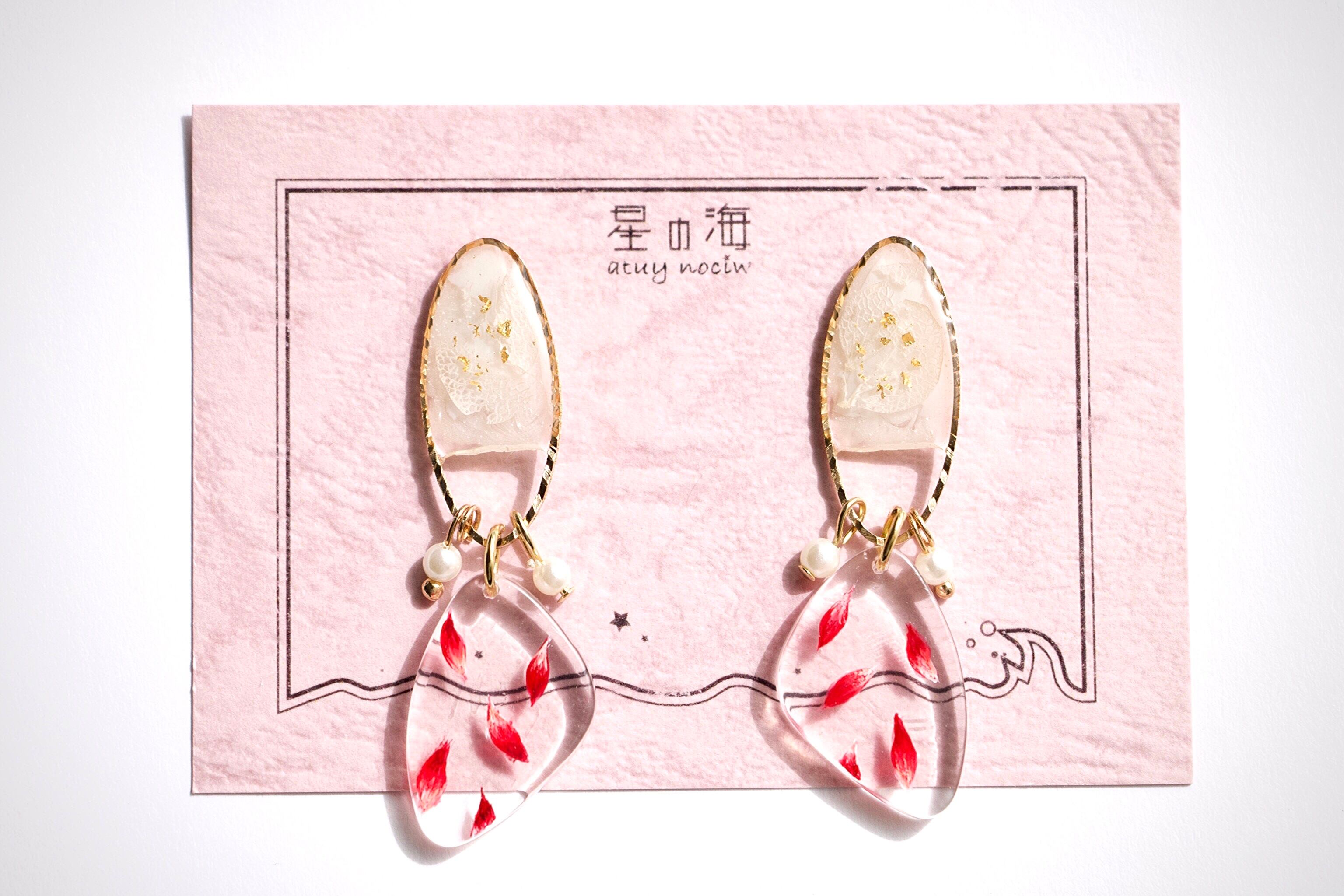花びら型のクリアパーツに赤ピンクの花びらを手描きで散らして垂らし、周りにはミニパールとビーズをシャラシャラと揺れるように配置しています♡