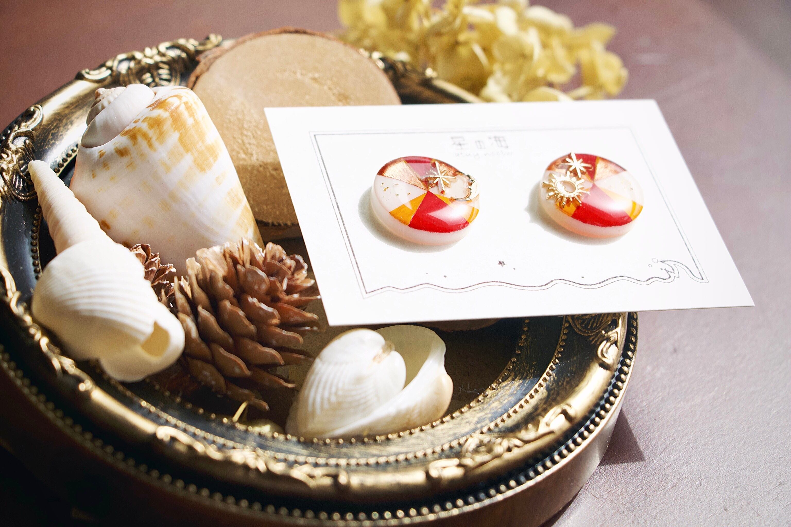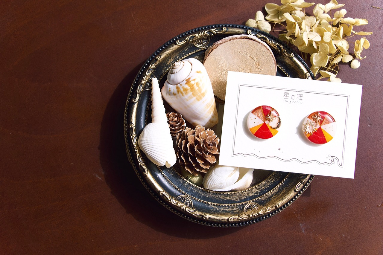 クリアの中に白を閉じ込め、その上に手描きでサーカステントをイメージした赤、黄、ブロンズを塗りました。