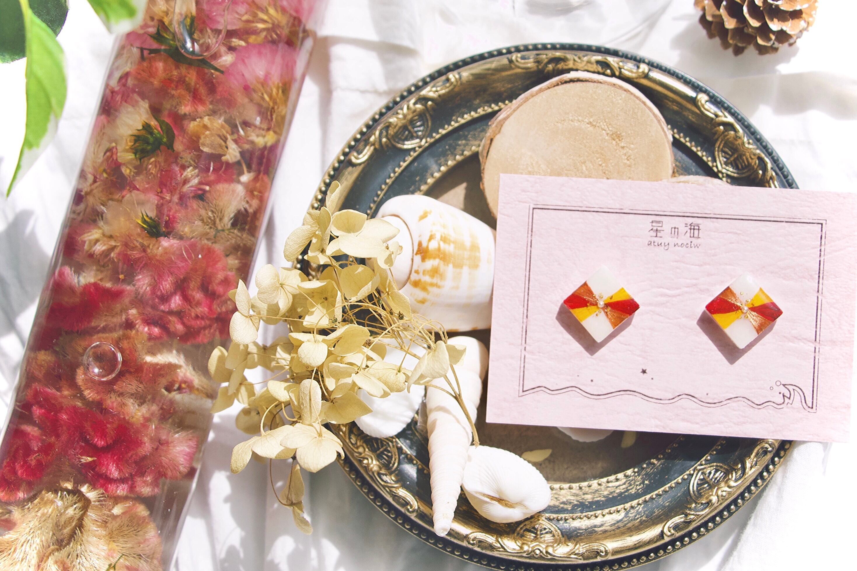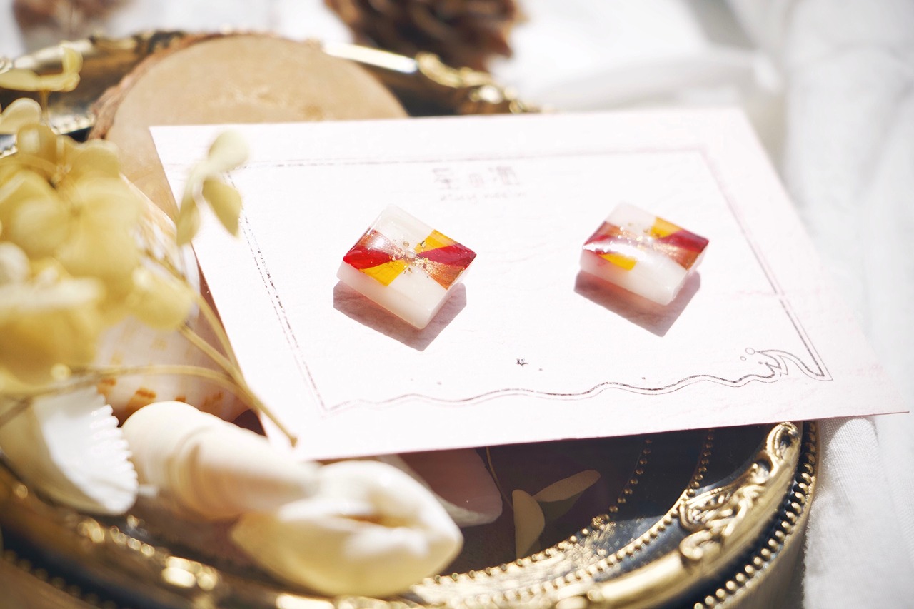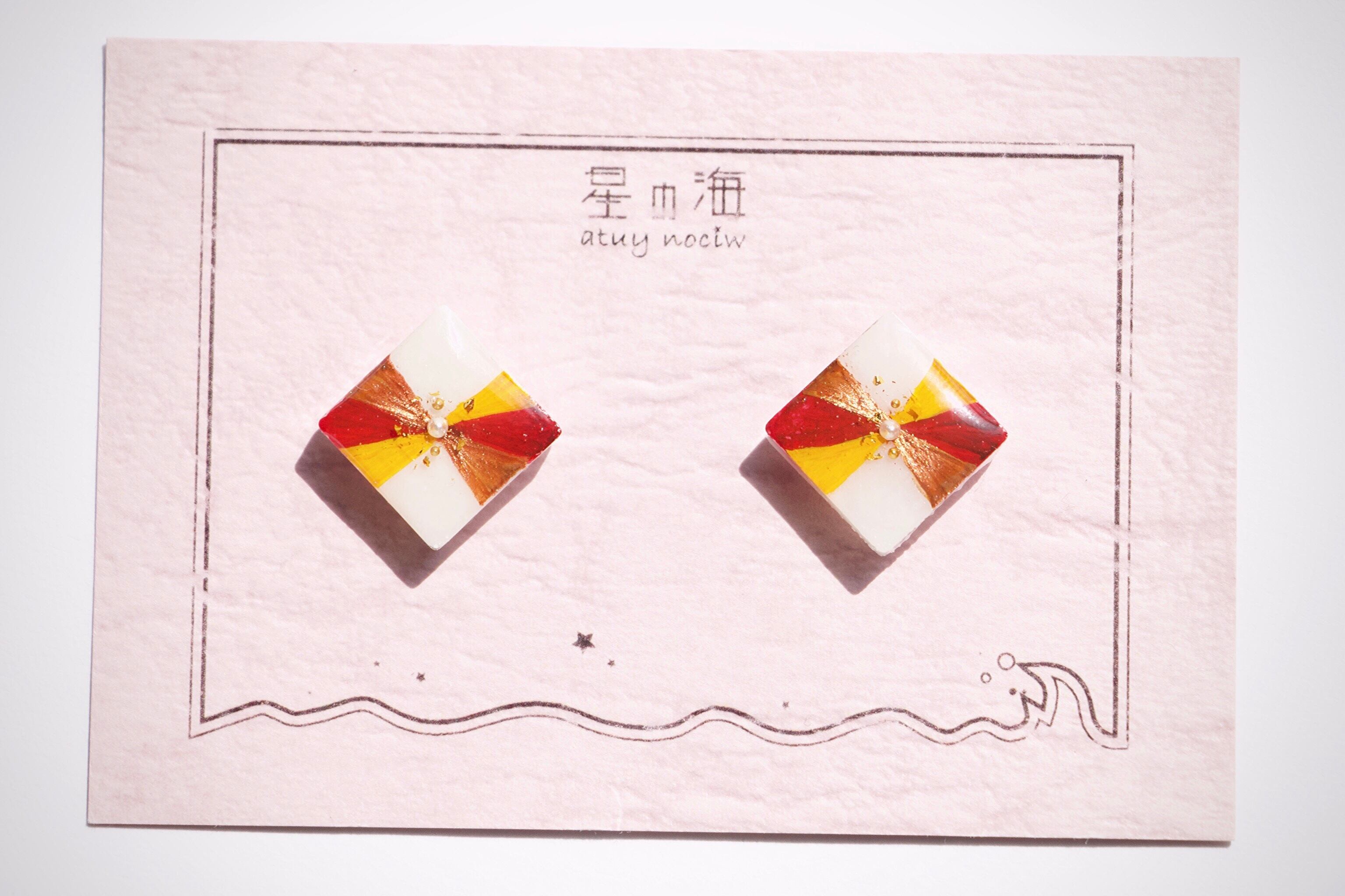 クリアと白をマーブル模様にして固め、その上に手描きでサーカステントをイメージした赤、黄、ブロンズを塗りました。