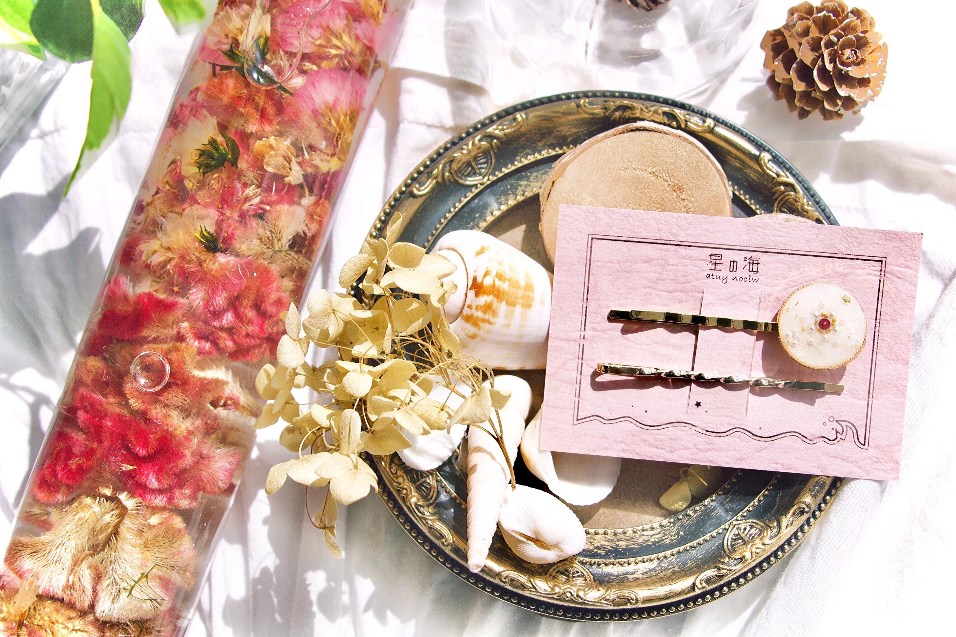 少し存在感のあるゴールドのトップにはくすんだ白色を流し込み、白い紫陽花のドライフラワーを敷き詰め、パールを花形に埋め込みました。真ん中には赤紫のパールをあしらって、目に留まりやすいようにしました。