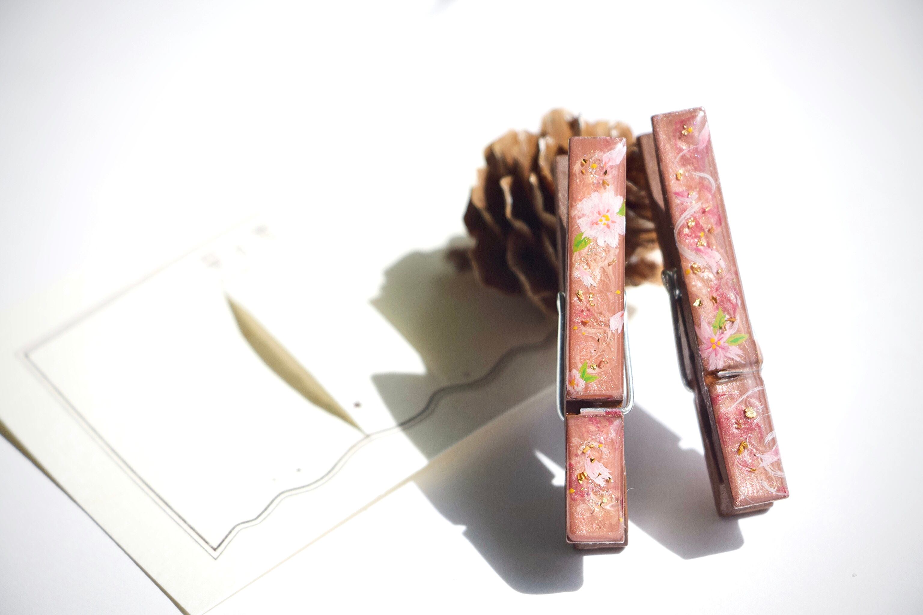 ナチュラルなブラウンの木製クリップにくすみパールピンクを塗り、うっすらと白・濃いピンクでマーブル模様に。
