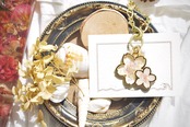 2つの桜がくっついた枠の下側には白色のレジンを流し込み、大きい方にはクリアを流しましたをどちらも大きめの白いフレークシェルを真ん中から広がるように敷き、下側の方は花軸をイメージしたゴールドのブリオンと様々なピンク色のシェルを。