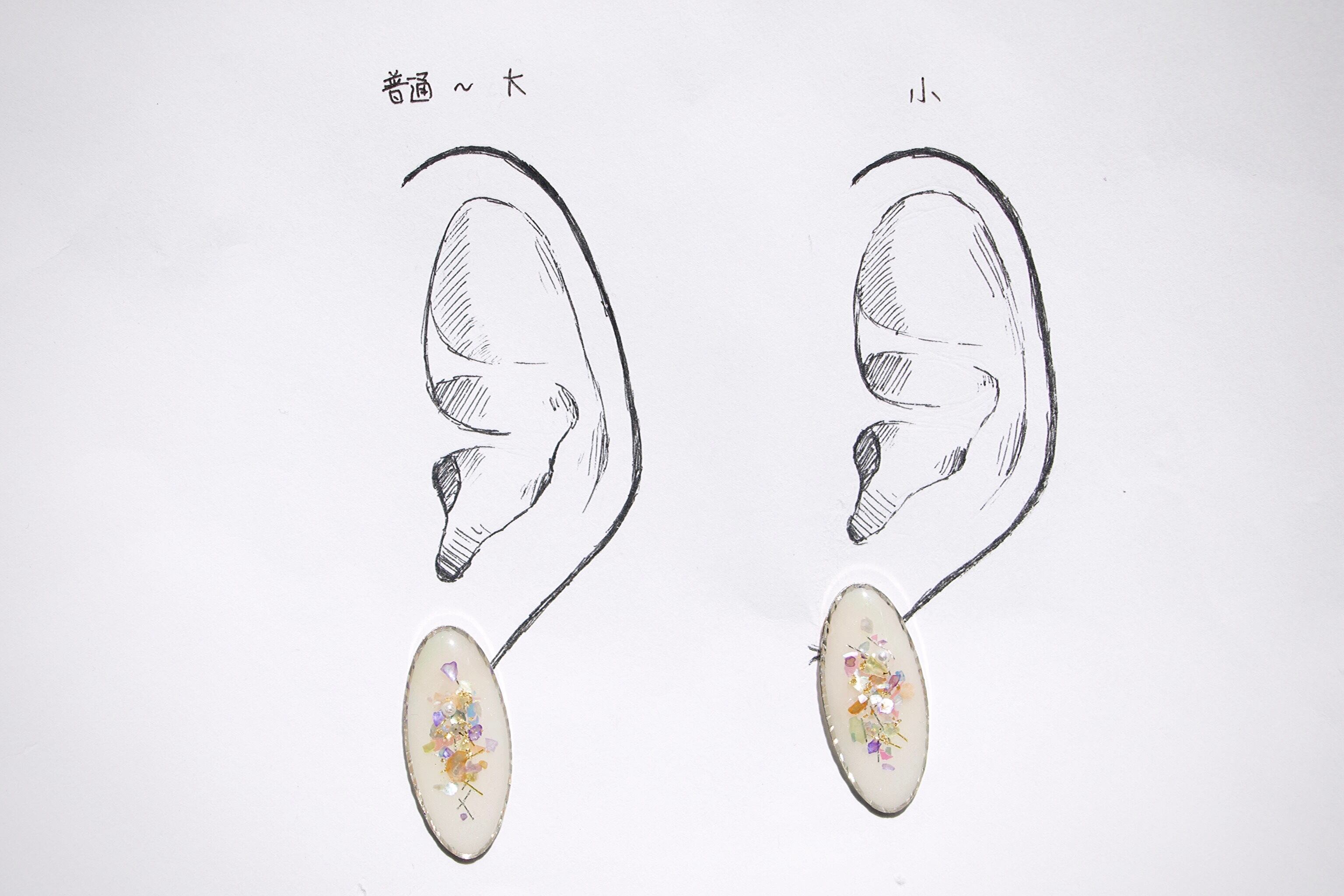 耳につけるパーツをつけていないため、台紙にはマスキングテープで留めている状態です。耳シートの左は平均的な女性の普通〜大きめの耳、右は小さめの耳のモデルとなっております。ご参照ください。