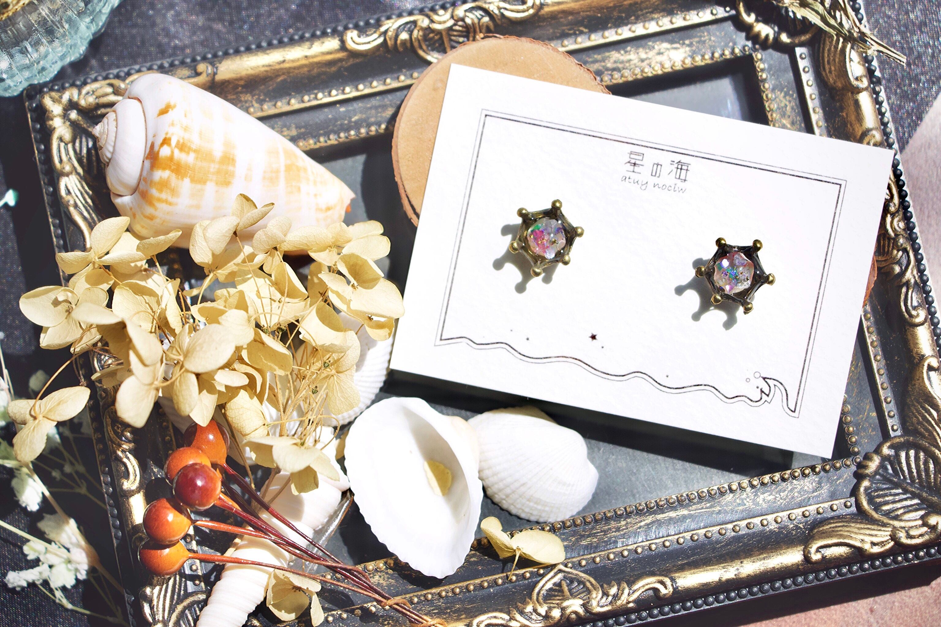 ハンドメイド アクセサリー プレゼント ギフト 彼女 女 かわいい 綺麗 手作り レジン ファッション コーデ ドライフラワー ピアス イヤリング ノンホールピアス カラフル 色が変わる 偏光 キラキラ 王冠 アンティーク ティアラ プリンセス 青シェル ゴールド