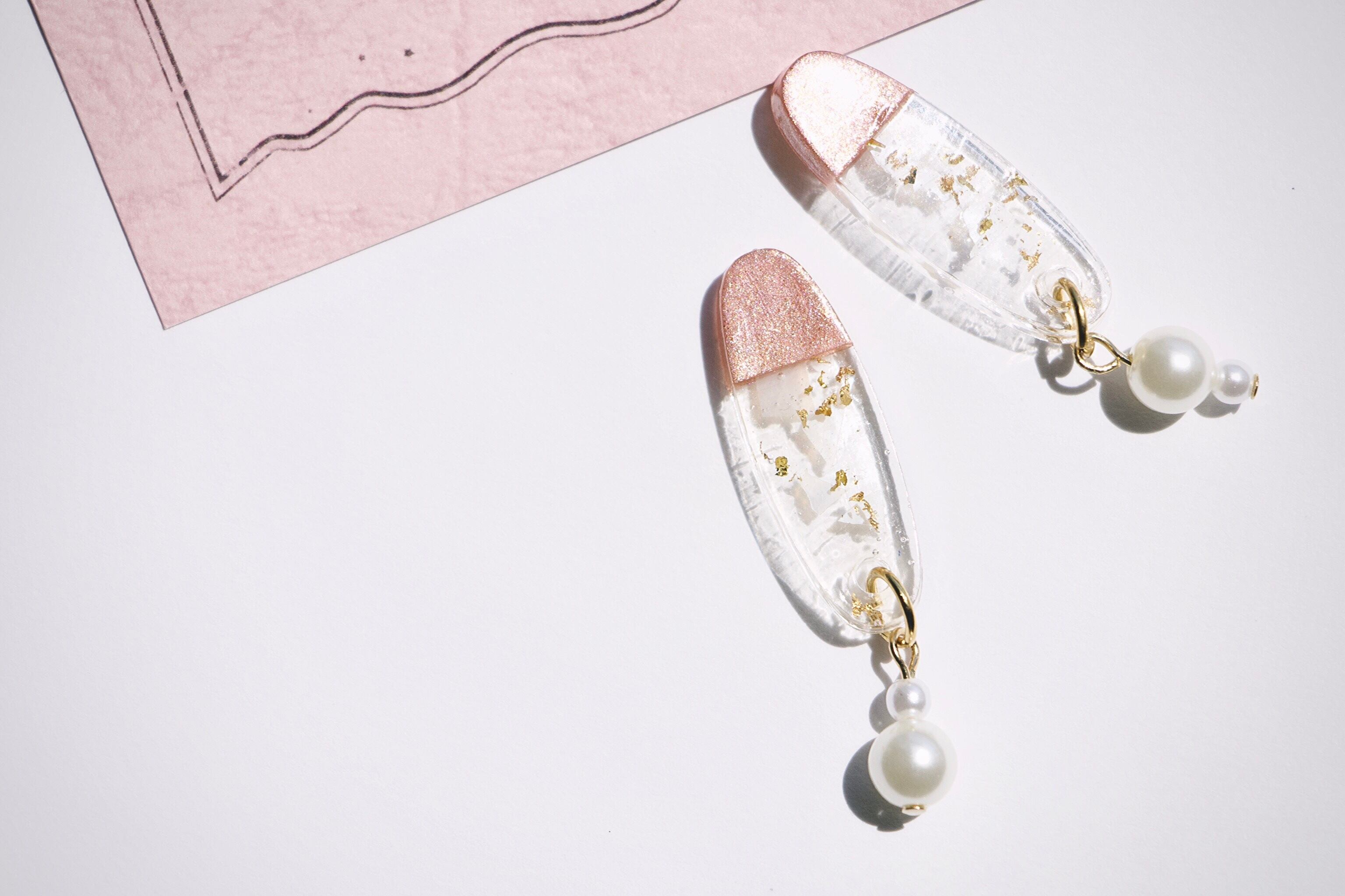 楕円形のトップには数種類の金箔とフレークシェルを上から降るように散らし、くすんだピンクゴールドのパールラメを少々。下からは大小のパールをアシンメトリーに下げ、カラーもシンプルに仕上げました。