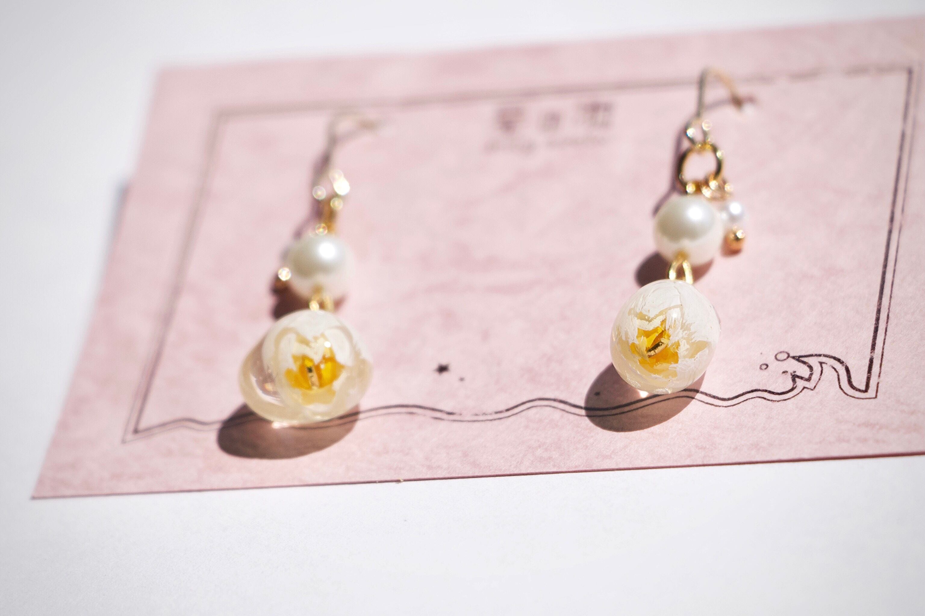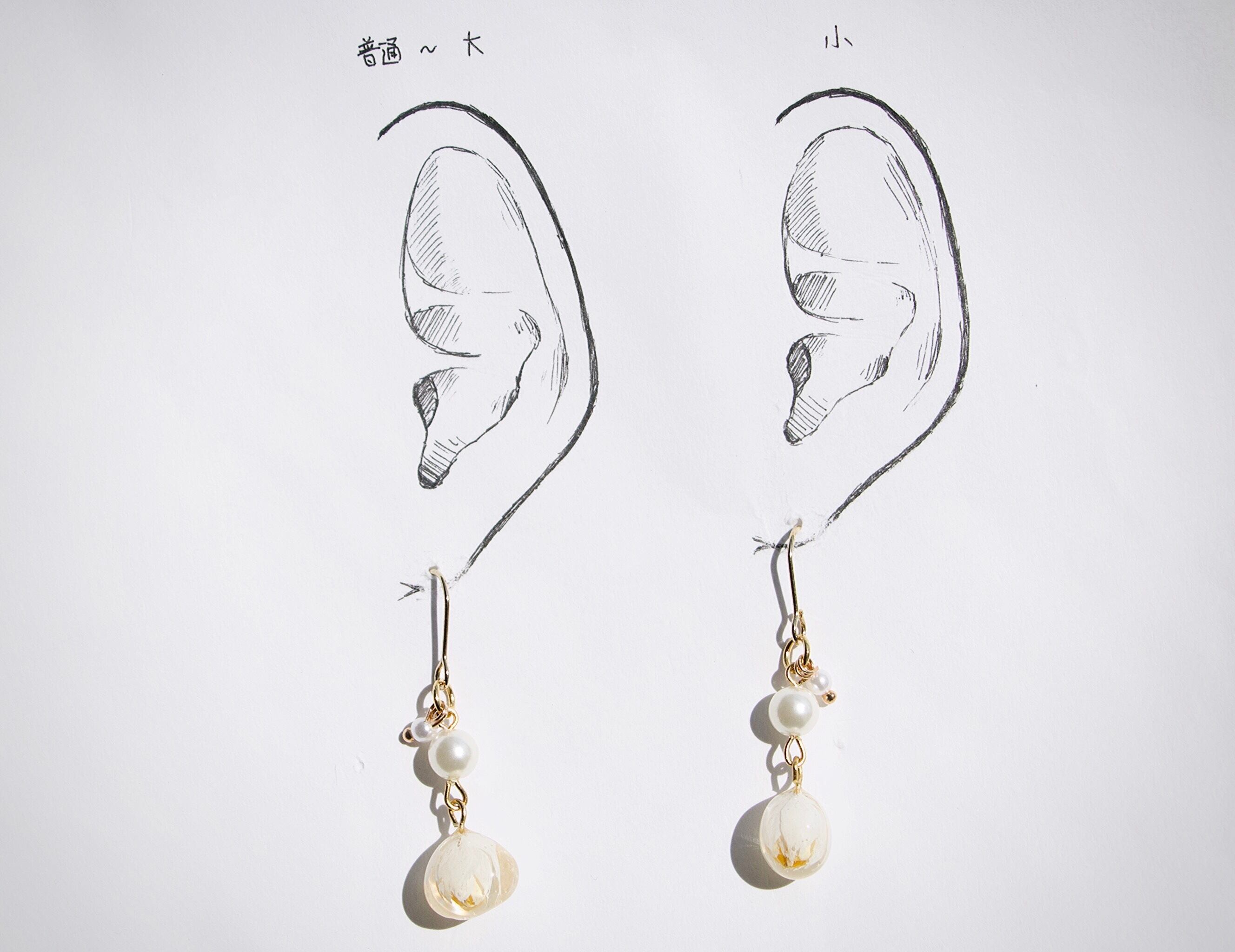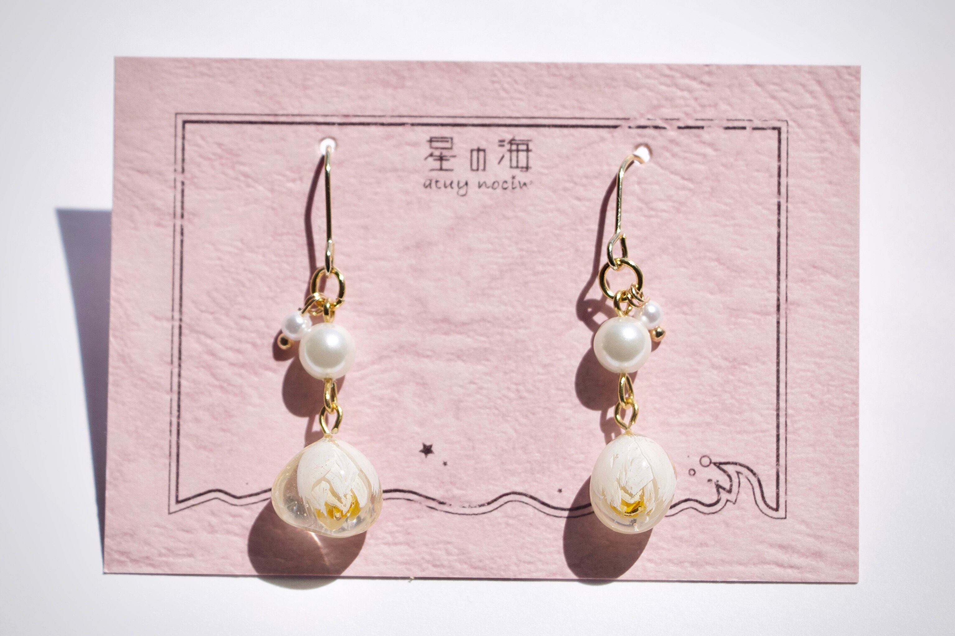 ハンドメイド アクセサリー プレゼント ギフト 彼女 女 かわいい 綺麗 手作り レジン ファッション コーデ 立体的 花 手描き 花びら レース 雨粒 パール ゴールド ピンクゴールド クリア ホワイト 蕾