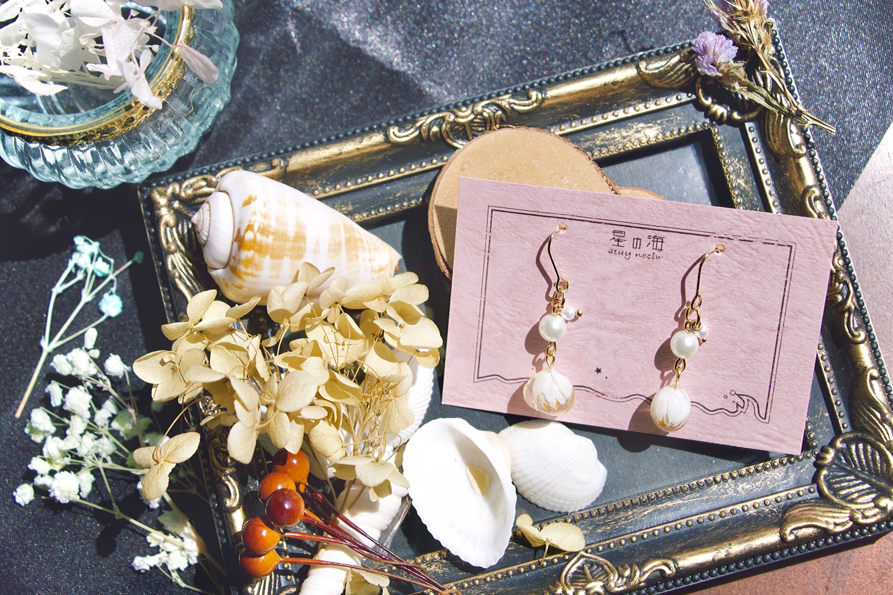 パールも2種類(大クリーム色とミニ白)垂らし、ピンクゴールドのビーズで締めています。