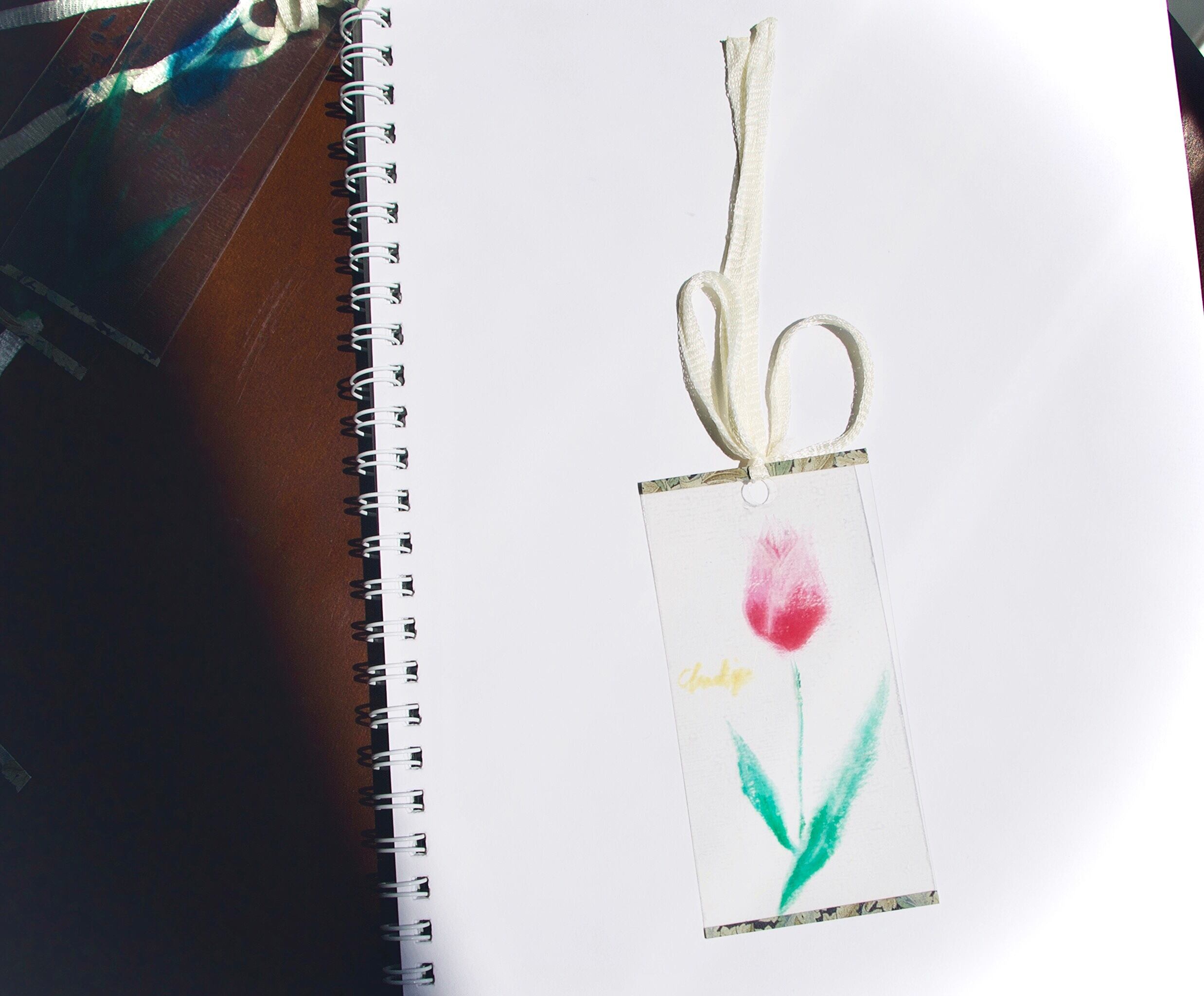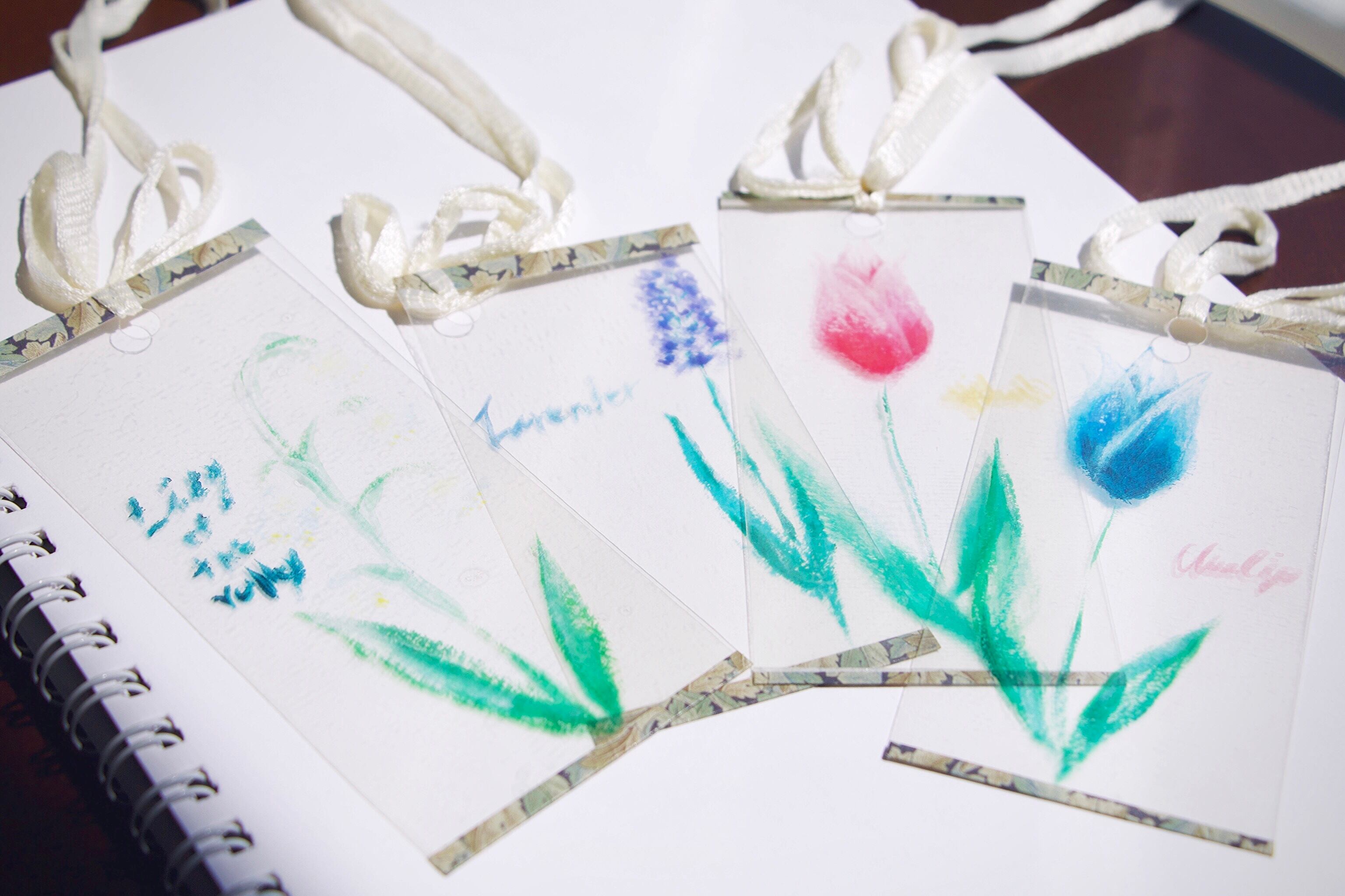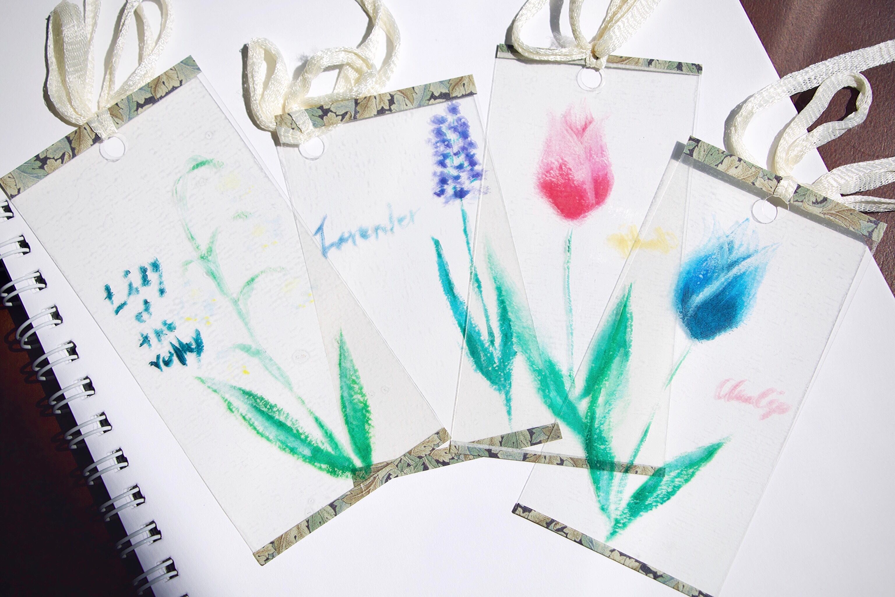 ハンドメイド アクセサリー プレゼント ギフト 彼女 女 かわいい 綺麗 手作り ファッション コーデ しおり シオリ クリア カード 本 手帳 手描き 花 チューリップ ラベンダー 鈴蘭 リボン オマケ おまけ オリジナル デザイン ブックマーク ブックマーカー