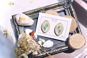 クリーム色とゴールドのねじり枠に白とクリアのマーブルレジンを敷き、様々な緑色のシダ植物を描きました。周りにはフレークシェルを砕き入れ、金箔を大胆に散らしています。