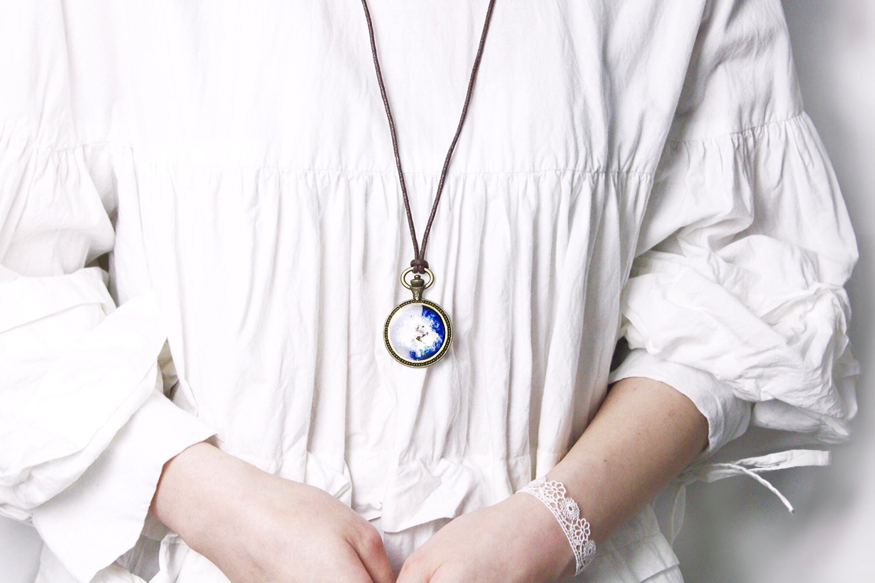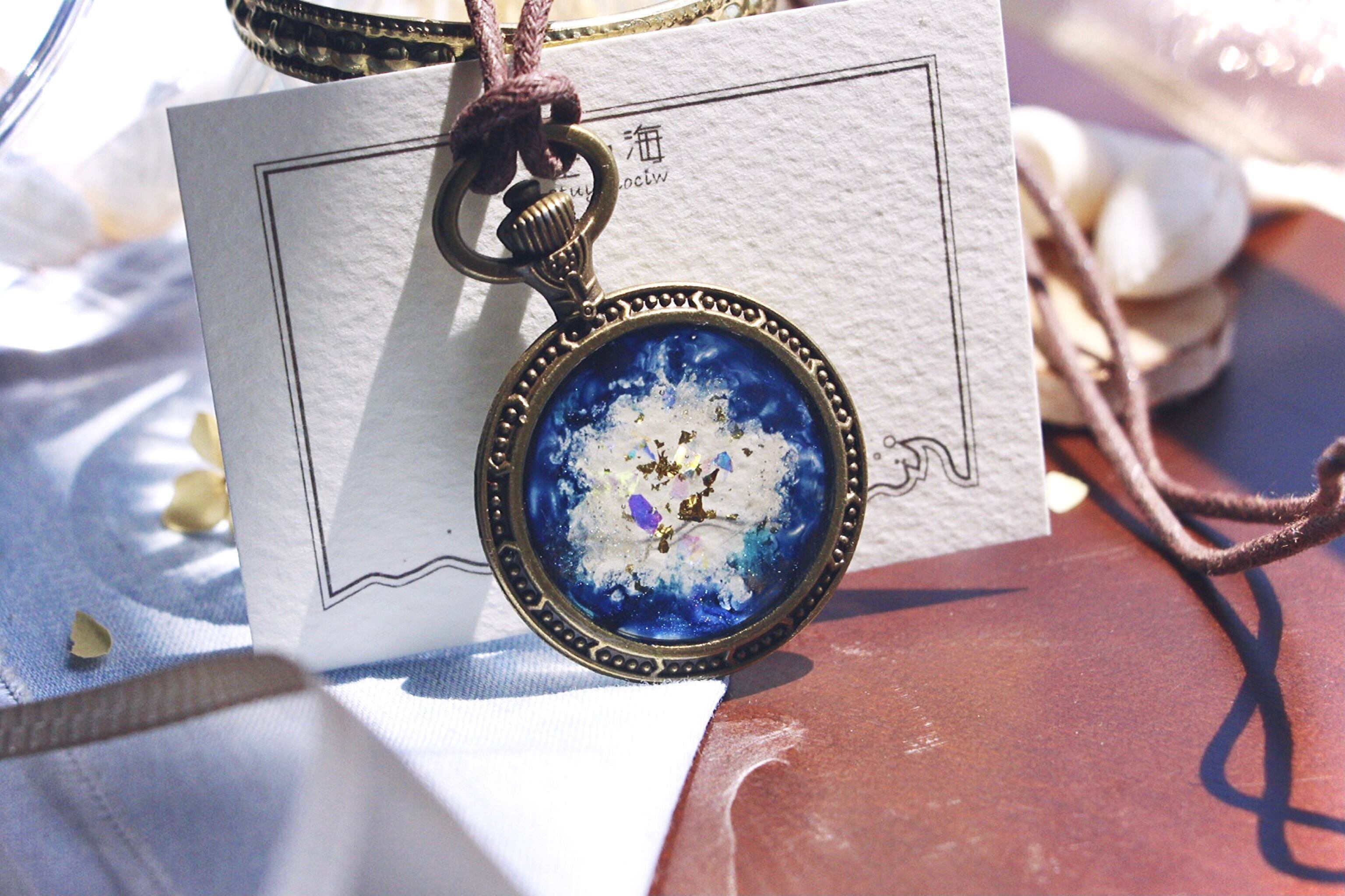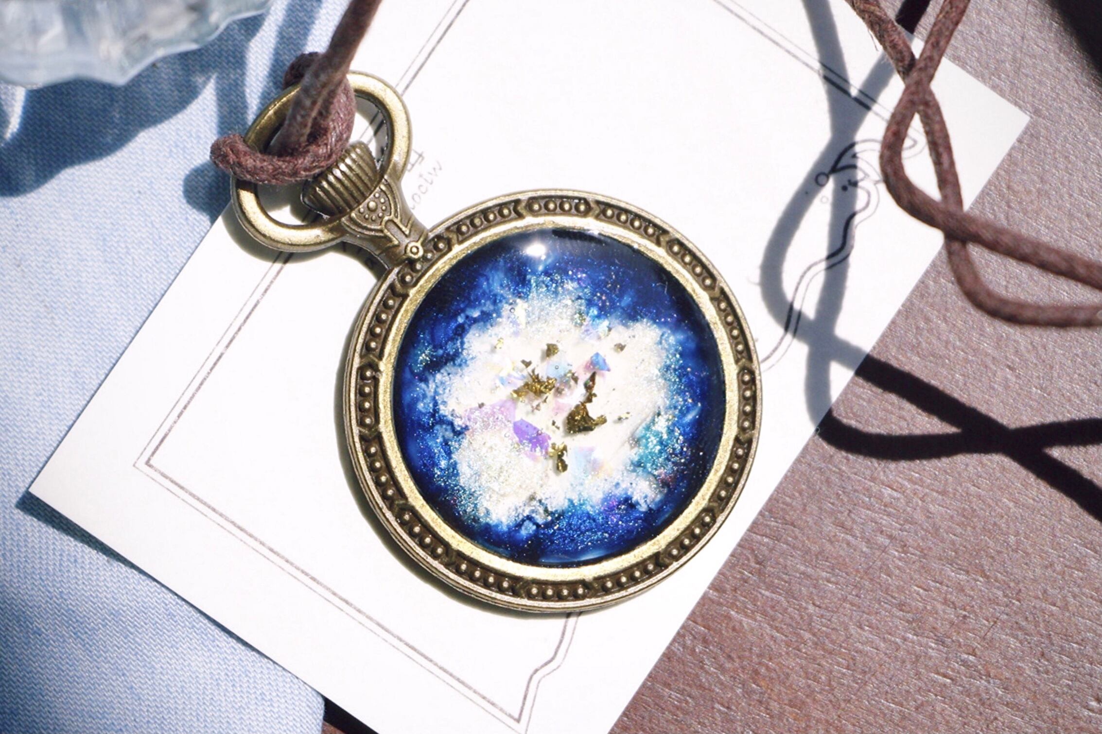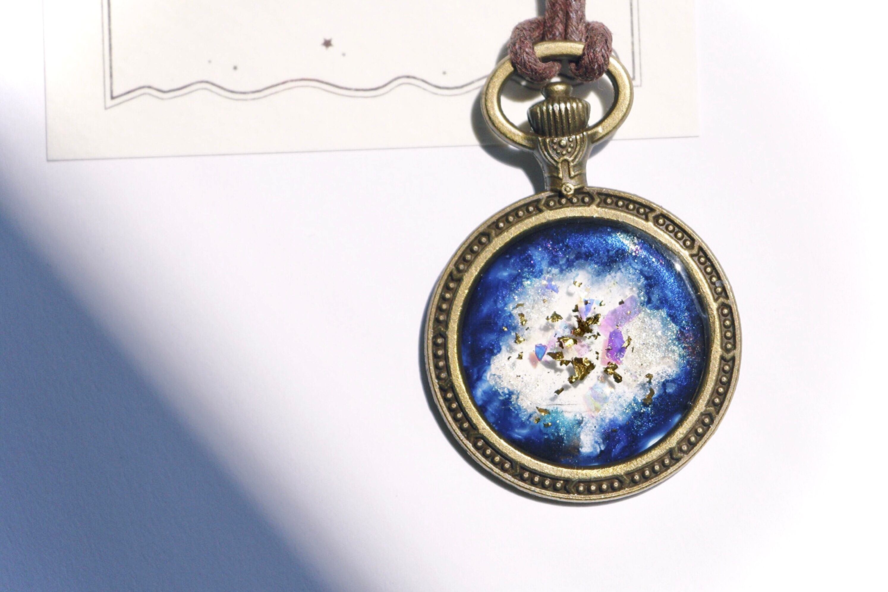 ハンドメイド ペンダント ネックレス 宇宙柄 キラキラ 色が変わる 青 綺麗 きれい ヴィンテージ ゴールド ビンテージ 個性的 ファッション コーディネート 金古美 リバーシブル 懐中時計 時計型 スチームパンク