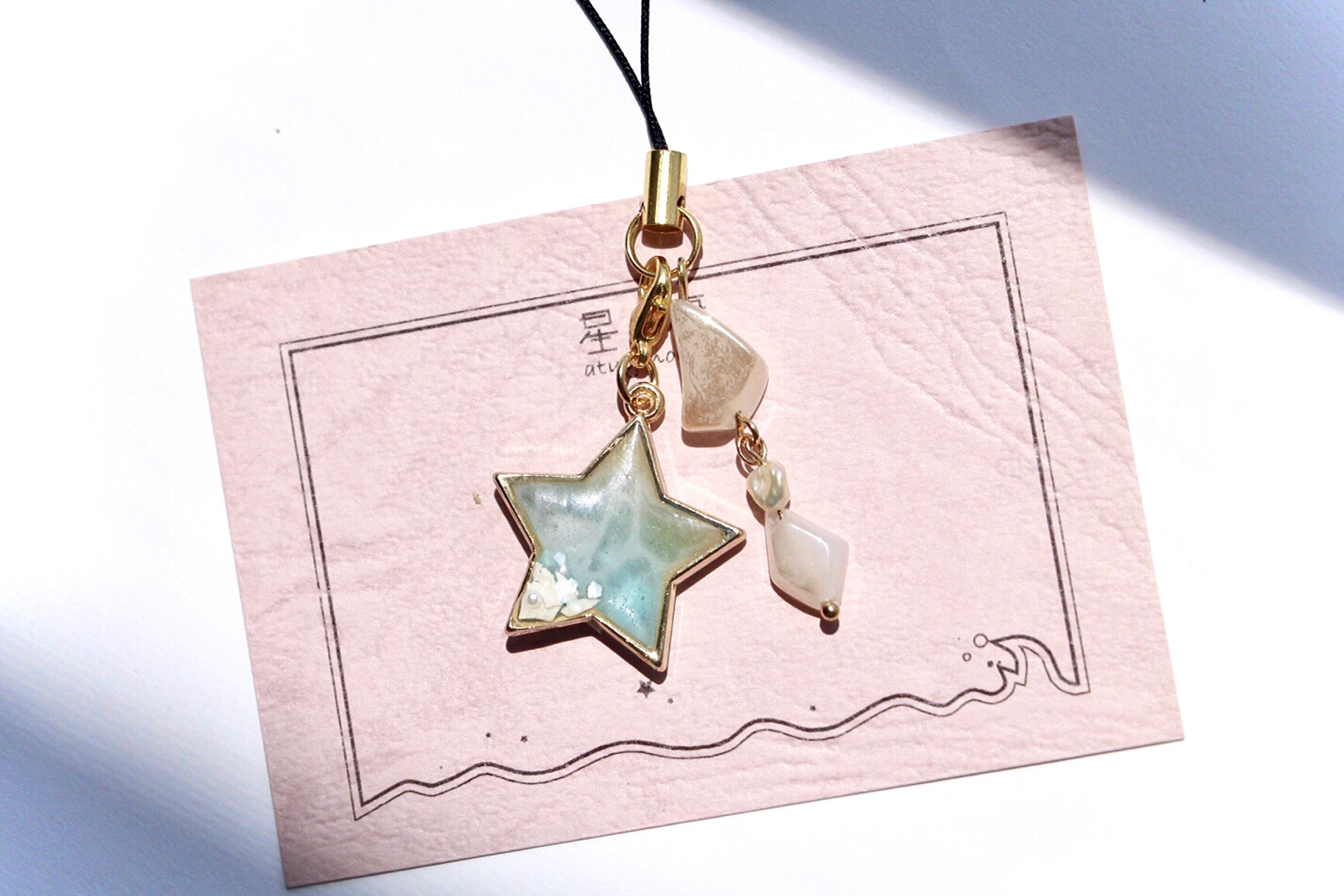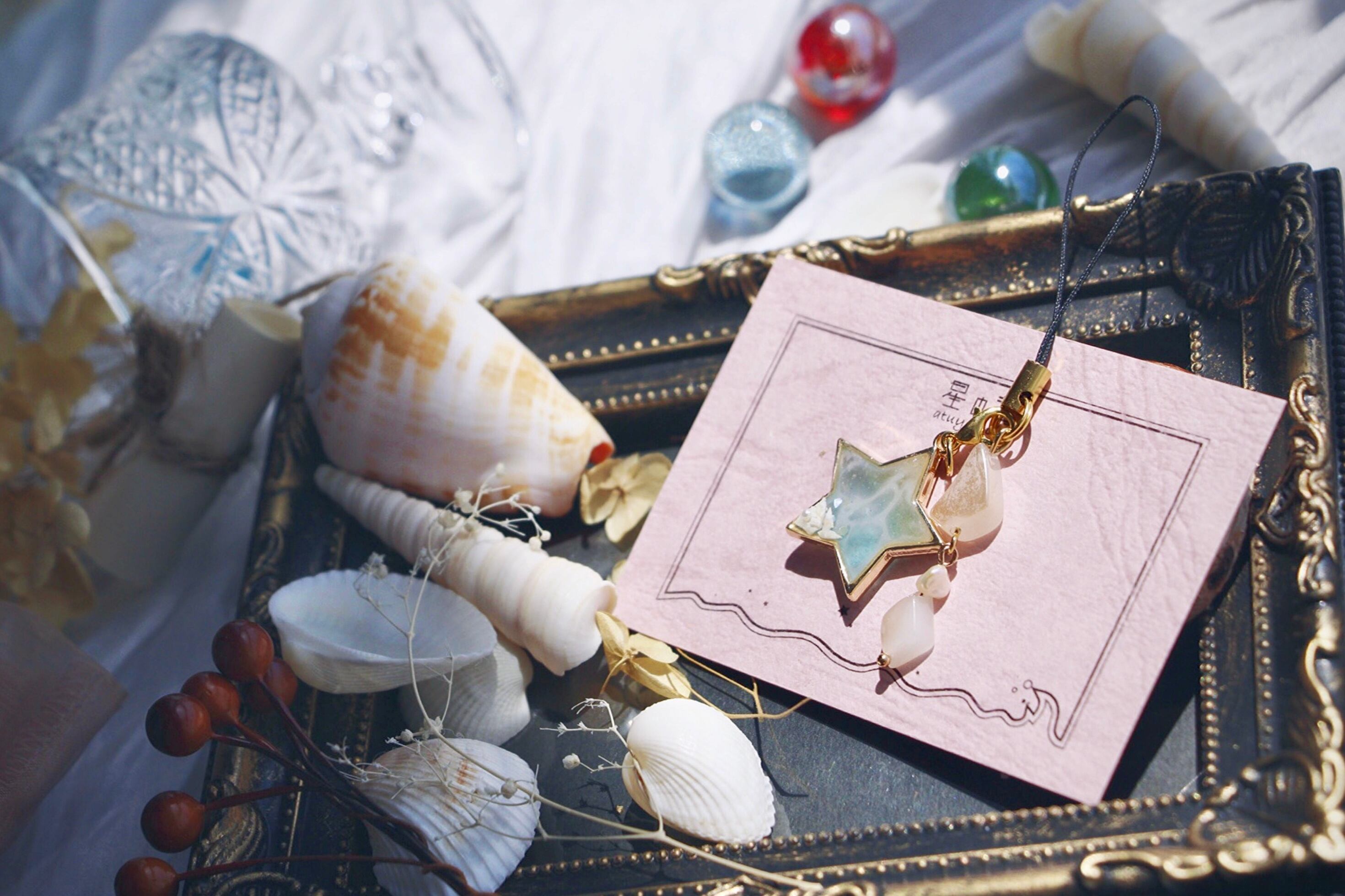 星型の枠には砂浜をイメージした右上、ゆっくりとさざめく波をイメージした左下をデザイン。本物の貝殻を砕いた欠片とミニパールが一層海らしさを出してくれています♡