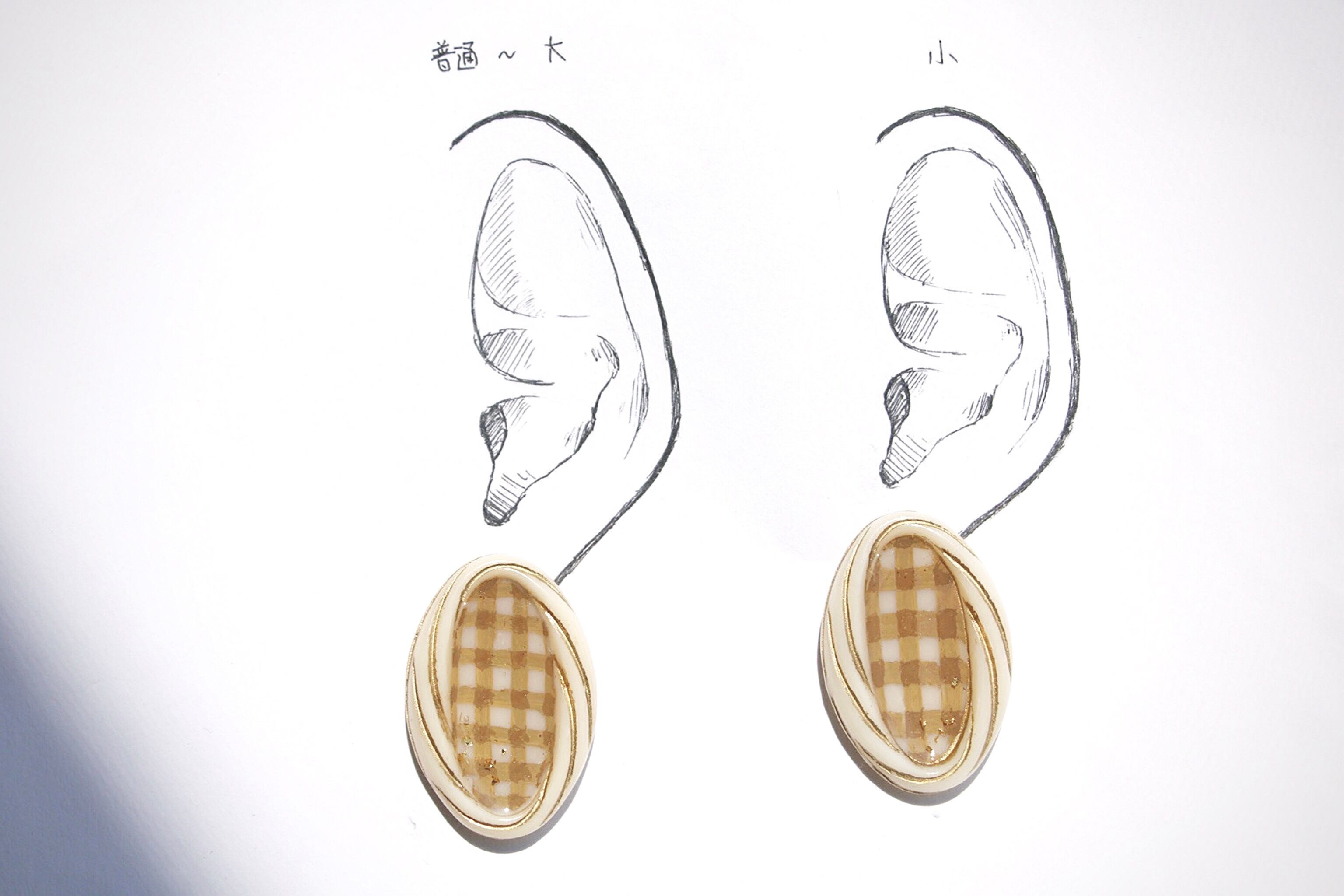 ハンドメイド アクセサリー ピアス イヤリング ノンホールピアス クリーム色 ギンガムチェック チェック アーシー アースカラー 茶色 ブラウン ナチュラル カジュアル パフスリーブ トレンド フレンチガーリー かわいい プレゼント ギフト 彼女 恋人 手描き アシンメトリー アシメ シンプル
