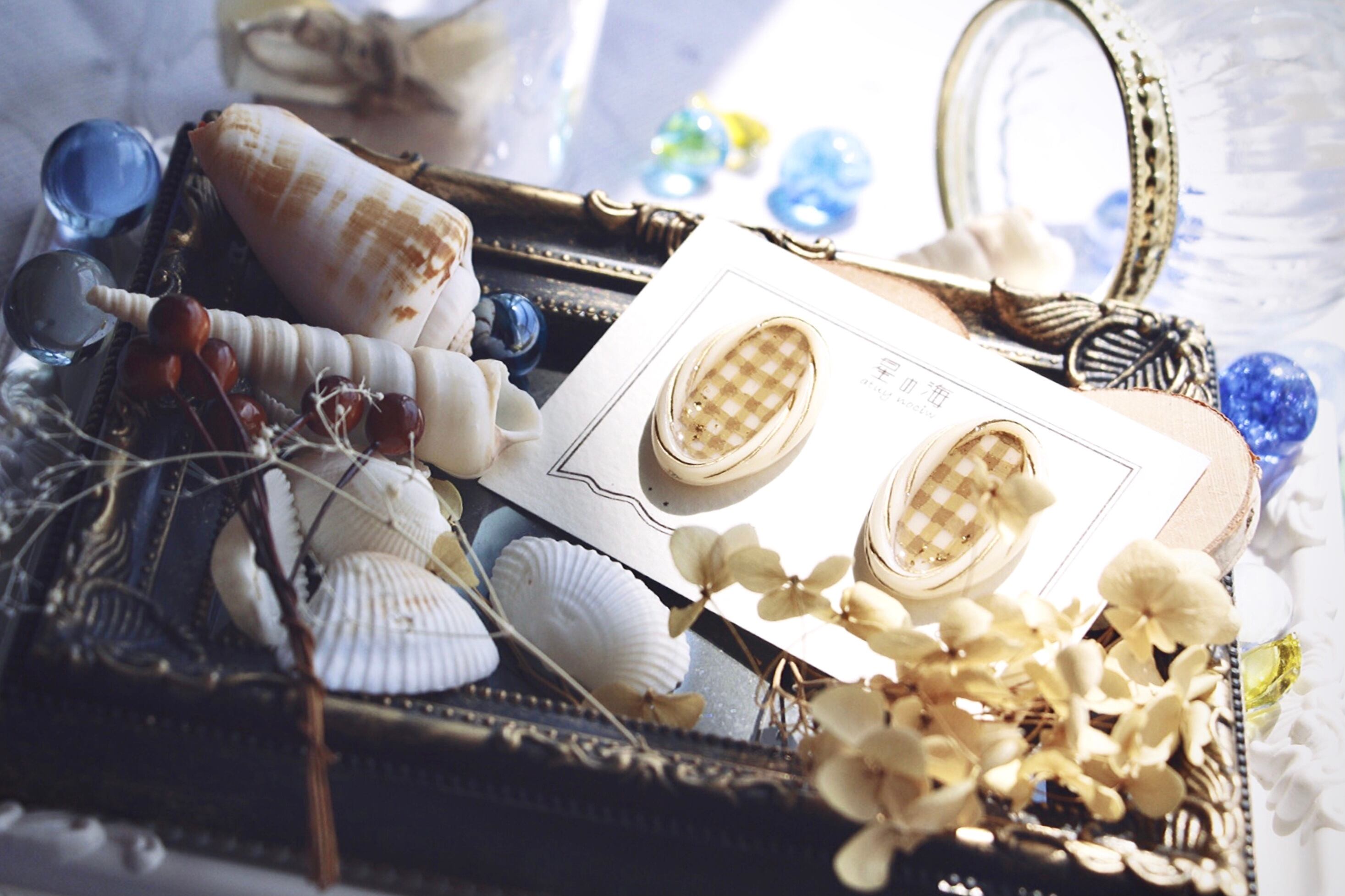 クリーム色のねじり枠の中には白を敷き、アーシーな茶色でギンガムチェックを手描きしています。左右でちょっぴり大きさが違うのも抜け感があり、ちょっとしたポイントです♡