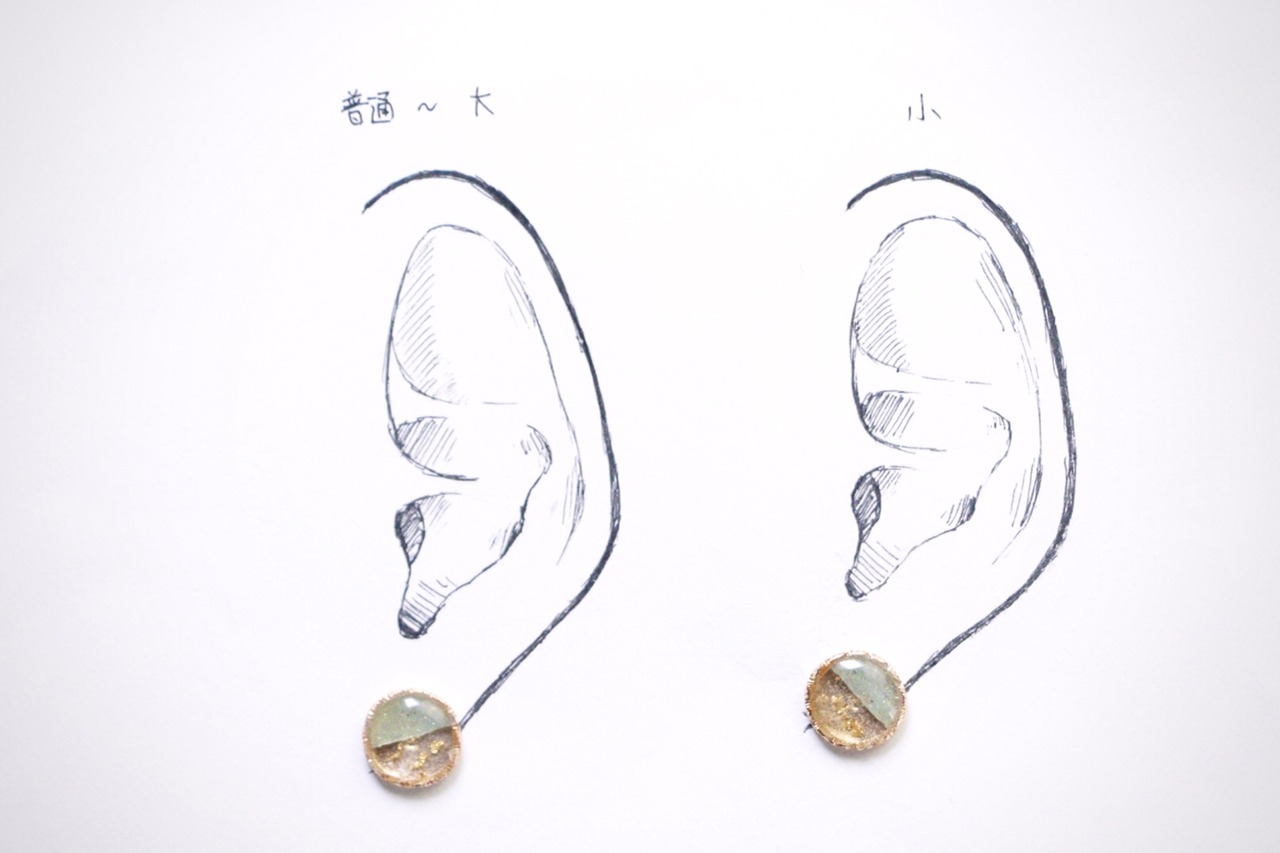 今回はピアスパーツの希望を取らせていただきます。メッセージ欄にてどちらかをご記入下さい。耳シートの写真通りであれば金箔は目立ちませんが、角度を自分で調節してアシンメトリーな楽しみ方が可能です。ゴールド部分をクリア部分から取って貼り付けた場合は、角度は変えられませんが他の写真通りの涼しげなデザインでお楽しみいただけます。