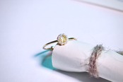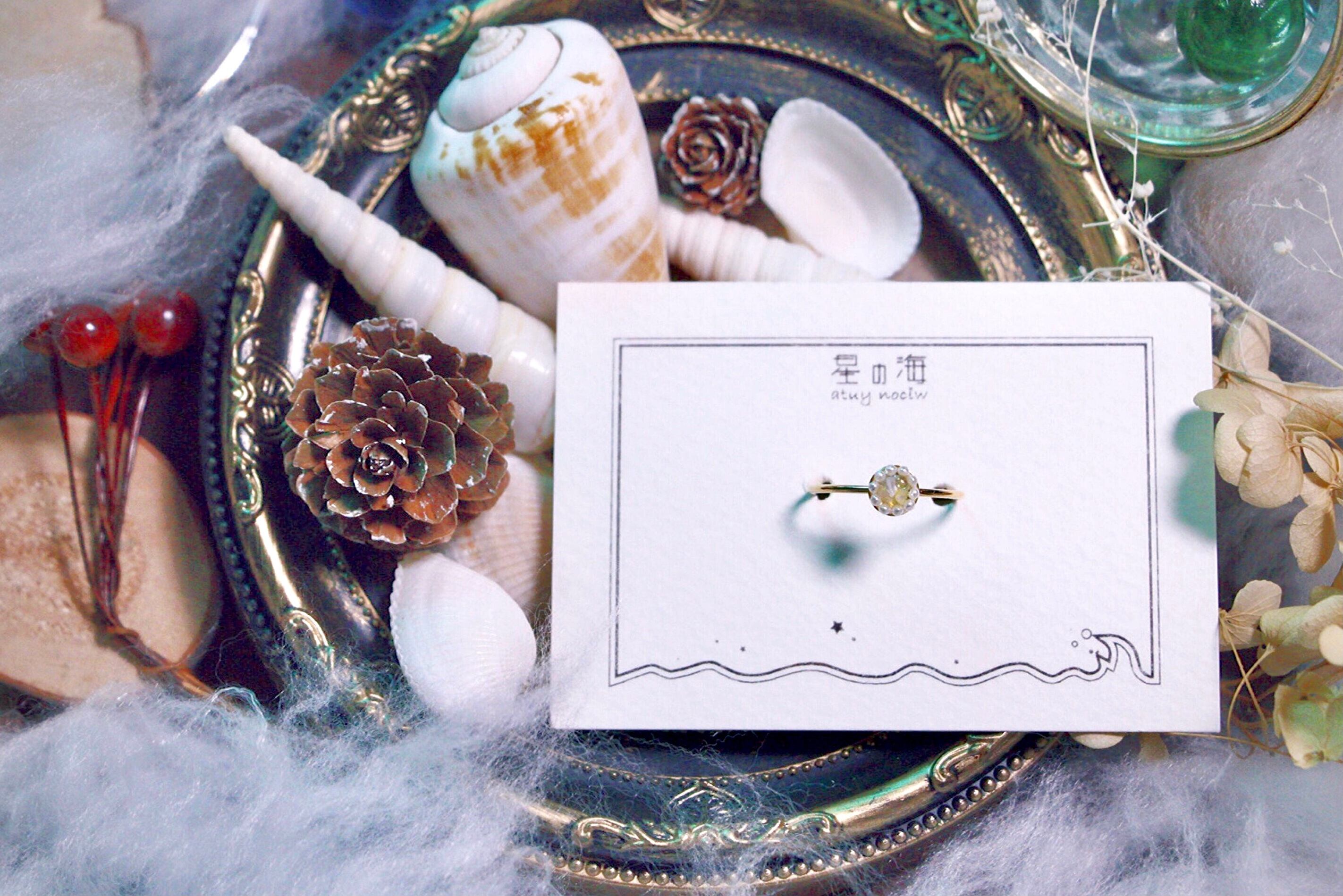 ゴールドの指輪のトップをミニパールでぐるりと囲い、中には黄緑と白のシェルをぎっしりに。一粒だけあしらったオーロラの雫がうるうるとしたハイライトを見せてくれます…