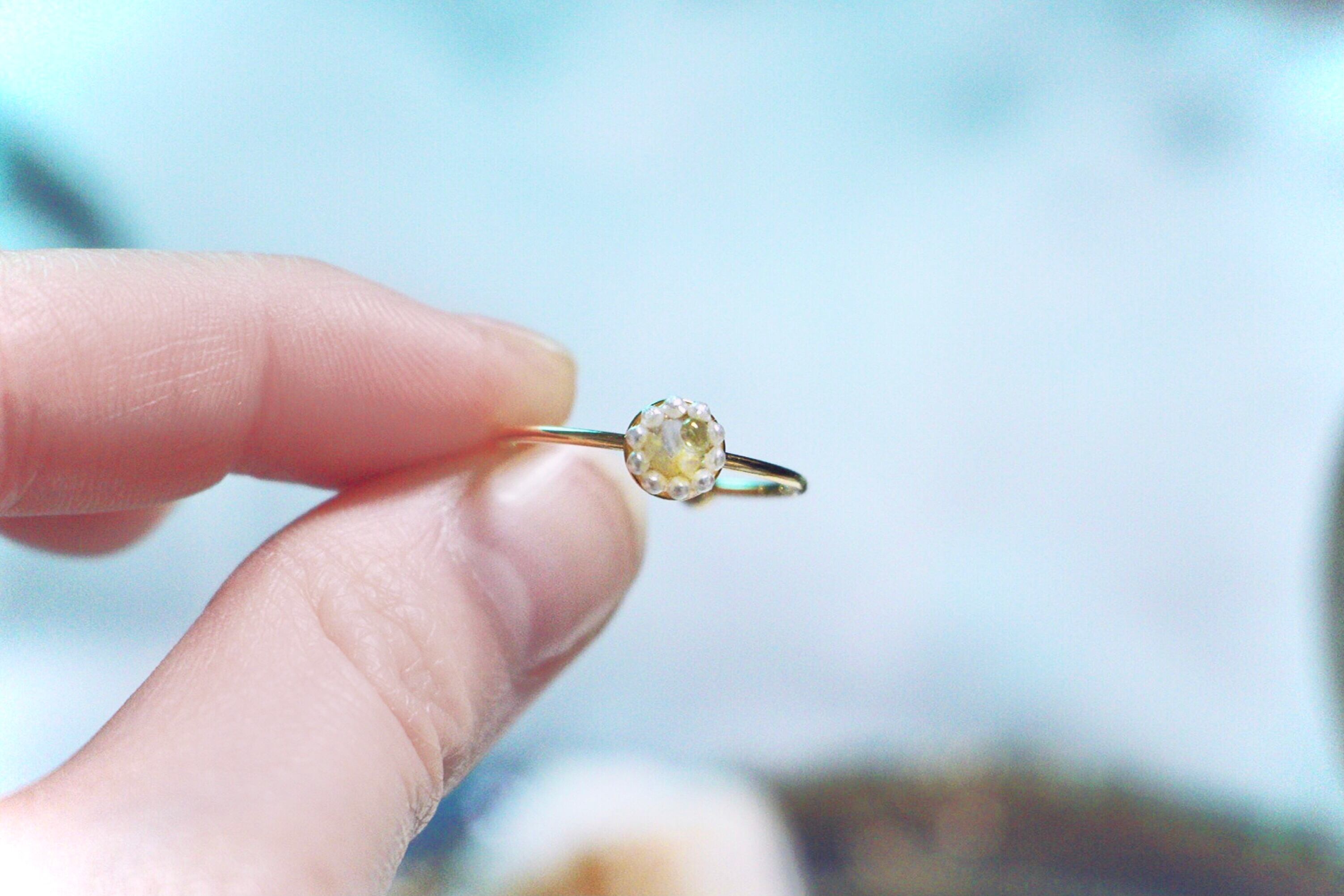 ハンドメイド アクセサリー レジン リング 指輪 重ね付け 華奢 細め 黄緑 アースカラー シャーベットカラー パフスリーブ パール オーロラ ネイル かわいい プレゼント ギフト 彼女 友達 恋人 綺麗 キラキラ トレンド