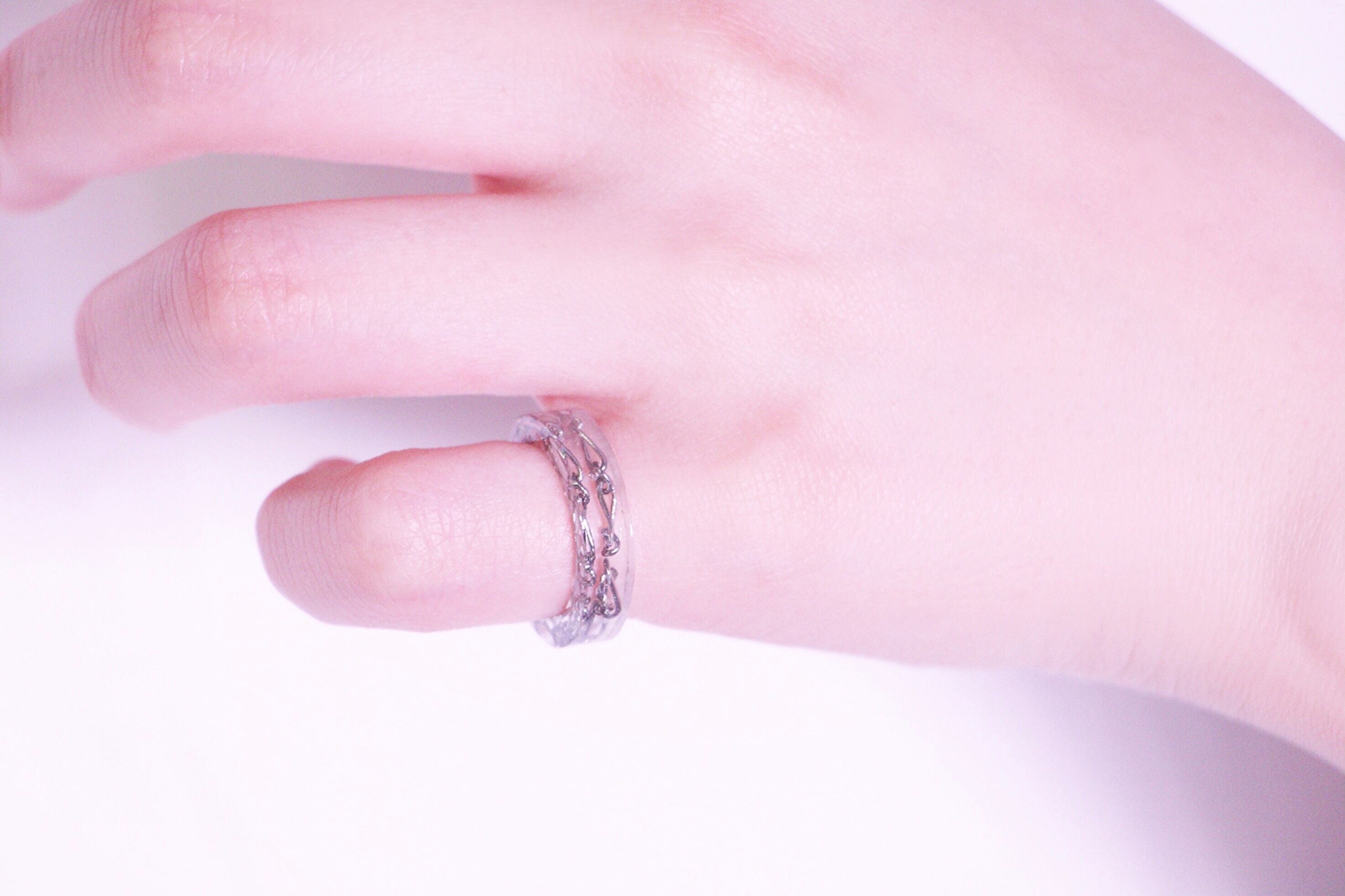 シルバーで華奢なデザインのフィガロチェーンを透明なリングの真ん中に2本閉じ込め、まるで指に直接巻き付いているような作品。
