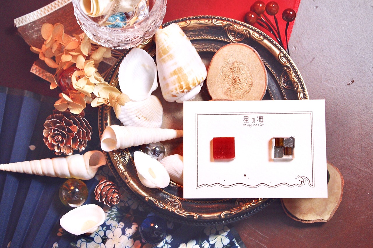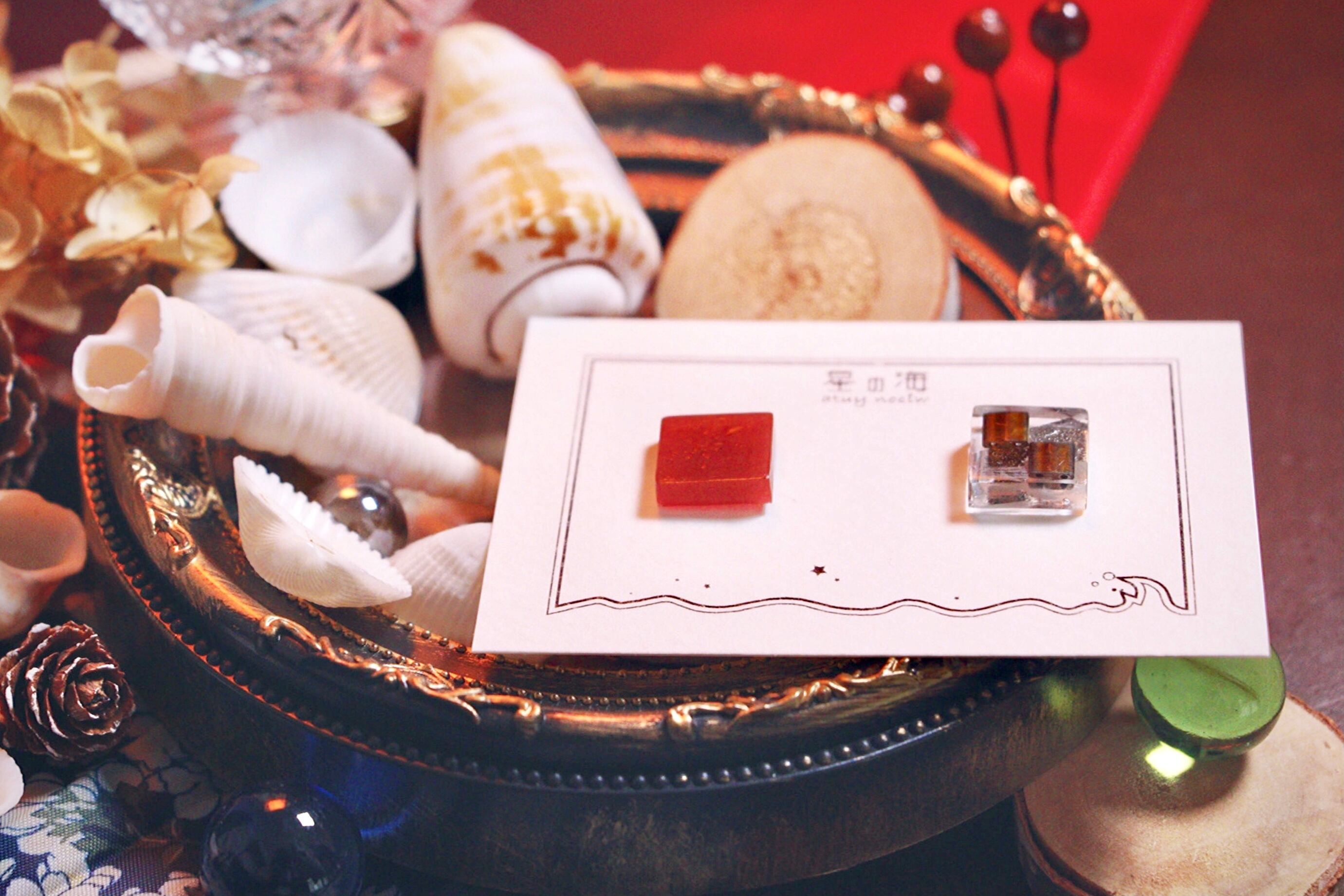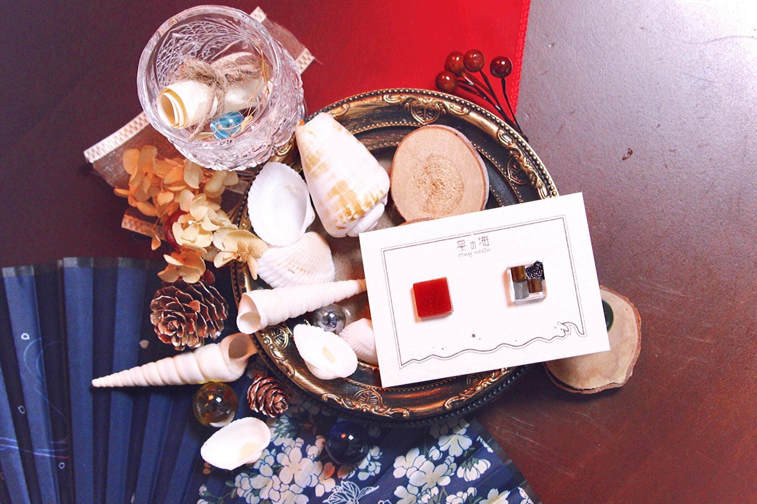 もう片方は底に割った本物の鏡を敷き、木のような不思議な質感の正方形のビーズをのせています。クリアな四角の中にひと回り小さな市松模様があるようなミステリアスデザインです…♡