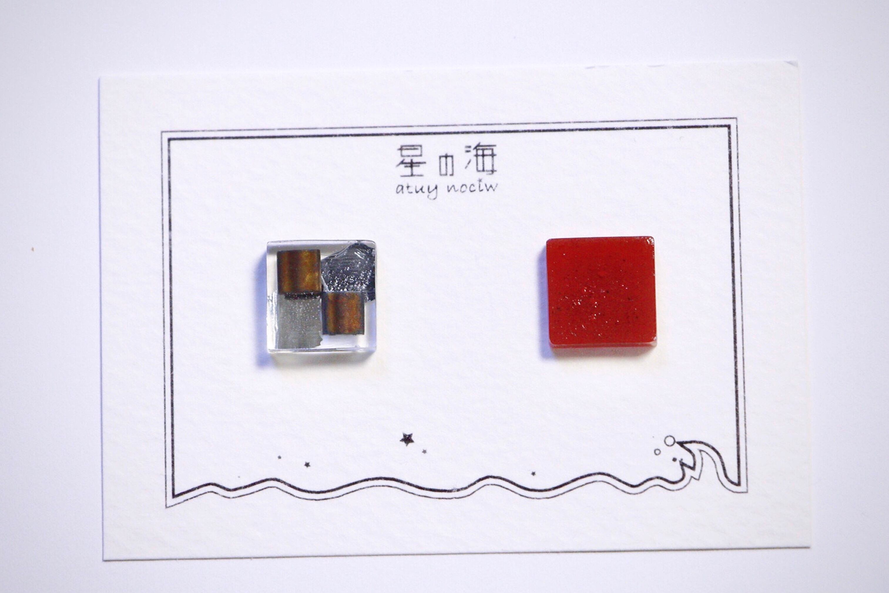 ハンドメイド アクセサリー ピアス イヤリング ノンホールピアス アシンメトリー アシメ ユニセックス 男女兼用 市松模様 チェス デザイン 鏡 ミラー 赤 差し色 ワンポイント アクセント 正方形 四角 和紙 和風 プレゼント ギフト