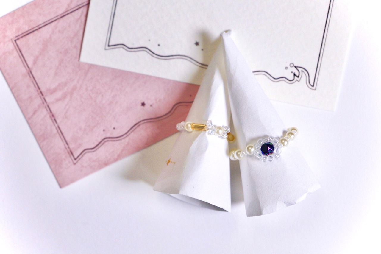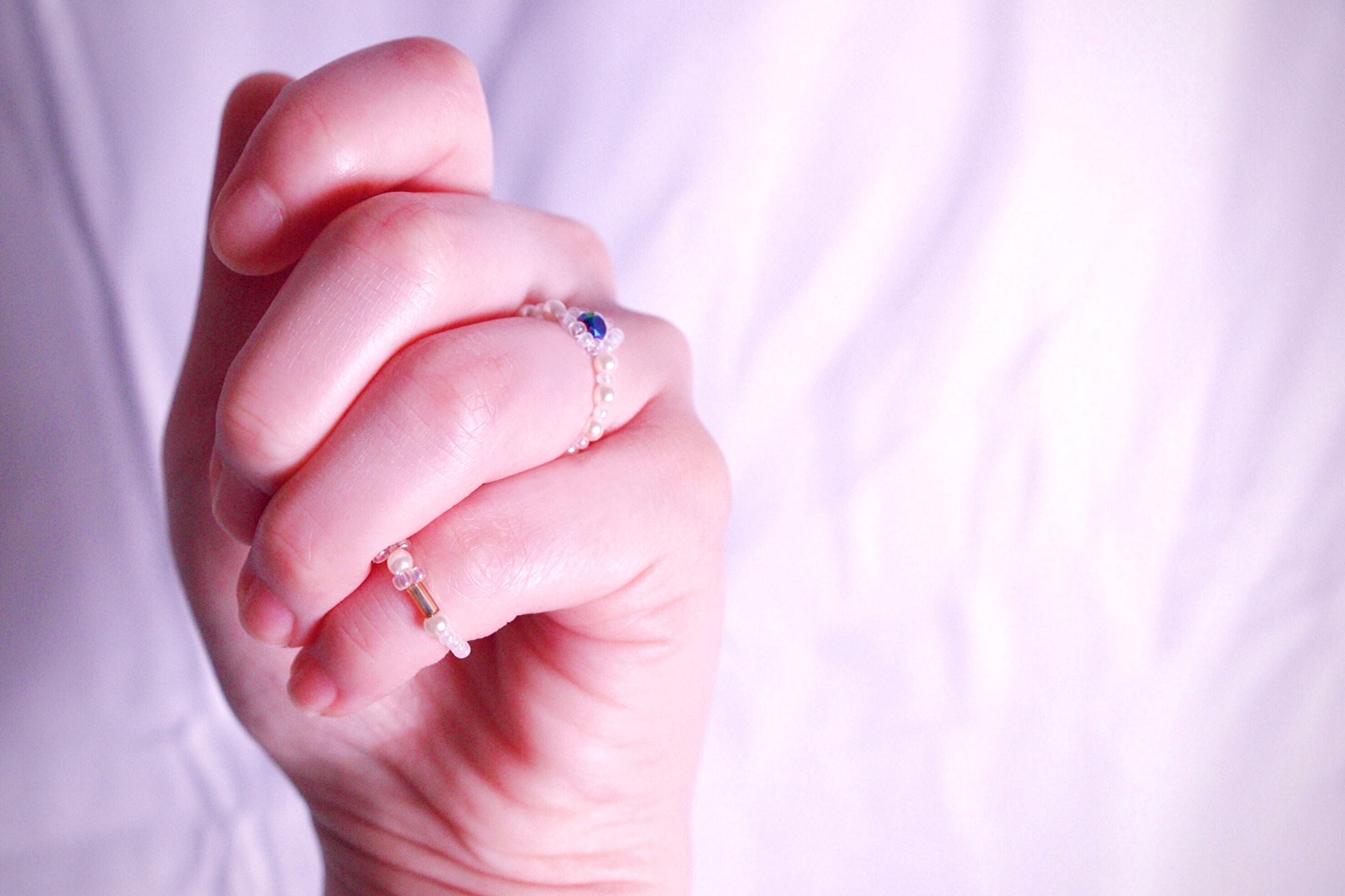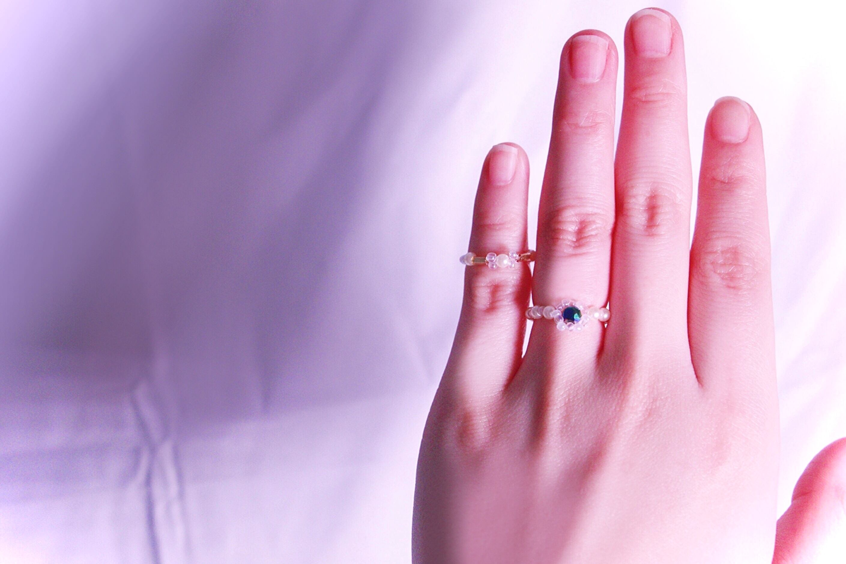 ひとつは青の偏光ビーズをトップに配置したちょっぴりミステリアスなリング。トップの周りはマットクリアのビーズと白いビーズを交互に。リング部分もパールと白いビーズを交互に配置しています!