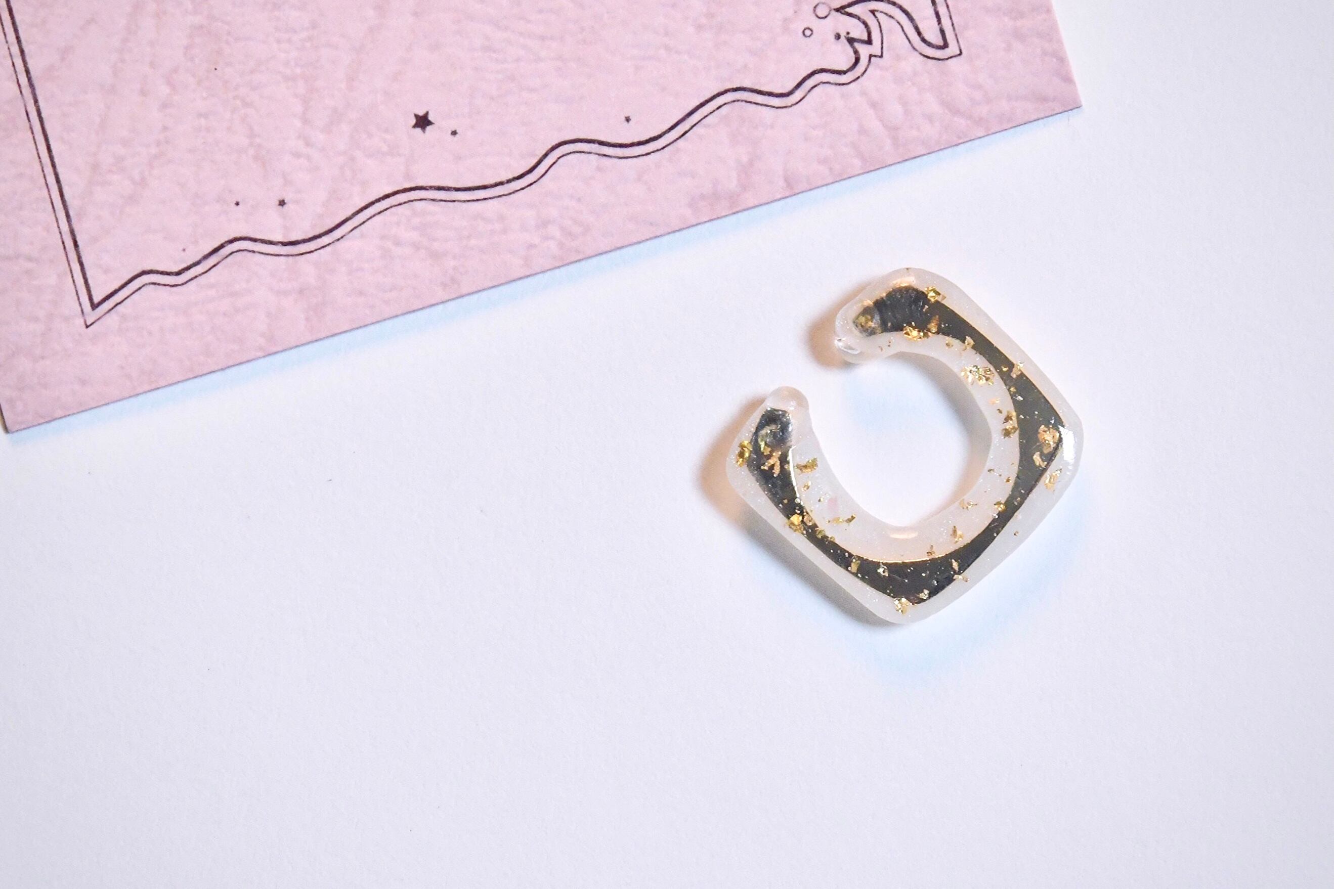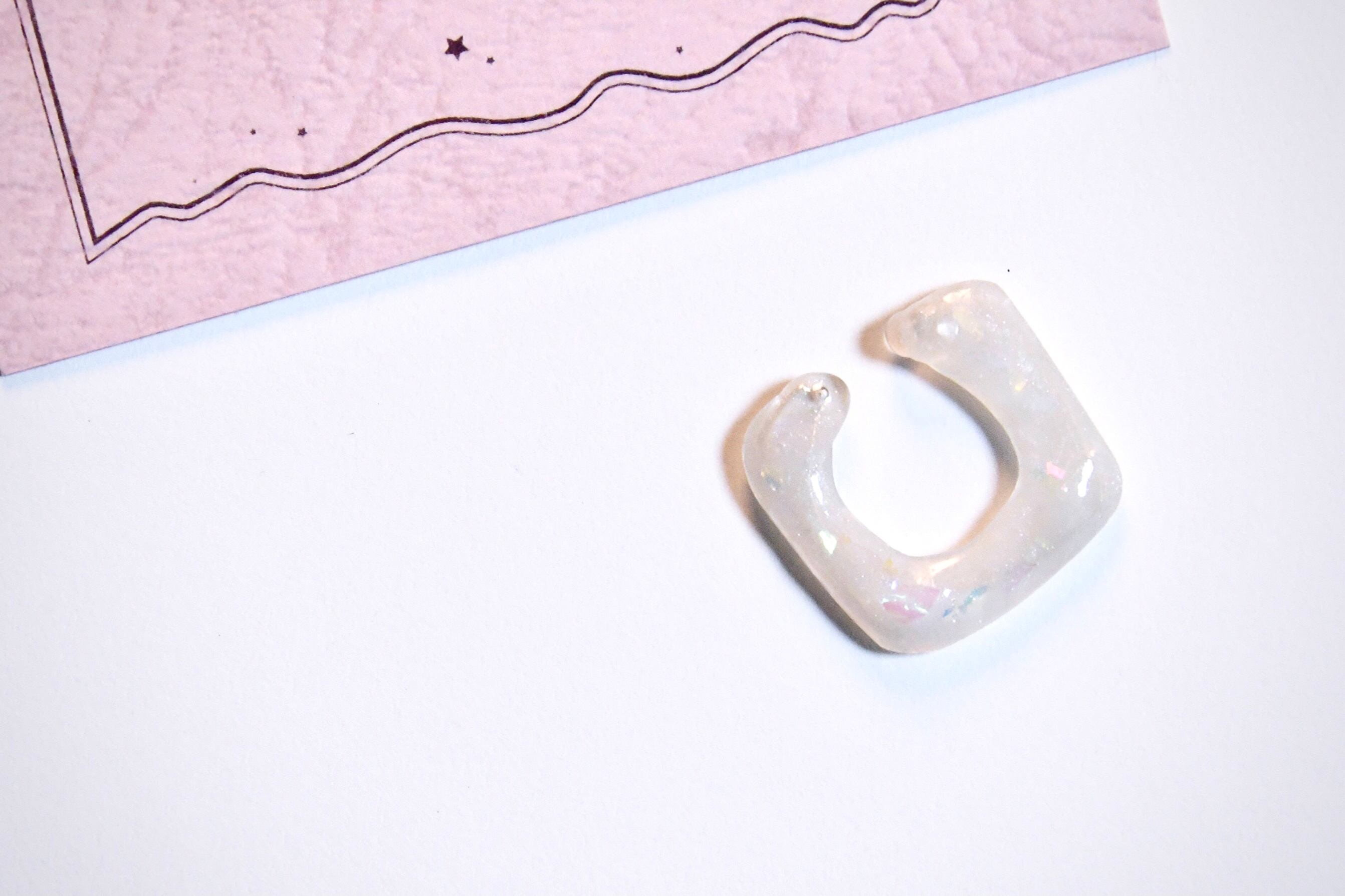 ハンドメイド アクセサリー イヤーカフ ガラス 風 ミルキー 白 ホワイト コーデ ファッション ゴールド 金箔 ラメ パール オーロラ フィルム ネイル いびつ キラキラ シンプル フリーサイズ クリア 四角 夏 夏服 水着 爽やか 涼しげ リバーシブル 表裏 大きめ 大ぶり 存在感 キラッキラ 大人っぽい 韓国系