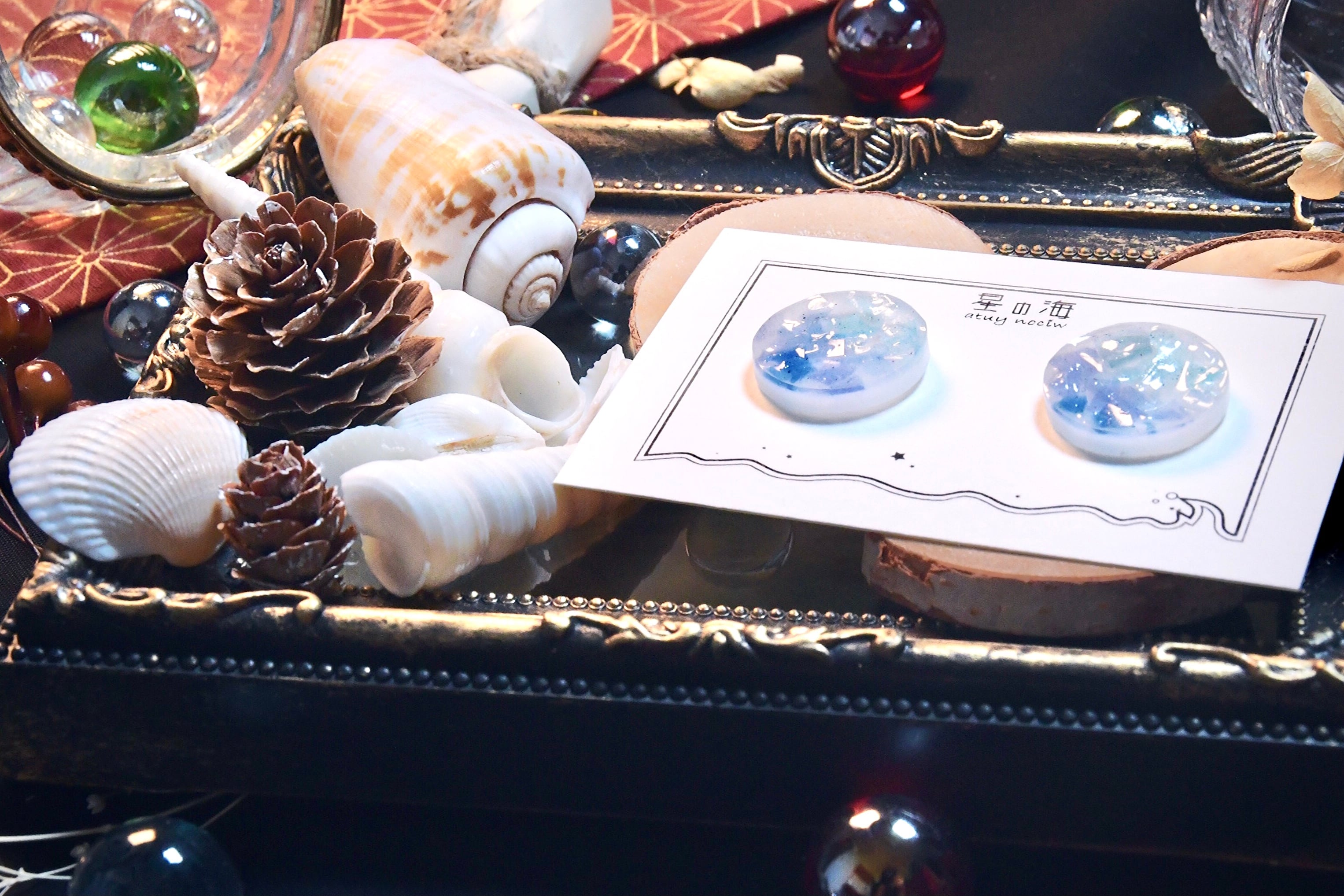 底にはパールラメを入れた白をほんの少しマーブル模様にして敷いて、その上にターコイズブルーやアイスブルー、スカイブルーなど様々な青色のレジンを砕き、グラデーションになるようにクリアの中に沈めました。