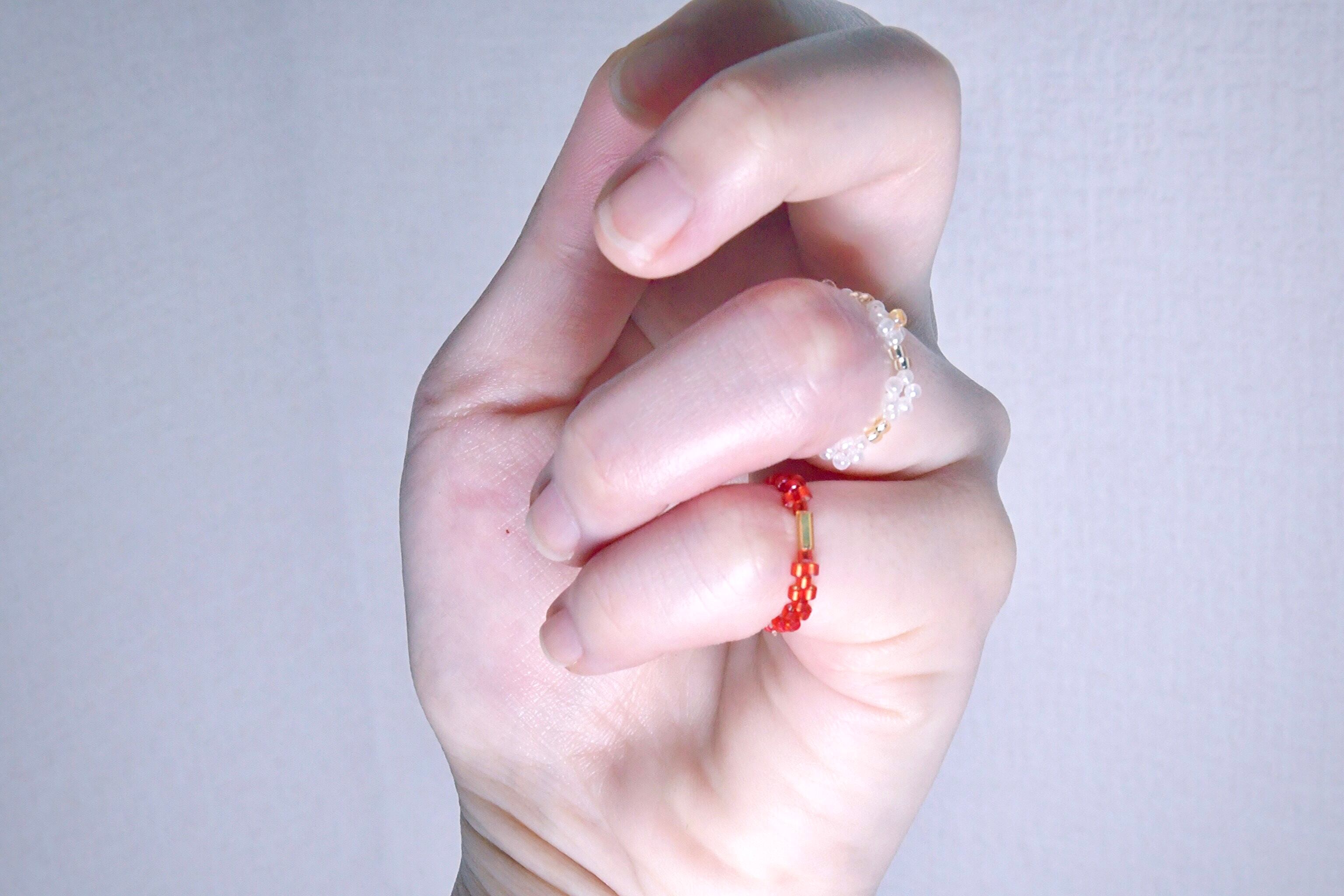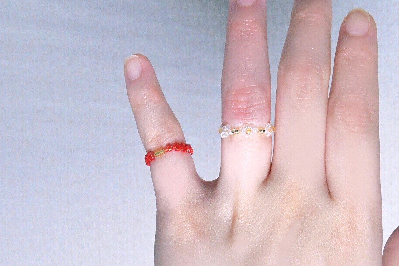 もう片方のリングは、フラワーリングと同じ赤いビーズを市松模様のようにして輪を作り、トップにゴールドの棒状ビーズを付けることでまるでリボンのようで大人可愛い雰囲気に♡前回の作品とは違い、向きを揃えることでちょっぴりかっちりとしたイメージに!