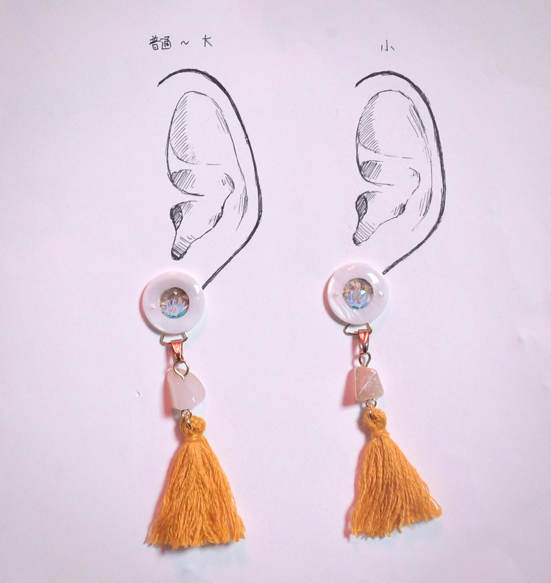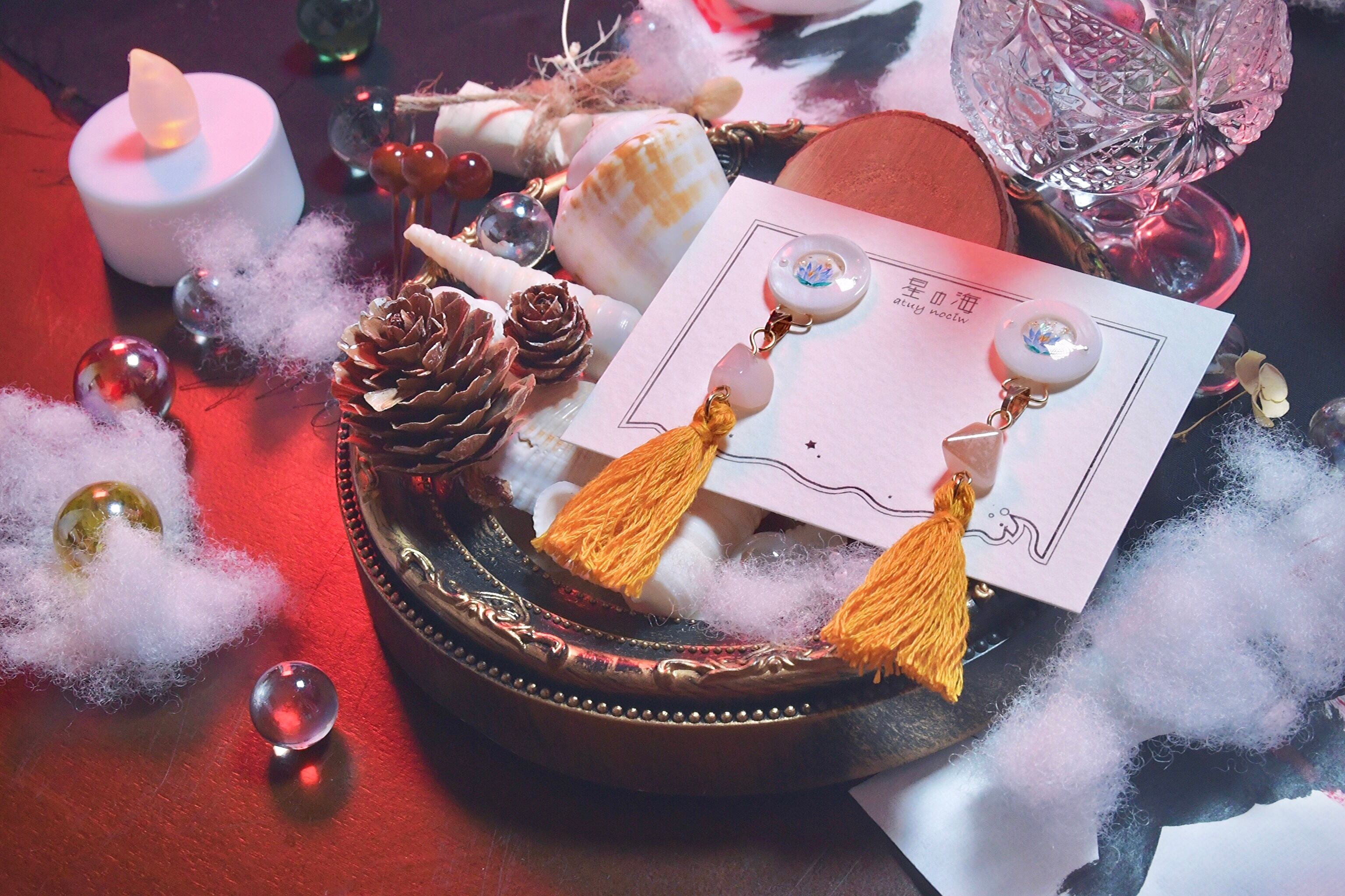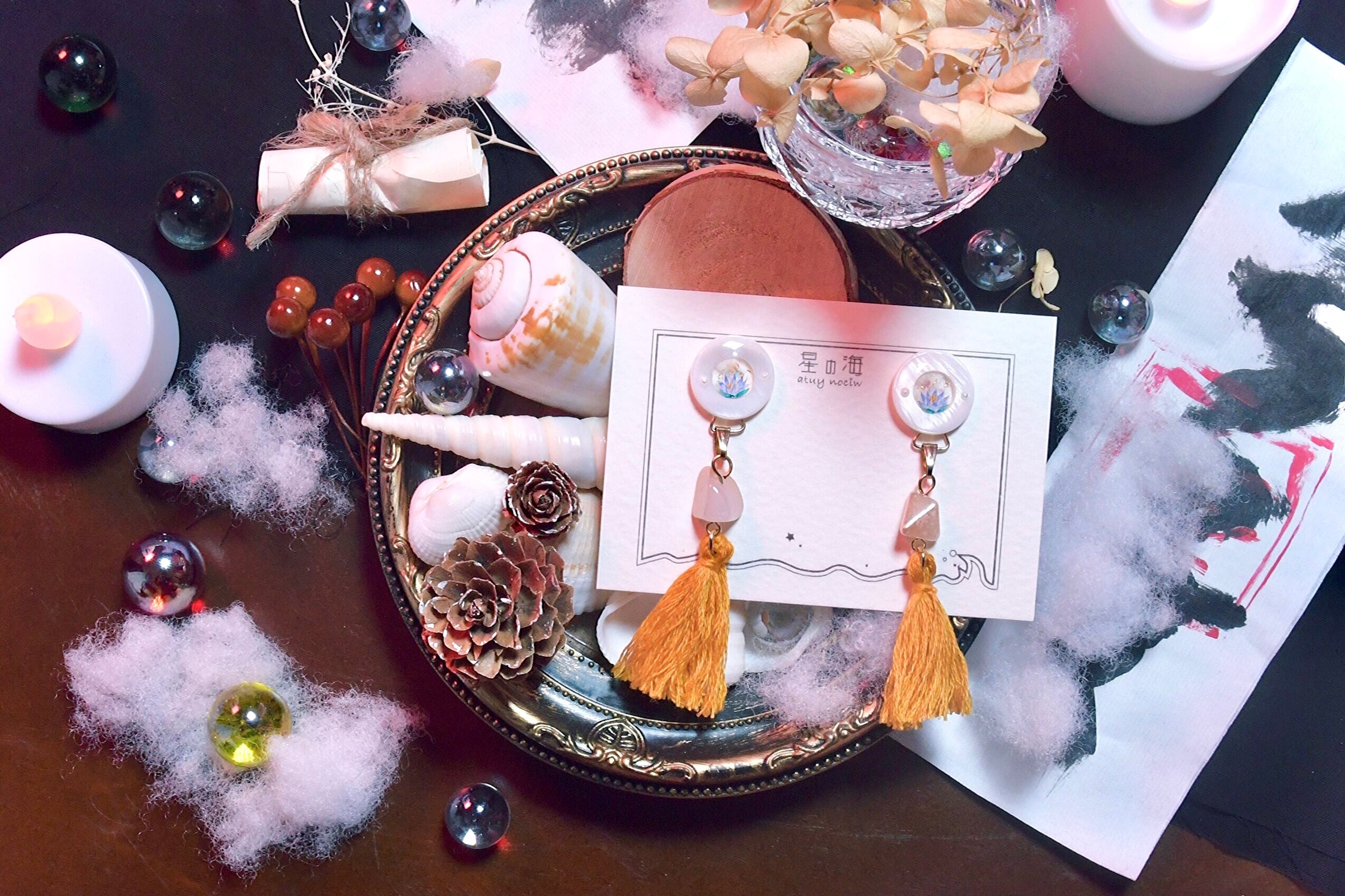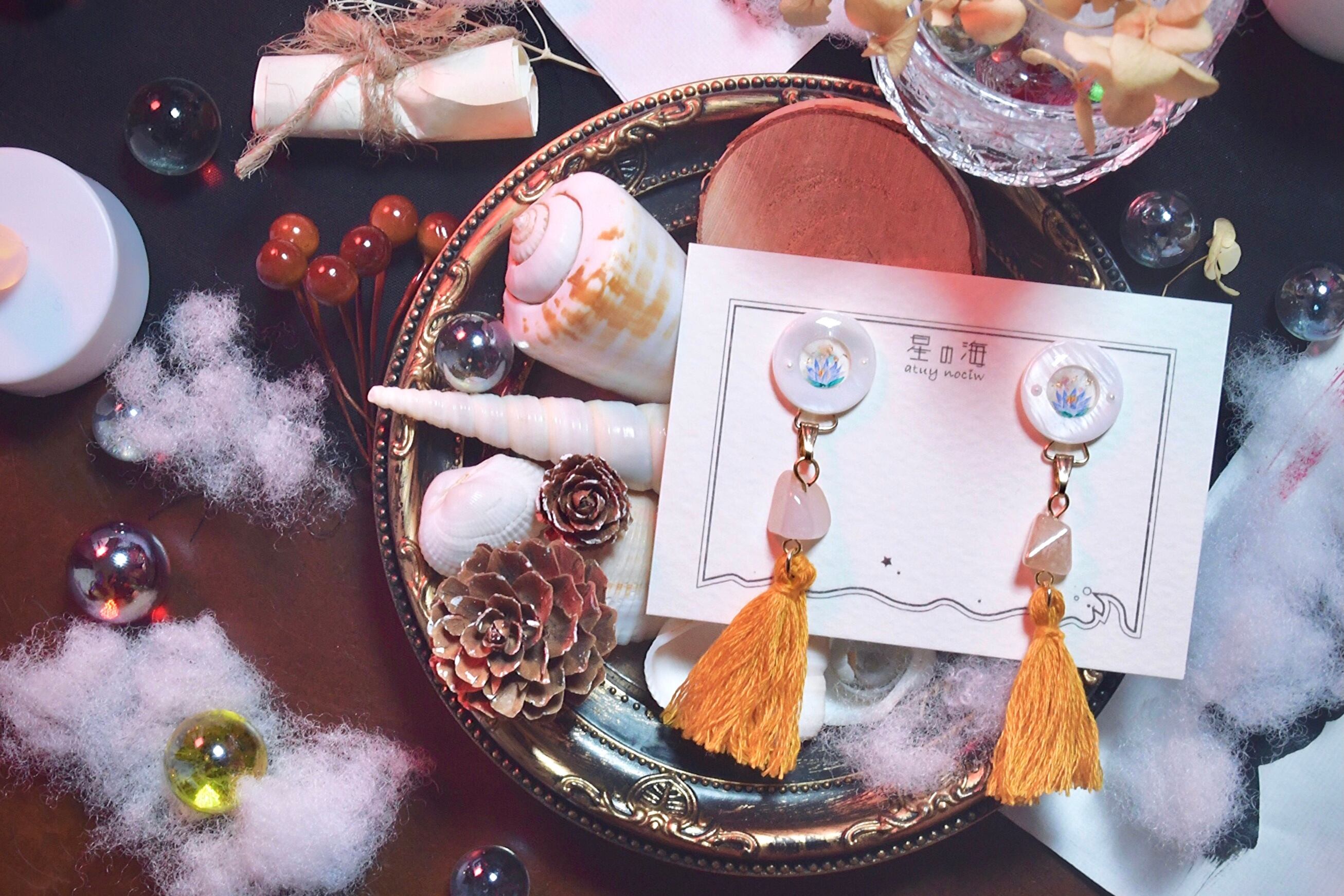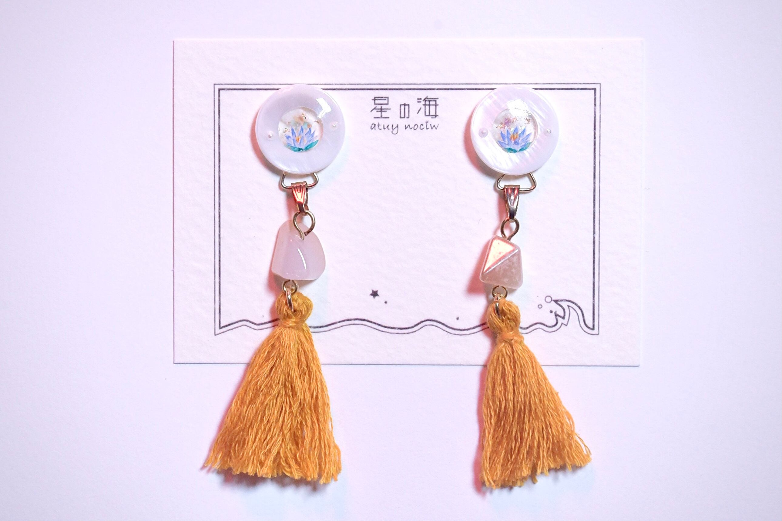 ハンドメイド アクセサリー ピアス イヤリング ロング 長め 水蓮 手描き タッセル イエロー コーデ ファッション シェル クリア オーロラ 和風 中華 チャイナ 服 個性的 かわいい きれい プレゼント ギフト
