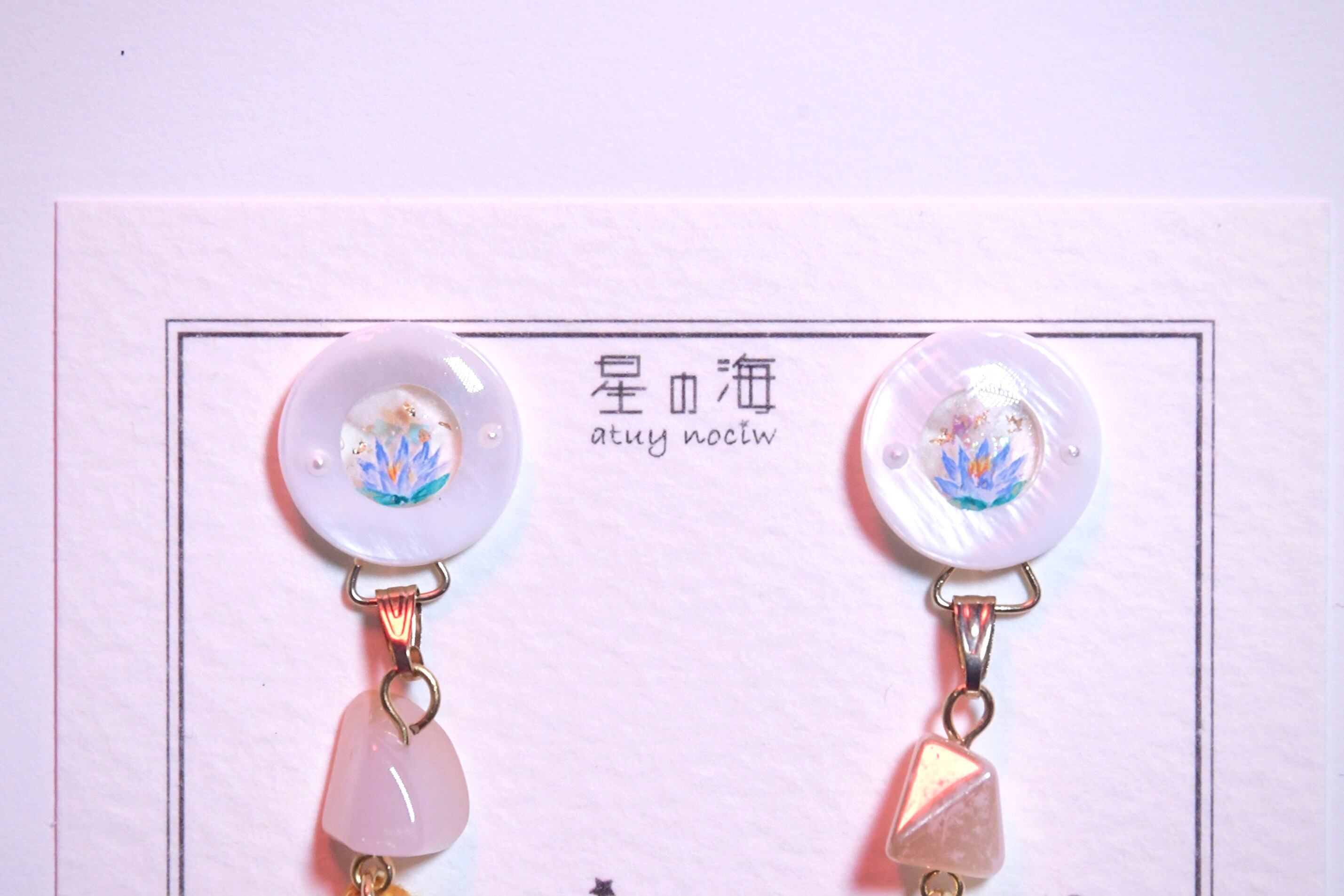 トップは穴の空いたシェルを使用。中にはオーロラフィルムと金箔を入れ、青い水蓮を描きました。左右にはミニパールをはめ込んでまとまりのあるデザインに。