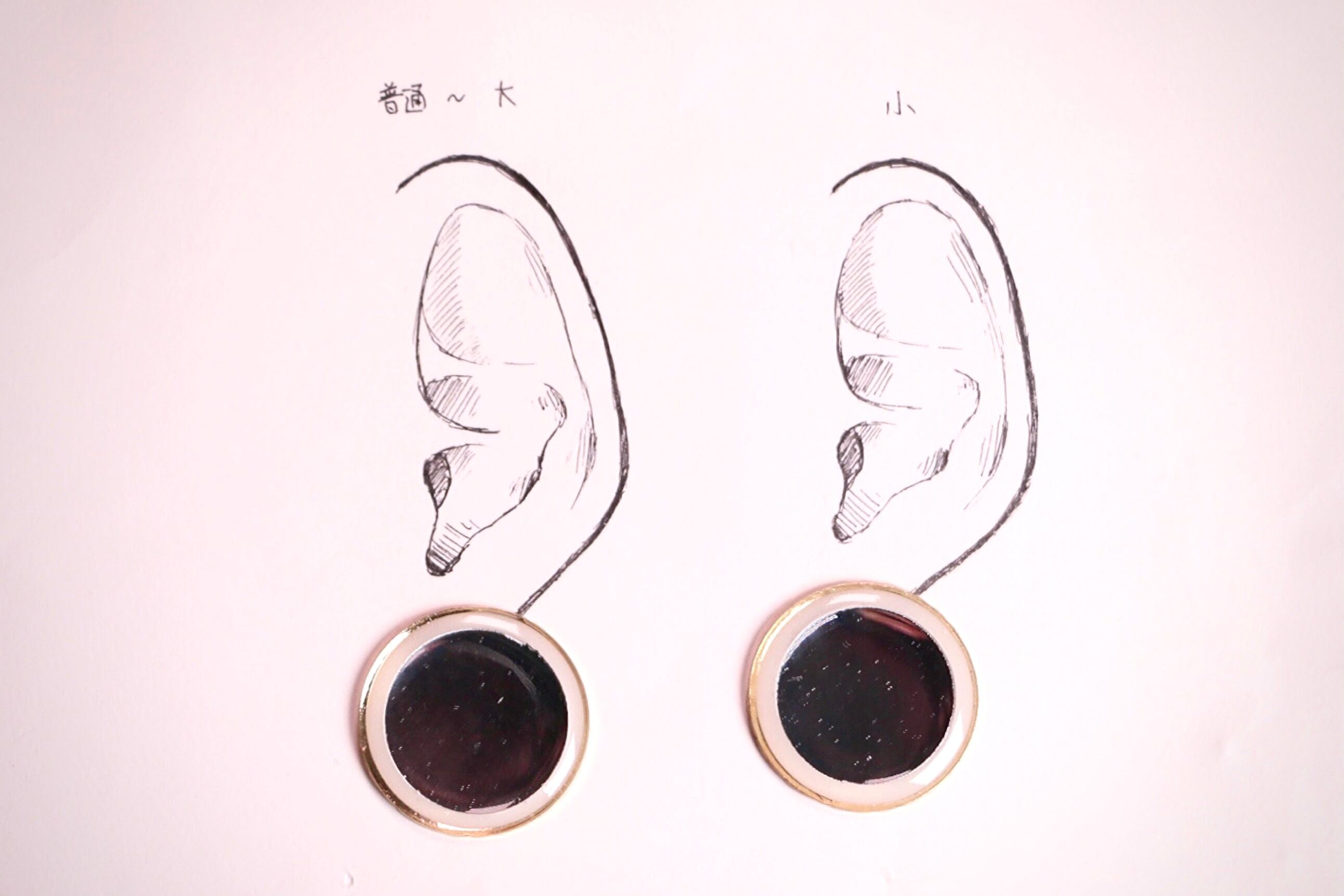 耳につけるパーツをつけていないため、台紙にはマスキングテープで留めている状態です。耳シートの左は平均的な女性の普通〜大きめの耳、右は小さめの耳のモデルとなっております。ご参照ください。