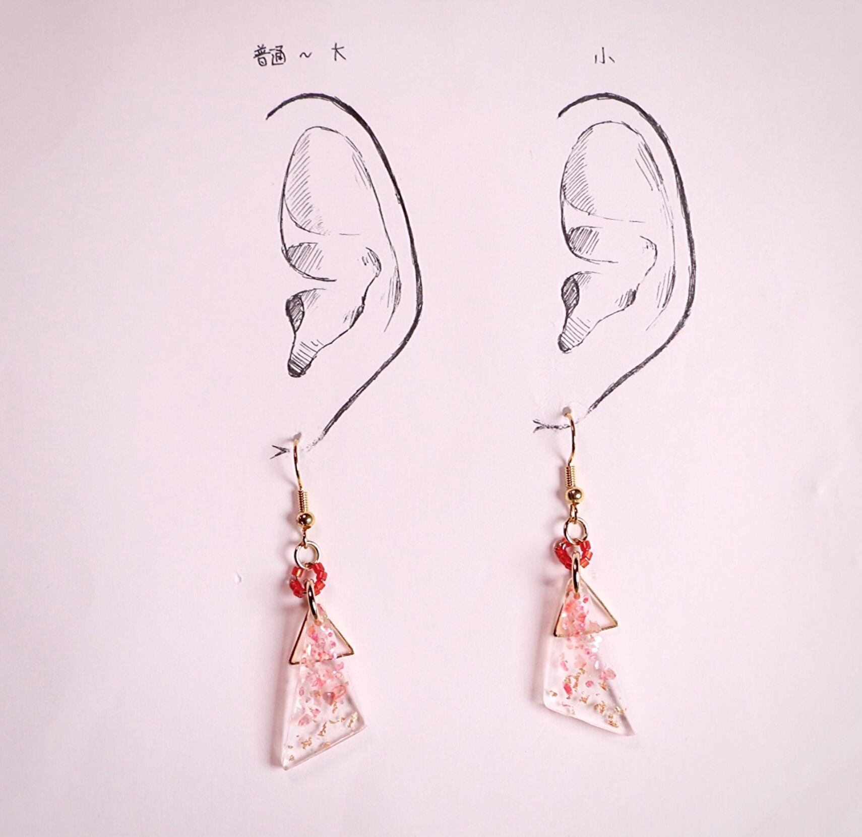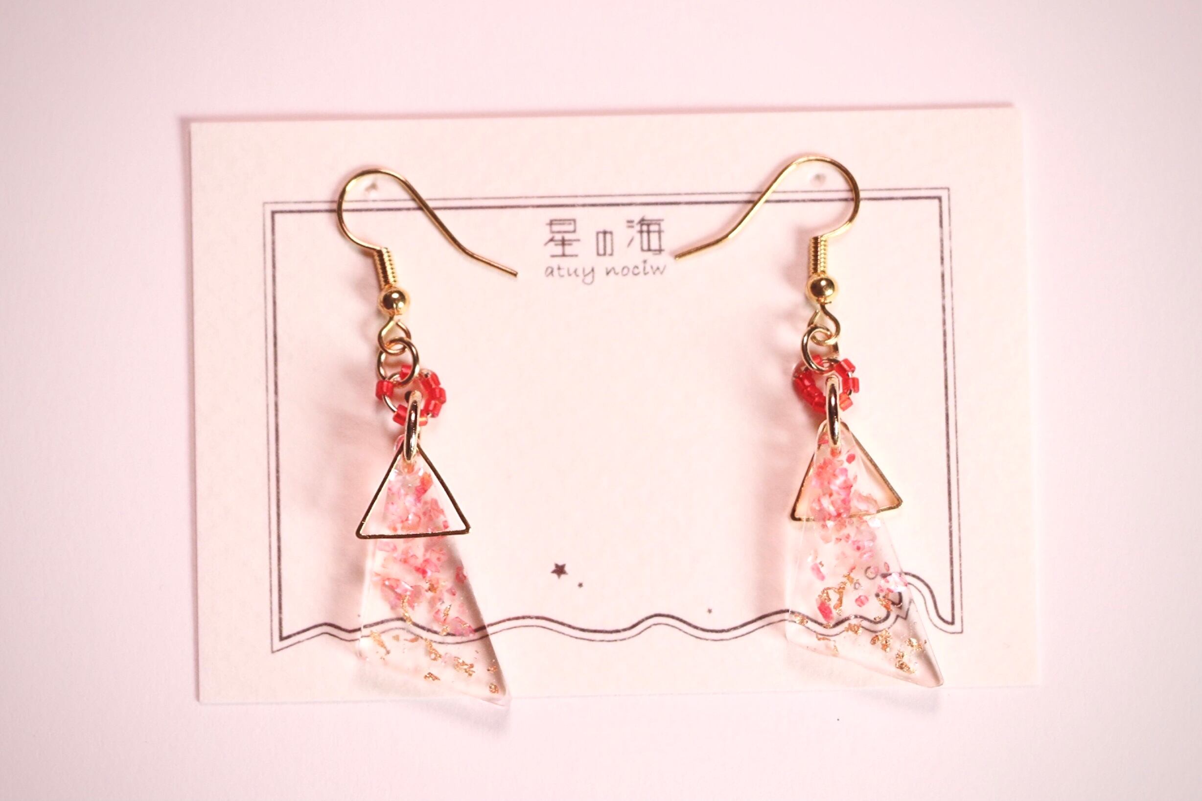 ハンドメイド アクセサリー ピアス イヤリング ゆれる ゆらゆら 揺れる ゴールド 赤 紅 朱 ピンク オレンジ 金 秋色 秋 寒い ファッション コーディネート 三角 ビーズ 浴衣 高見え シェル キラキラ 春 服