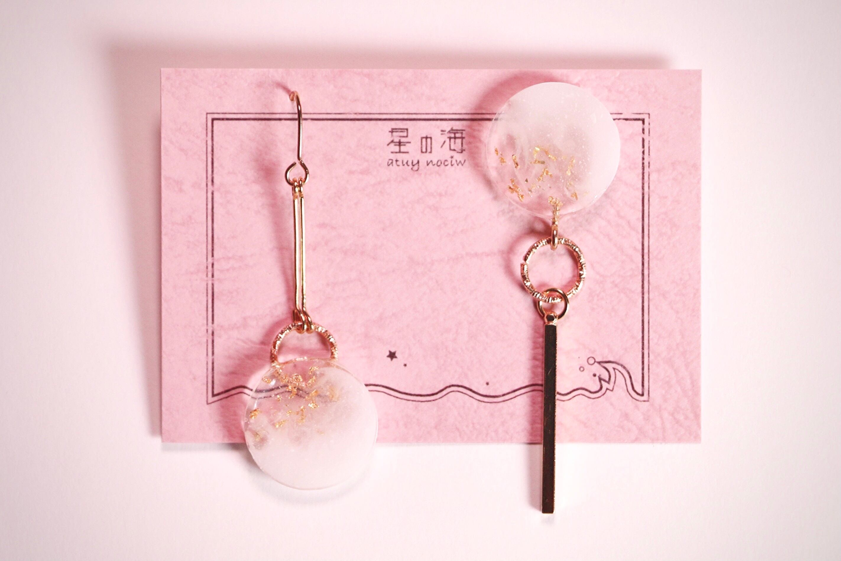 ハンドメイド アクセサリー ピアス イヤリング クリア 白 キラキラ 金箔 ゴールド 金 きれいめカジュアル きれいめ コーデ ファッション 大人っぽい 韓国 綺麗 揺れる ゆれる 大ぶり ゴツめ 存在感 かっこいい キリッとした 冬 年中使える ホワイト アシメ プレゼント ギフト