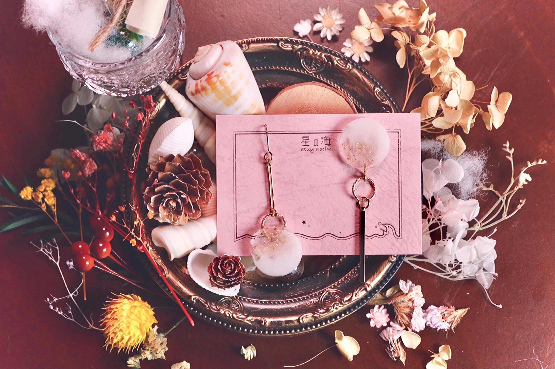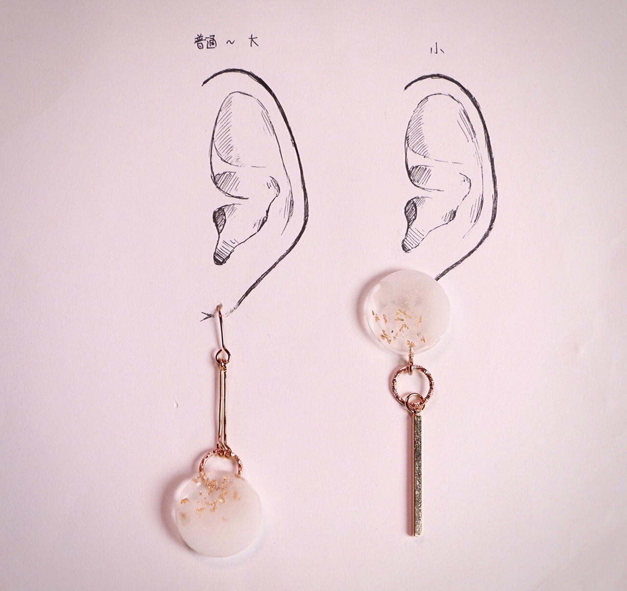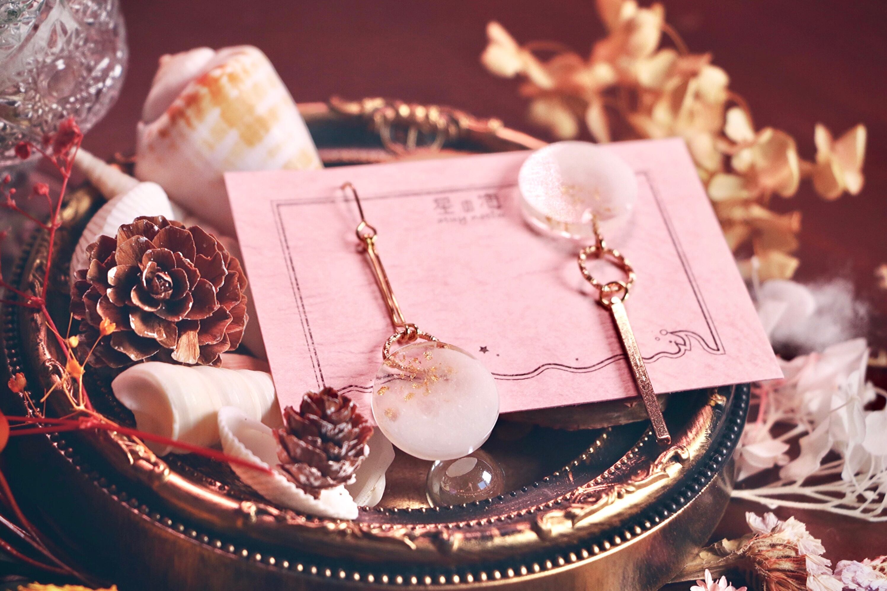 両方についている大きな丸の中には白とクリアをマーブルにした層を何層も重ねて深みを持たせ、クリア部分にだけ金箔を散らしています。