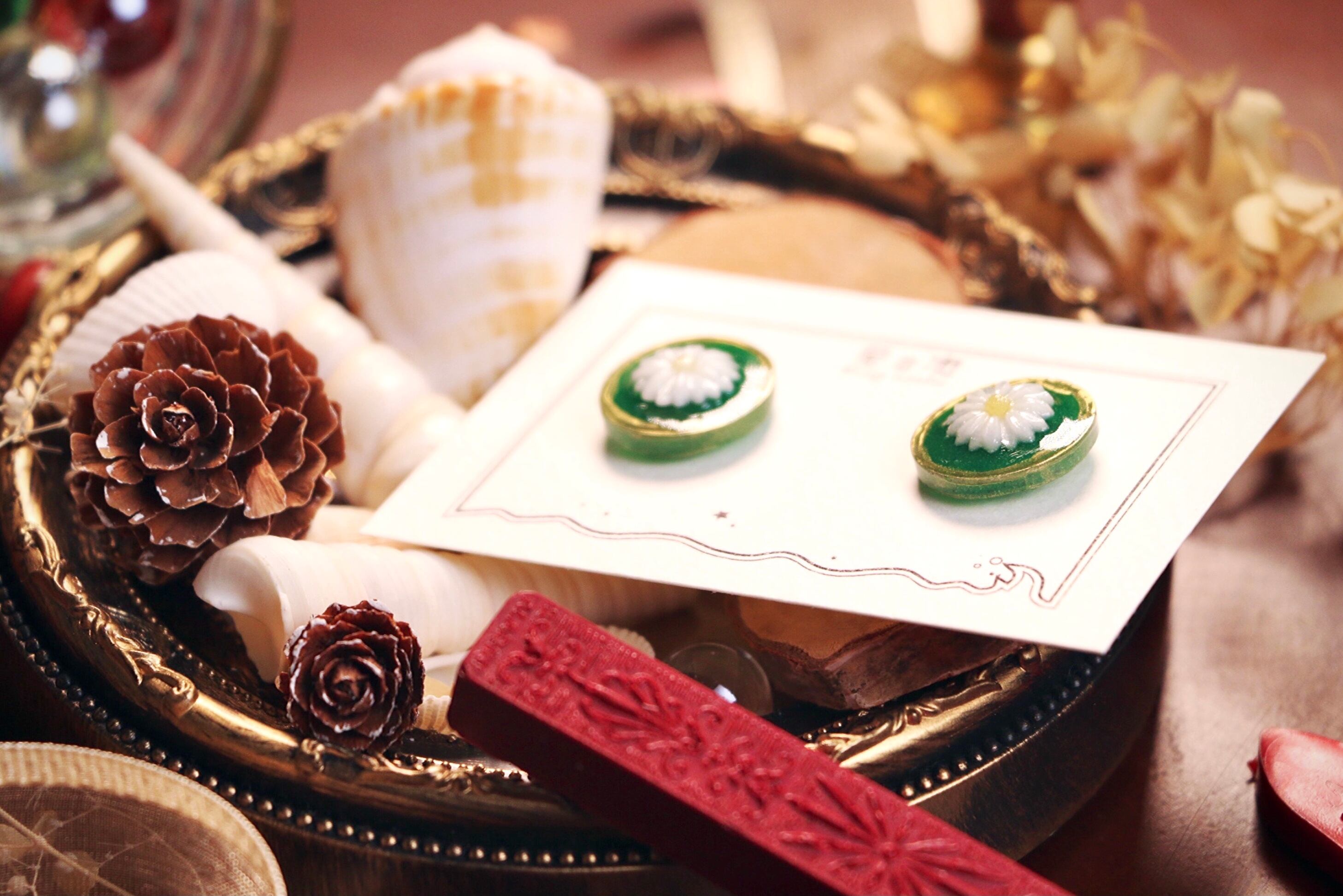 ハンドメイド アクセサリー ピアス イヤリング ノンホールピアス 厚め 重厚感 高級感 高見え レトロ アンティーク 風 ボタン マーガレット 花 お花 金 ゴールド フチあり 白 秋 ファッション コーディネート 洋服 お洒落 おしゃれ プレゼント ギフト 韓国 大人っぽい 緑 深緑 鮮やか