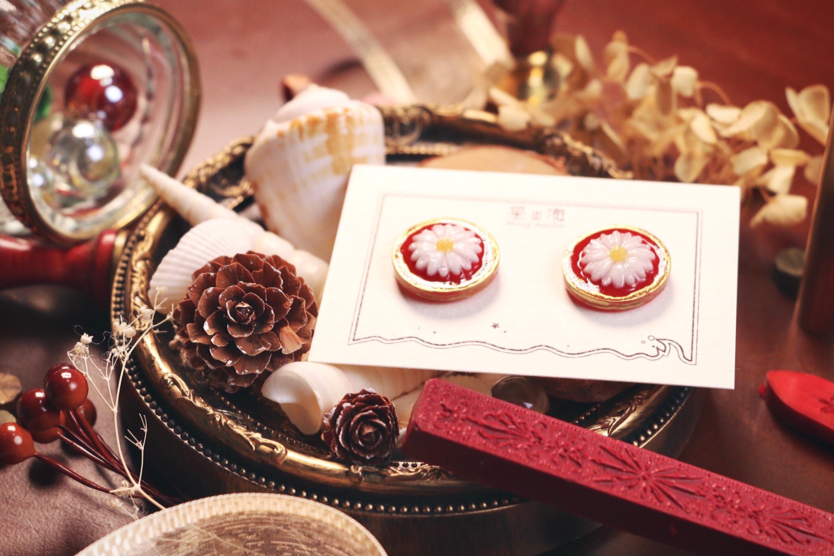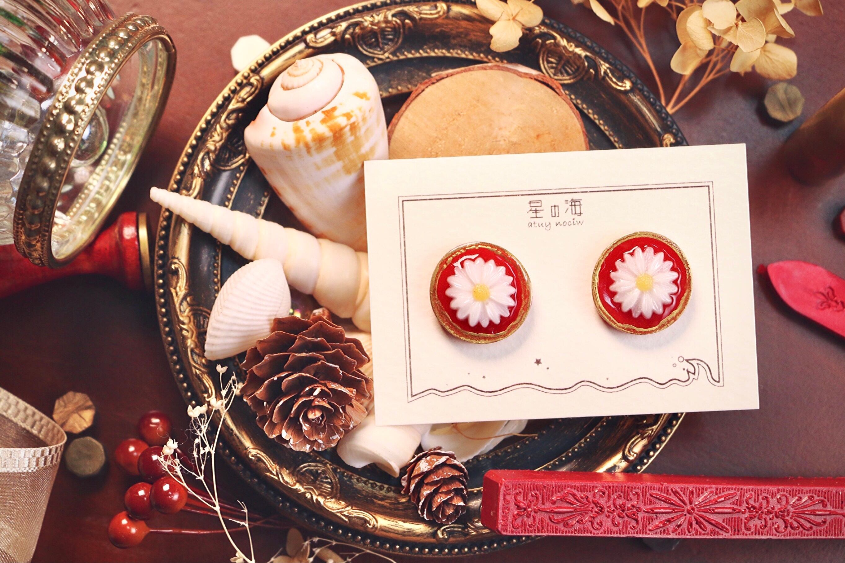 ハンドメイド アクセサリー ピアス イヤリング ノンホールピアス 厚め 重厚感 高級感 高見え レトロ アンティーク 風 ボタン マーガレット 花 お花 金 ゴールド フチあり 白 秋 ファッション コーディネート 洋服 お洒落 おしゃれ プレゼント ギフト 韓国 大人っぽい 赤 ワインレッド