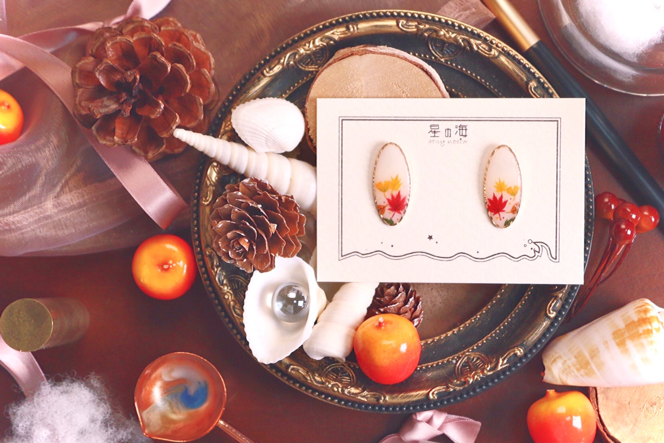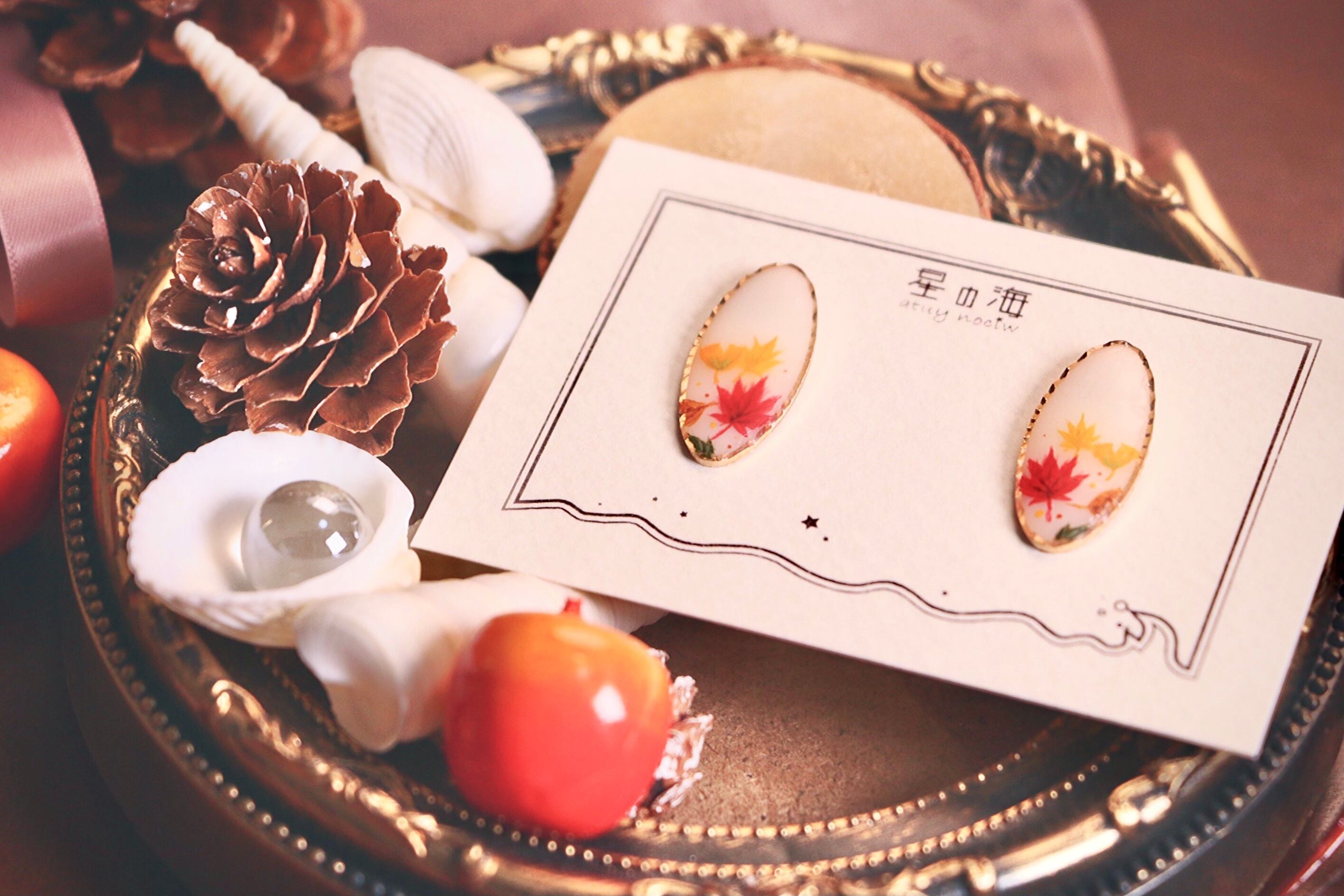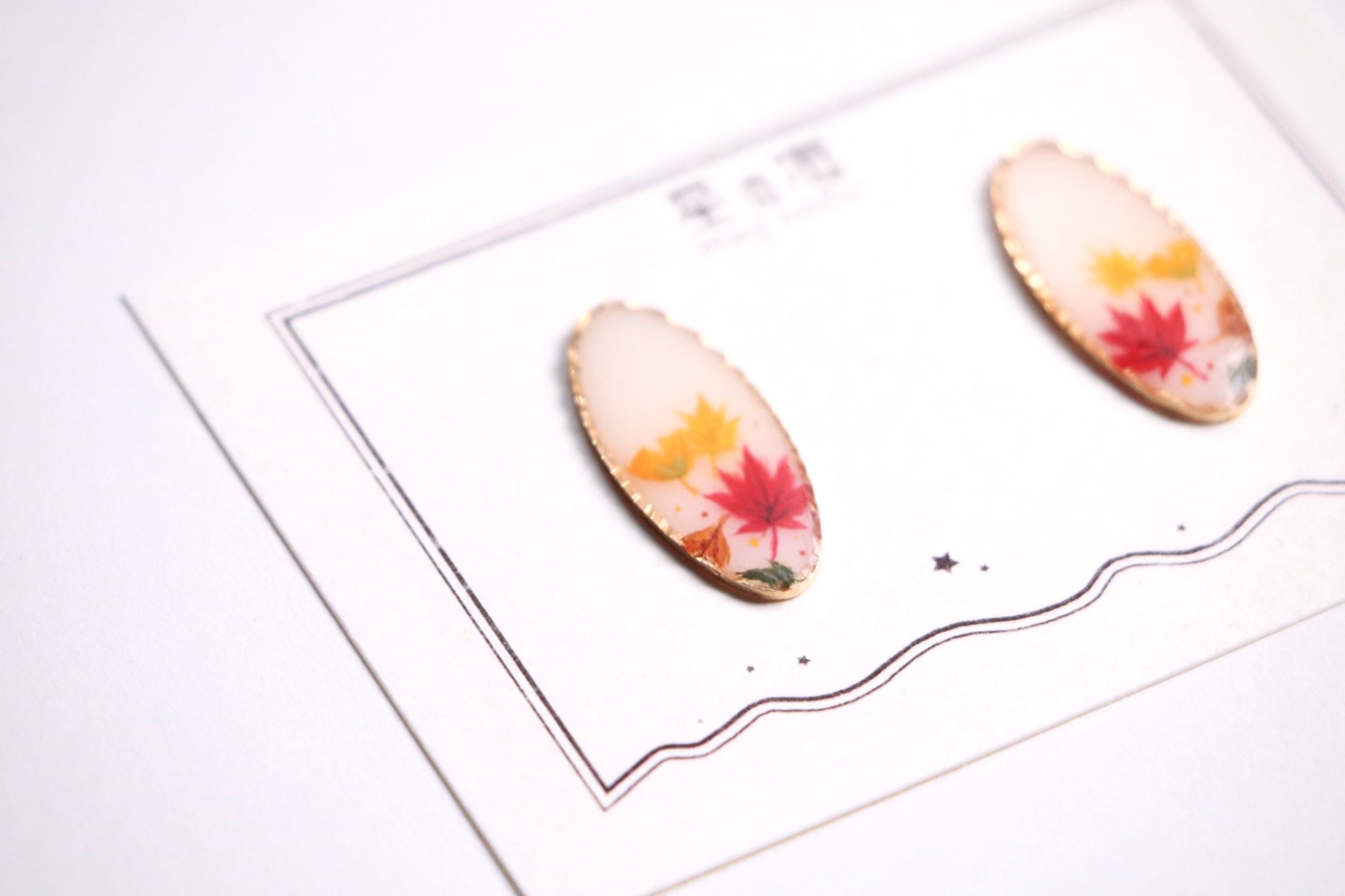 ハンドメイド アクセサリー ピアス イヤリング ノンホールピアス ピンクゴールド オーバル 紅葉 イチョウ 落ち葉 秋 ファッション コーディネート 手描き 絵付け かわいい きれい 大人っぽい きれいめ コート