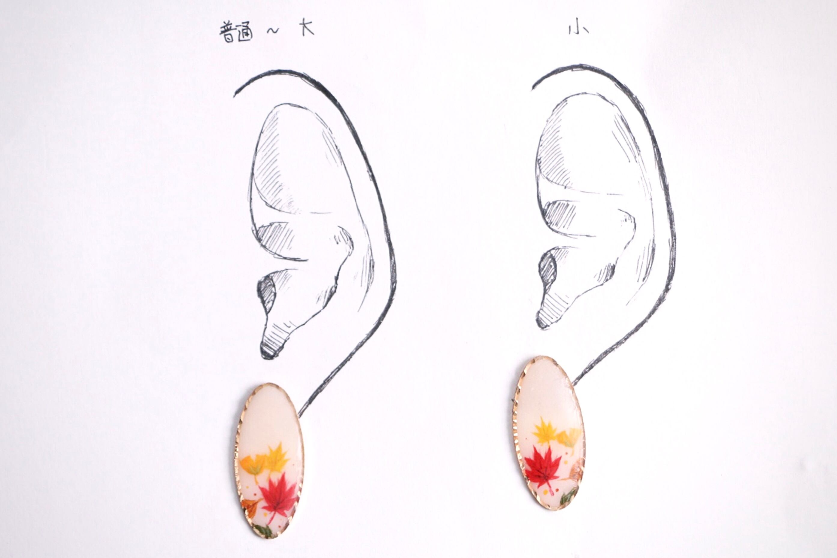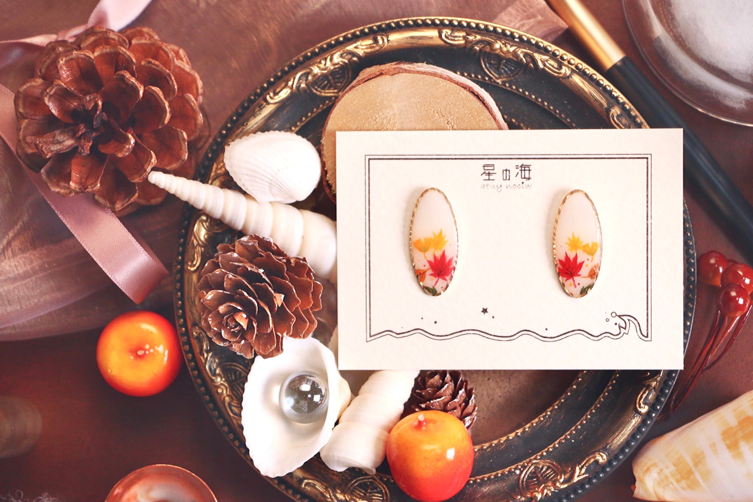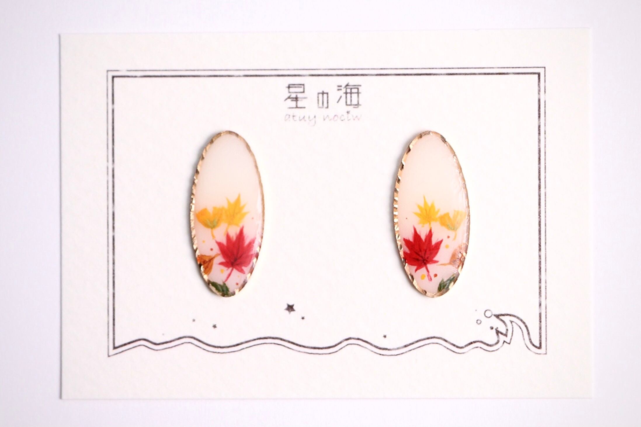 ハンドメイド アクセサリー ピアス イヤリング ノンホールピアス ピンクゴールド オーバル 紅葉 イチョウ 落ち葉 秋 ファッション コーディネート 手描き 絵付け かわいい きれい 大人っぽい きれいめ コート