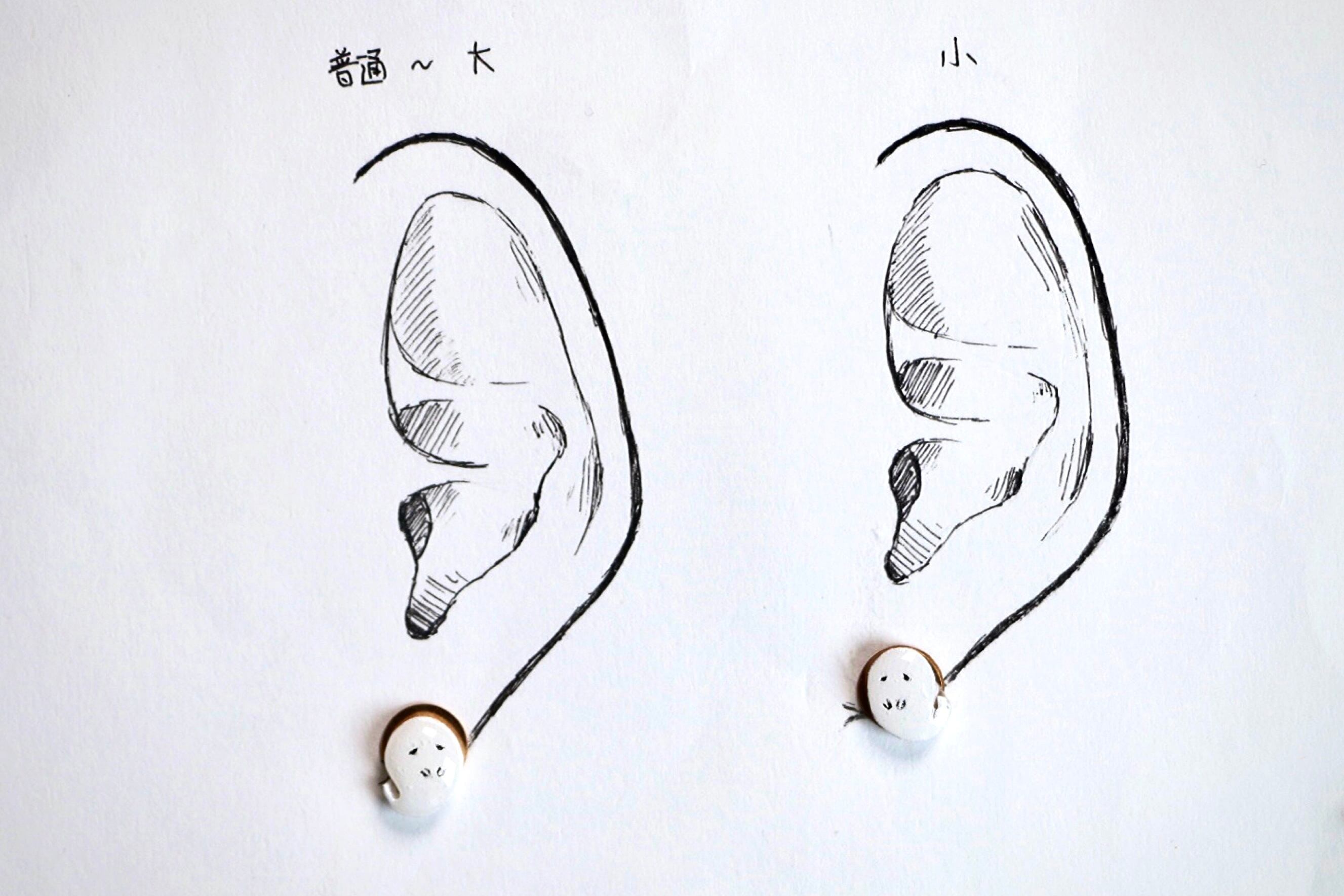 耳につけるパーツをつけていないため、台紙にはマスキングテープで留めている状態です。耳シートの左は平均的な女性の普通〜大きめの耳、右は小さめの耳のモデルとなっております。ご参照ください。